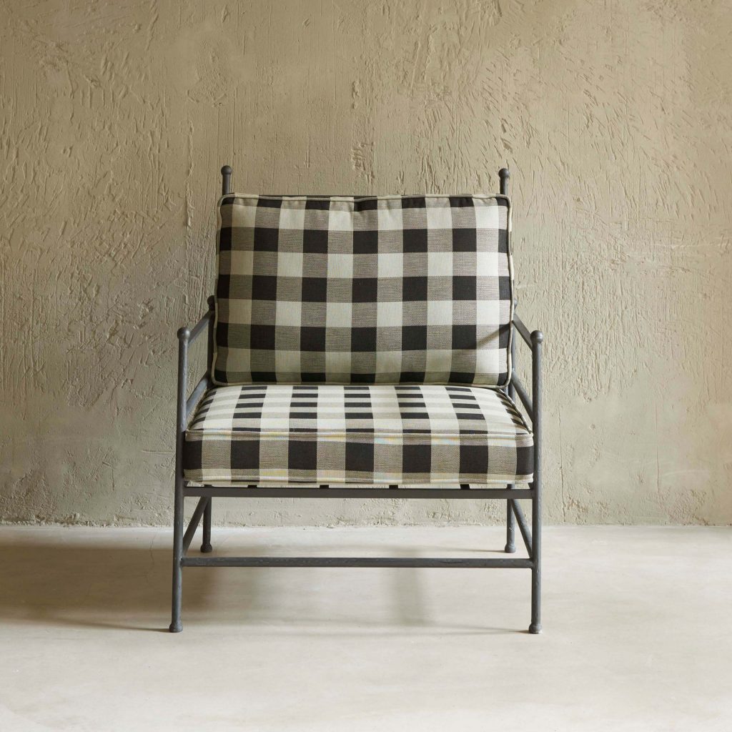 Butaca Santoña de exterior de forja con colchoneta y respaldo de cuadros. Es una pieza de mobiliario ideal para uso exterior, gracias a la resistencia del material. La forja envejecida le da una apariencia rústica y auténtica. Esta butaca es perfecta para relajarse y otorgarle diseño a tu hogar. Al ser un diseño propio, se puede encargar a medida y con tela propia del cliente. Consultar vía email a shoponline@tristandomecq.com, llamando al 915763742 o a través de whatsapp.