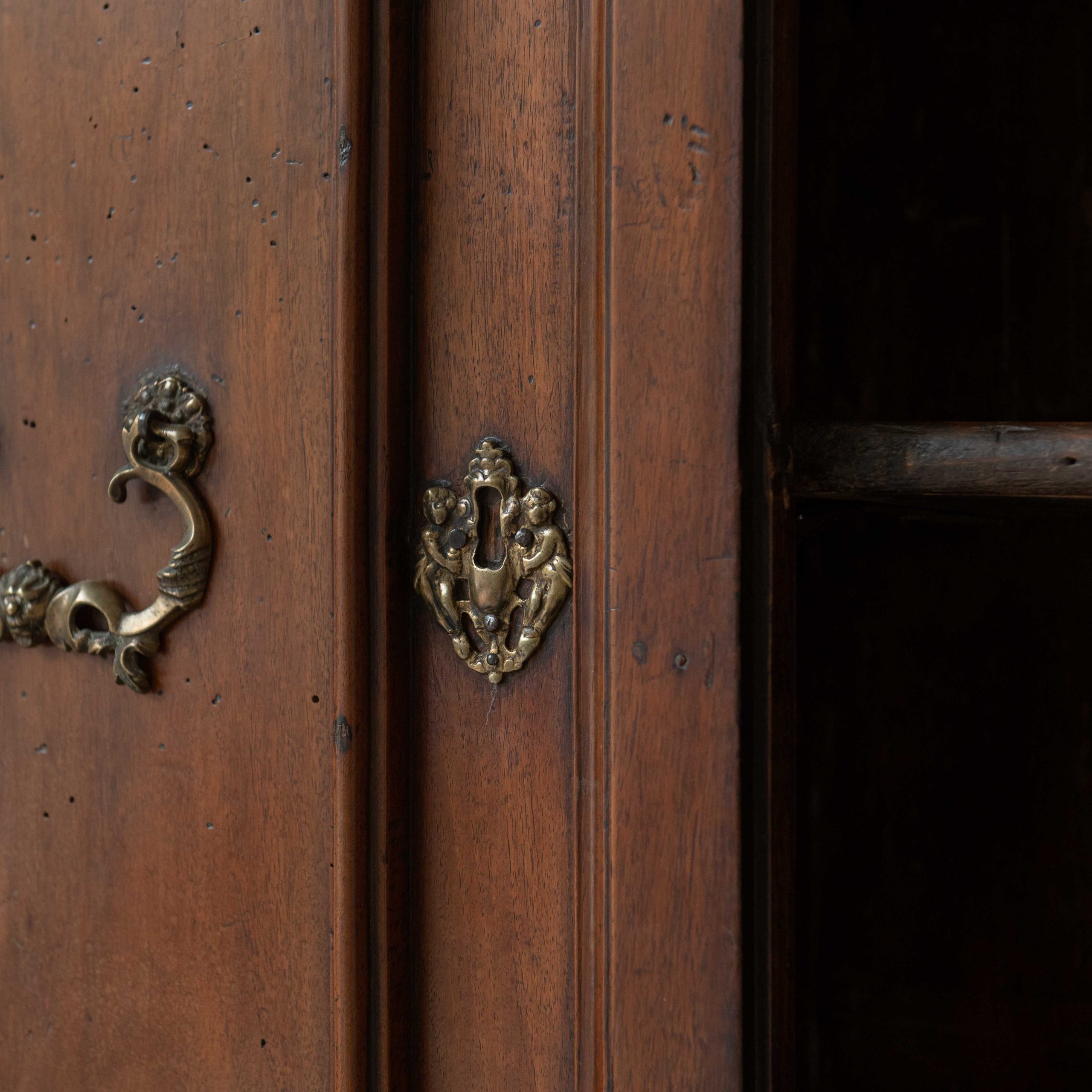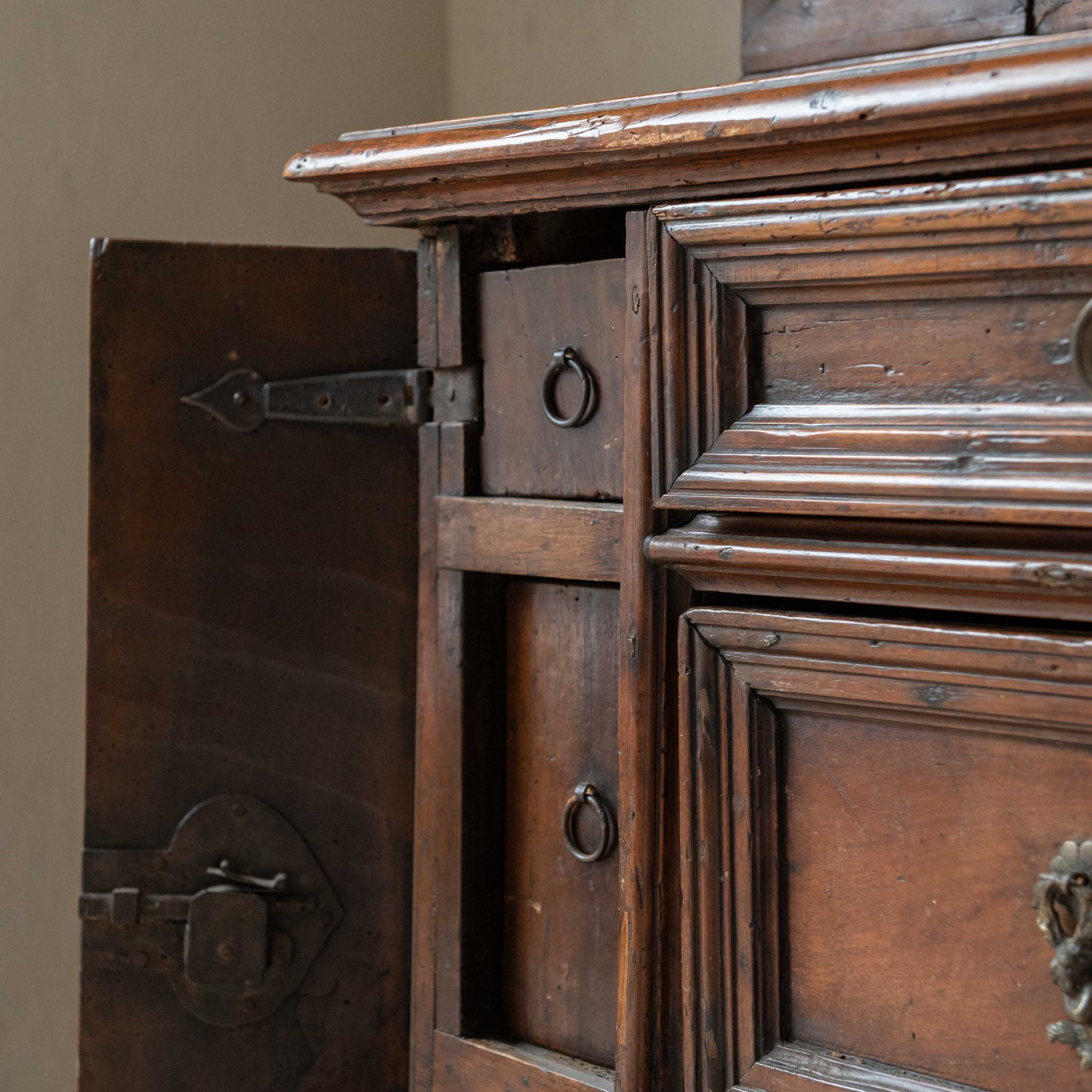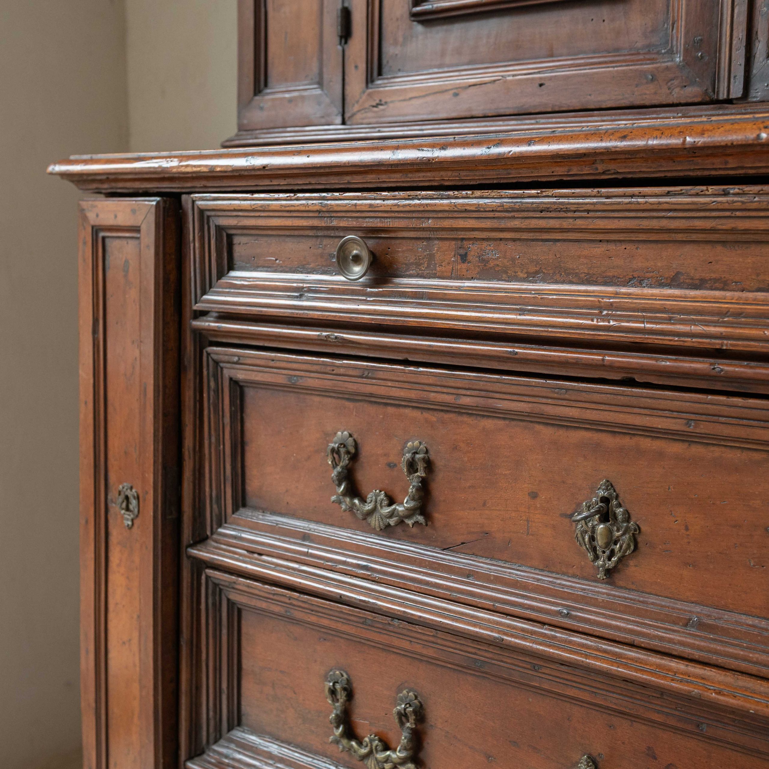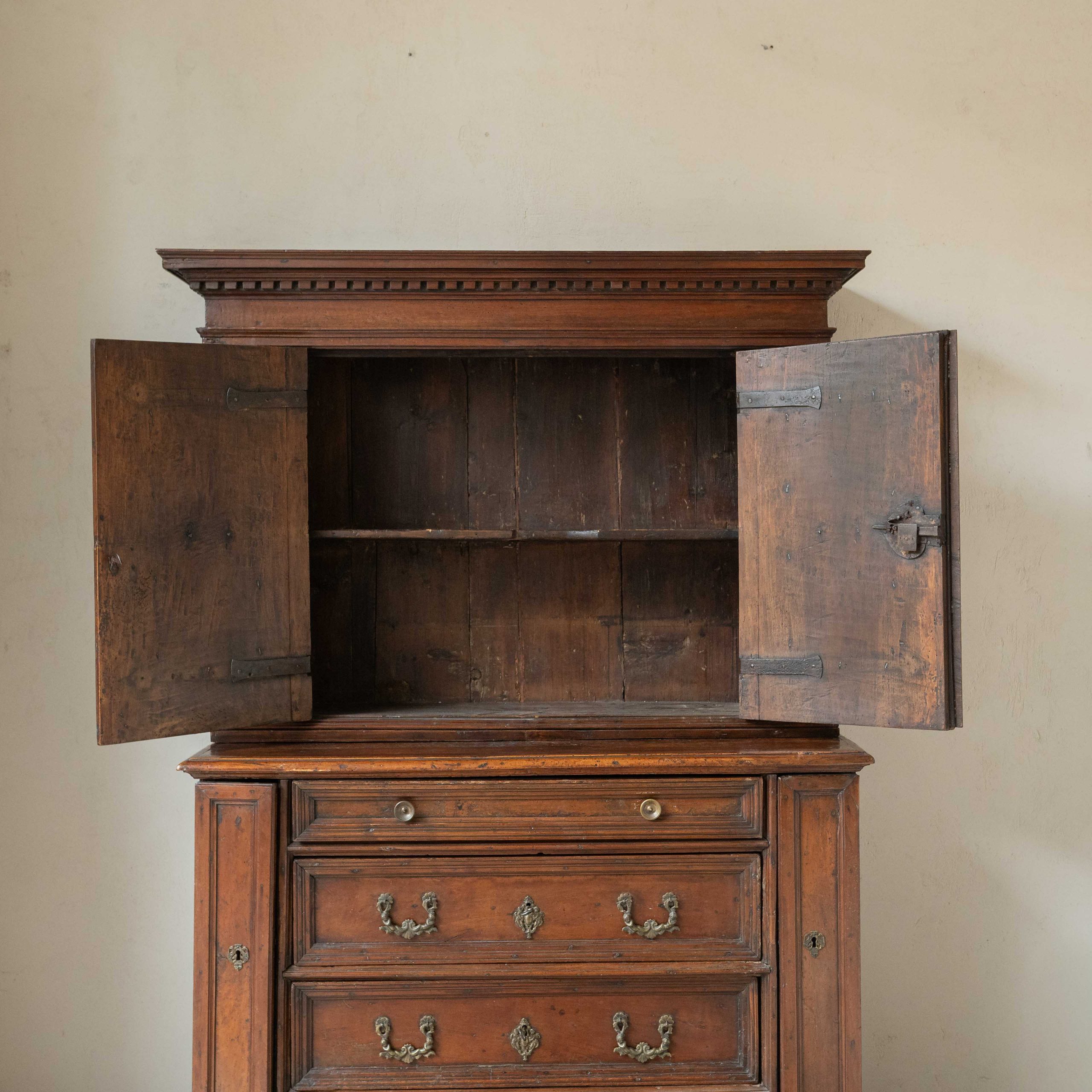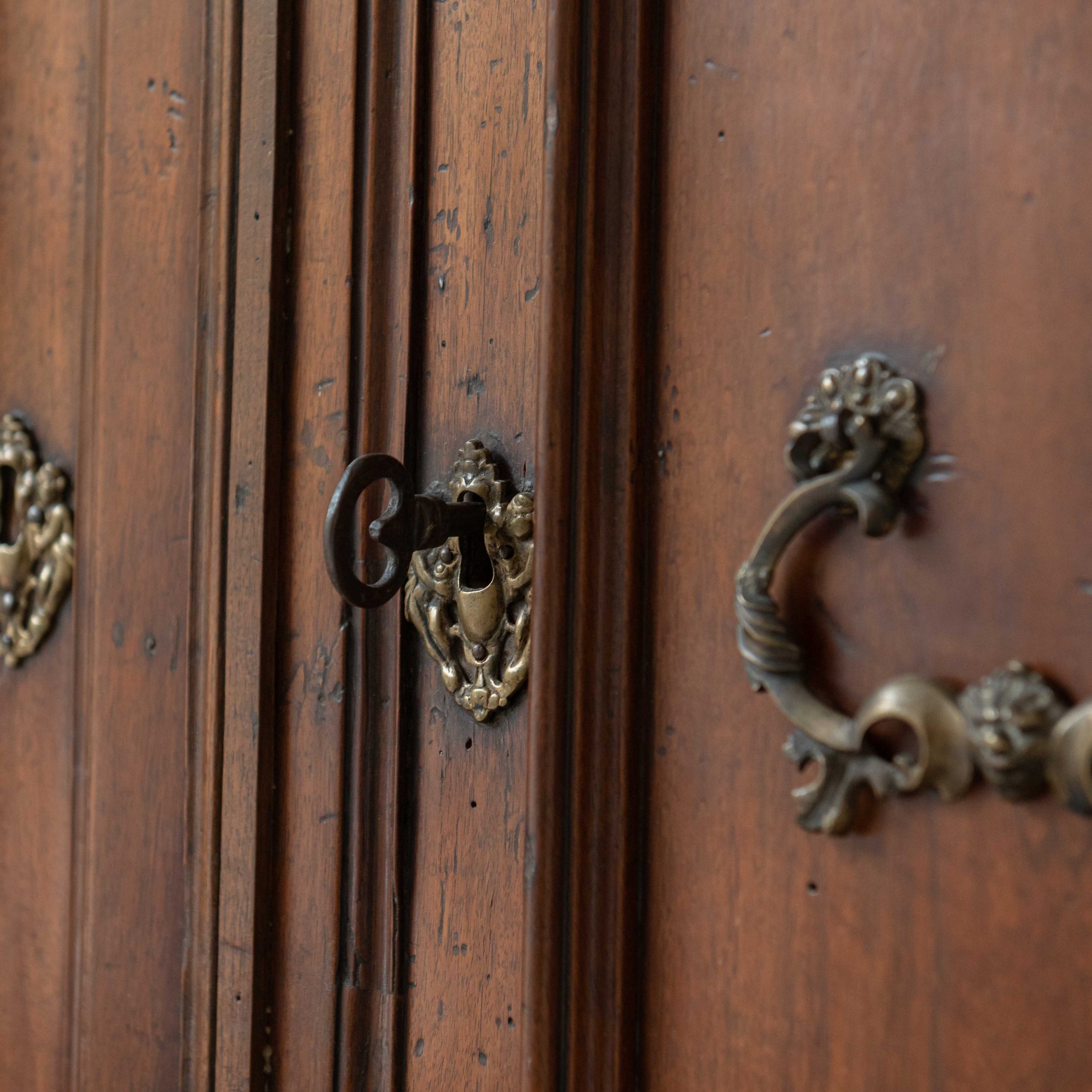 Armario origen Lombardía del siglo XVII. Este armario lombardo desprende una elegancia sobria y antigua que esconde siglos de historias en el brillo cálido de su madera. Su estructura robusta, elaborada en madera de nogal, muestra la maestría artesanal de otra época: las puertas superiores, con molduras discretamente talladas, reflejan la luz de forma suave, revelando vetas profundas y vivas. Los herrajes antiguos, finos y ornamentados, añaden un toque de bello contraste, como joyas que completan el carácter del mueble. Una pieza que no solo decora, sino que invita a contemplar el paso del tiempo a través de cada detalle.