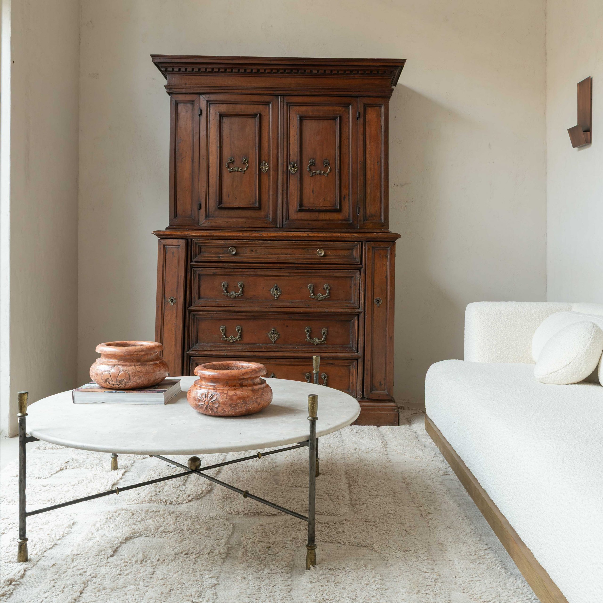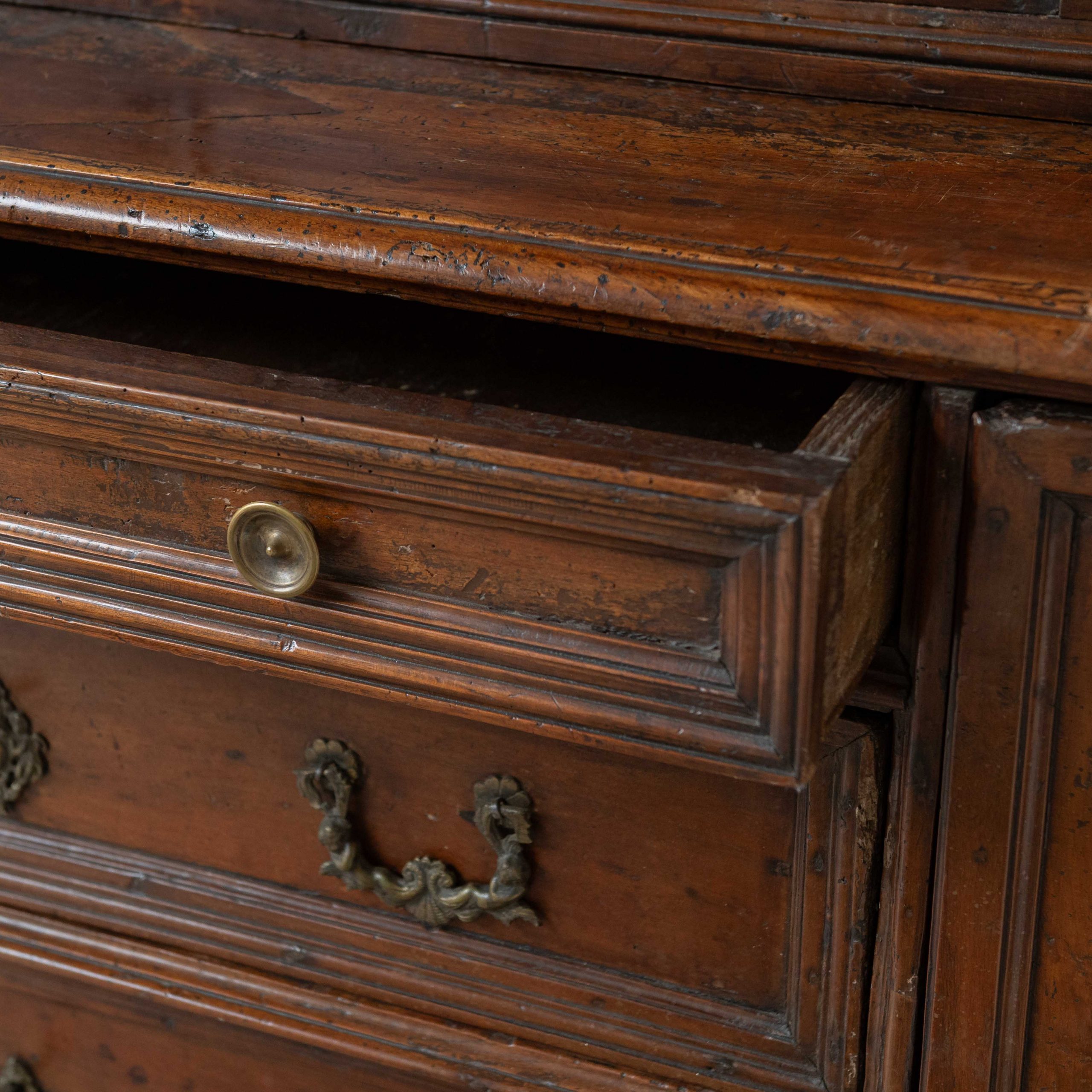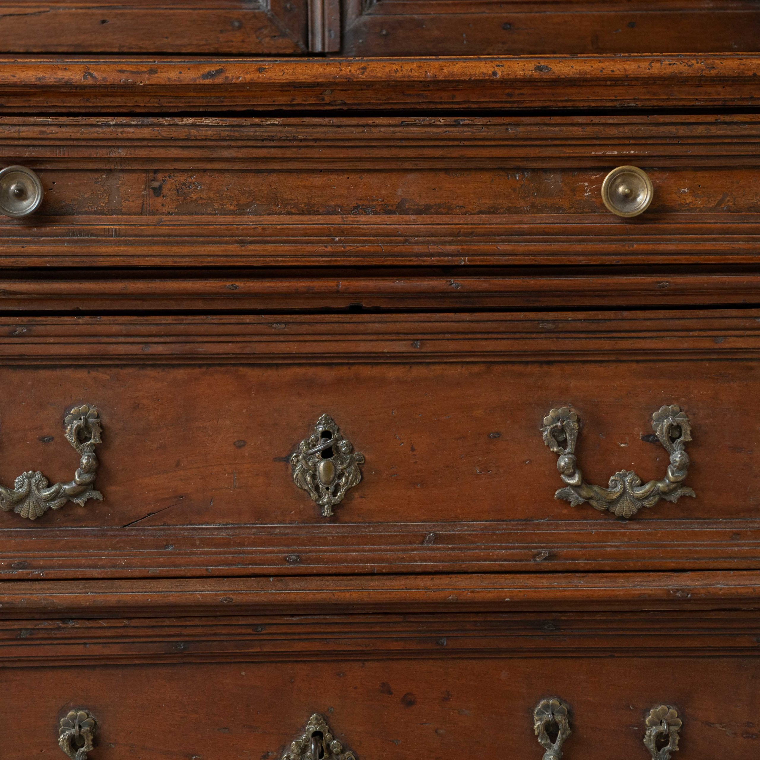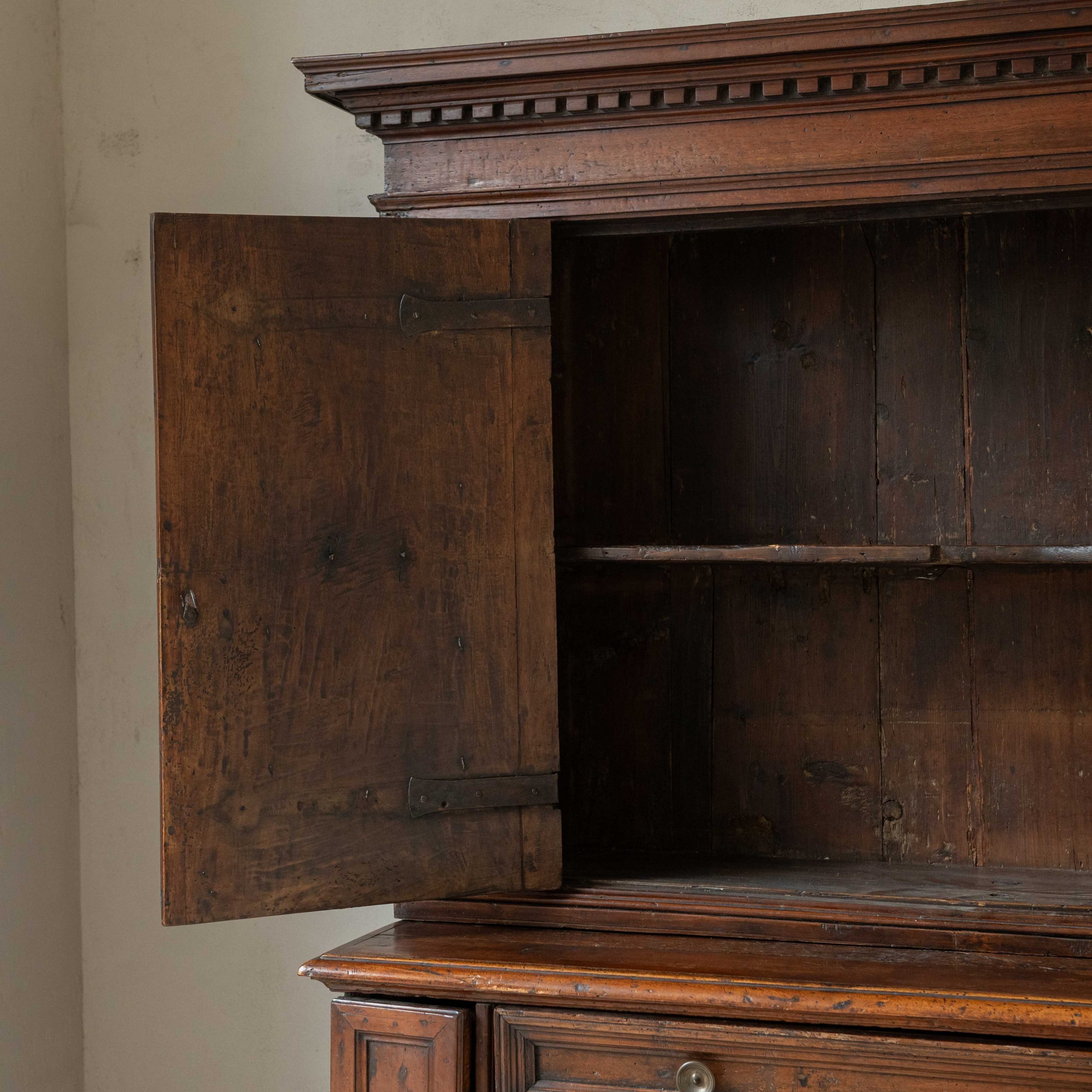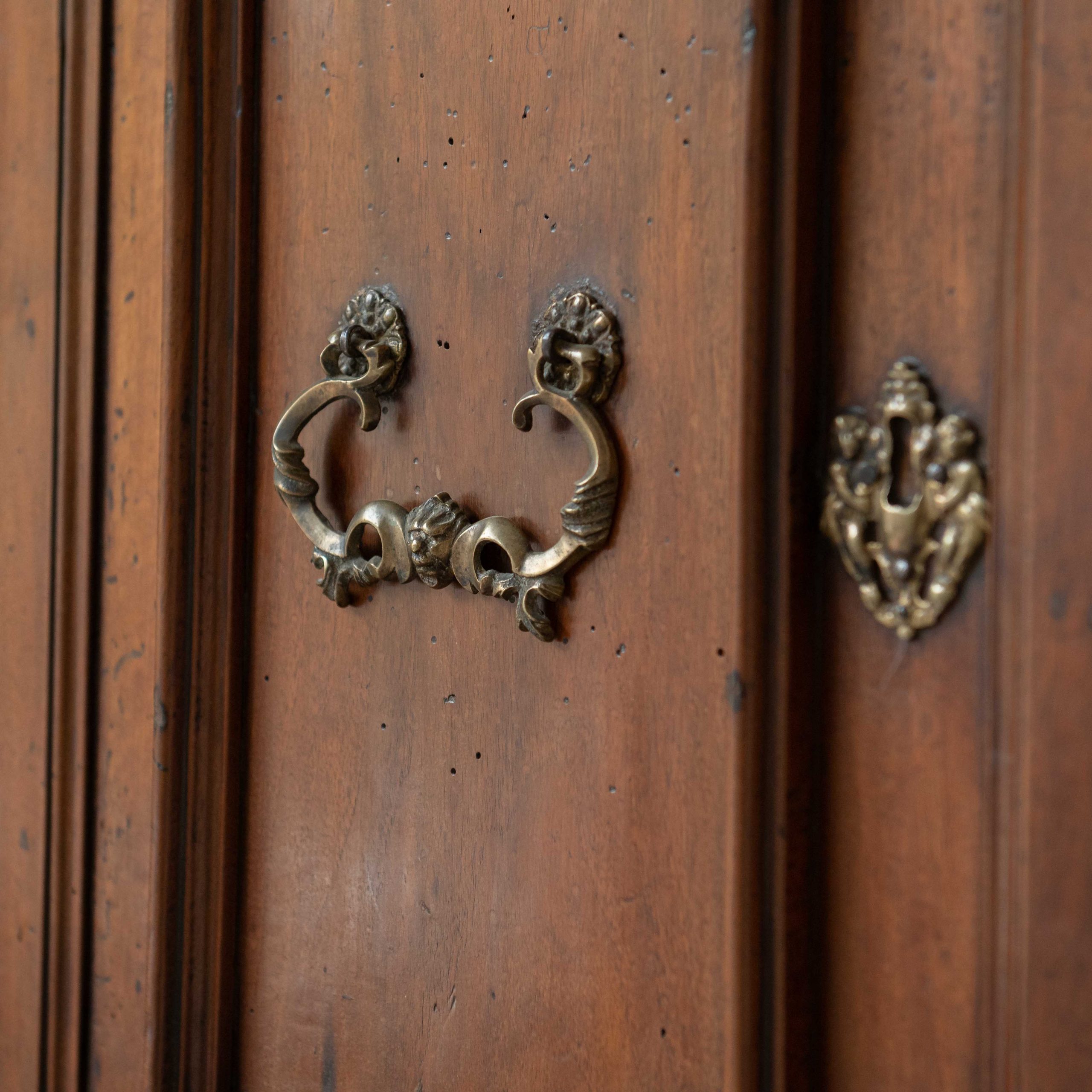 Armario origen Lombardía del siglo XVII. Este armario lombardo desprende una elegancia sobria y antigua que esconde siglos de historias en el brillo cálido de su madera. Su estructura robusta, elaborada en madera de nogal, muestra la maestría artesanal de otra época: las puertas superiores, con molduras discretamente talladas, reflejan la luz de forma suave, revelando vetas profundas y vivas. Los herrajes antiguos, finos y ornamentados, añaden un toque de bello contraste, como joyas que completan el carácter del mueble. Una pieza que no solo decora, sino que invita a contemplar el paso del tiempo a través de cada detalle.