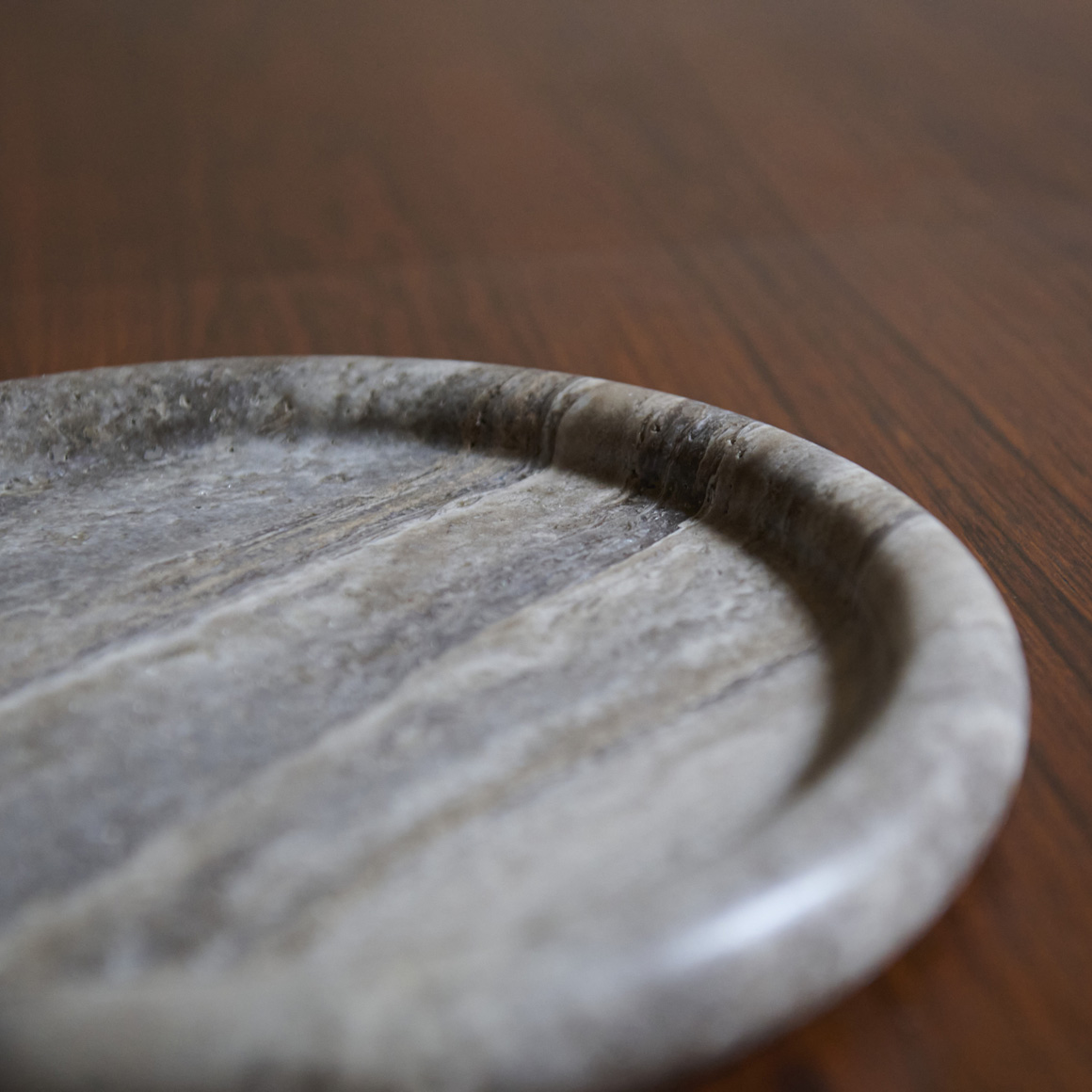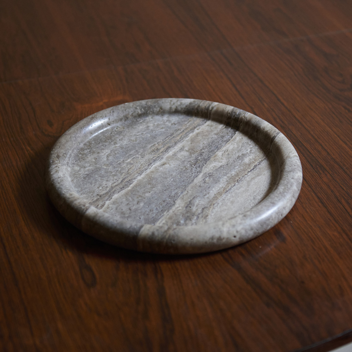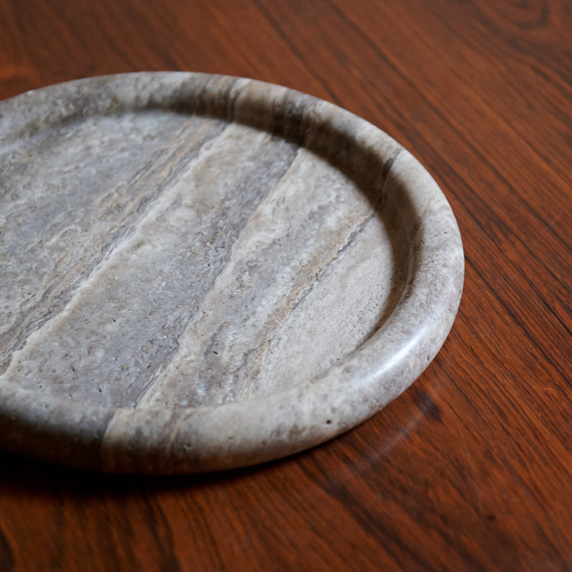 Bandeja de travertino plateado. De belleza natural y sobriedad elegante, está tallada en travertino con vetas suaves y tonos grises perlados. Su forma redonda, de bordes suavemente curvados y perfectamente pulidos, equilibra lo orgánico con lo refinado. Una pieza que resulta ideal como centro de mesa, como elegante vacía bolsillos o sencillamente como bonita escultura.