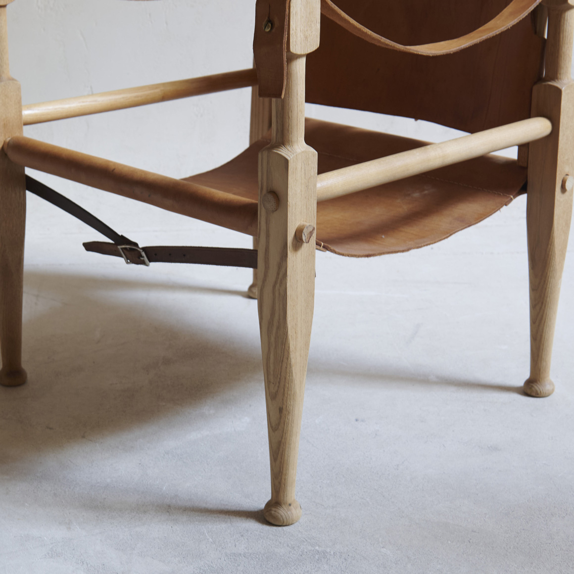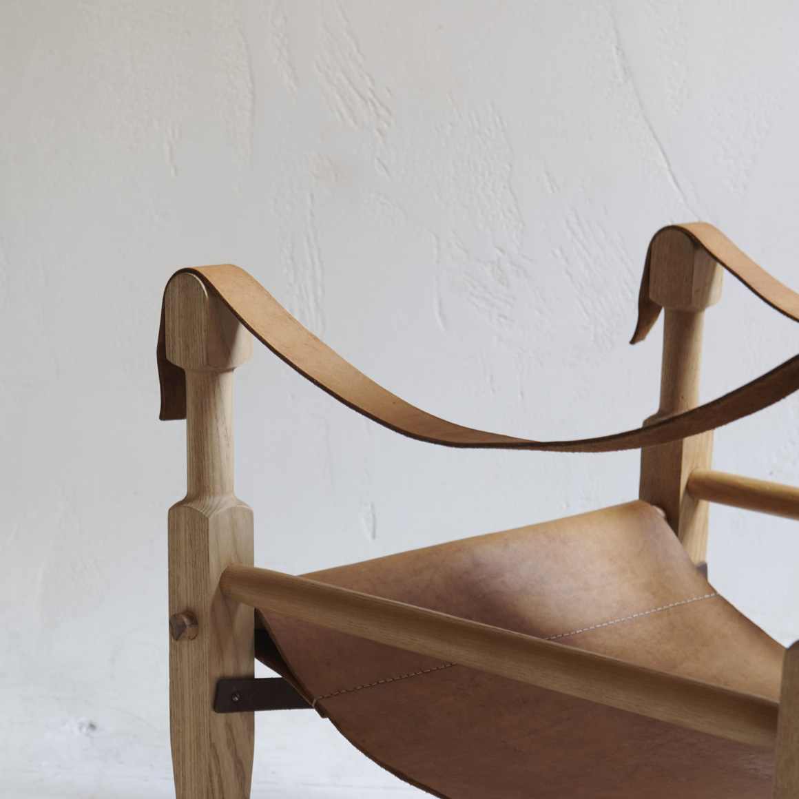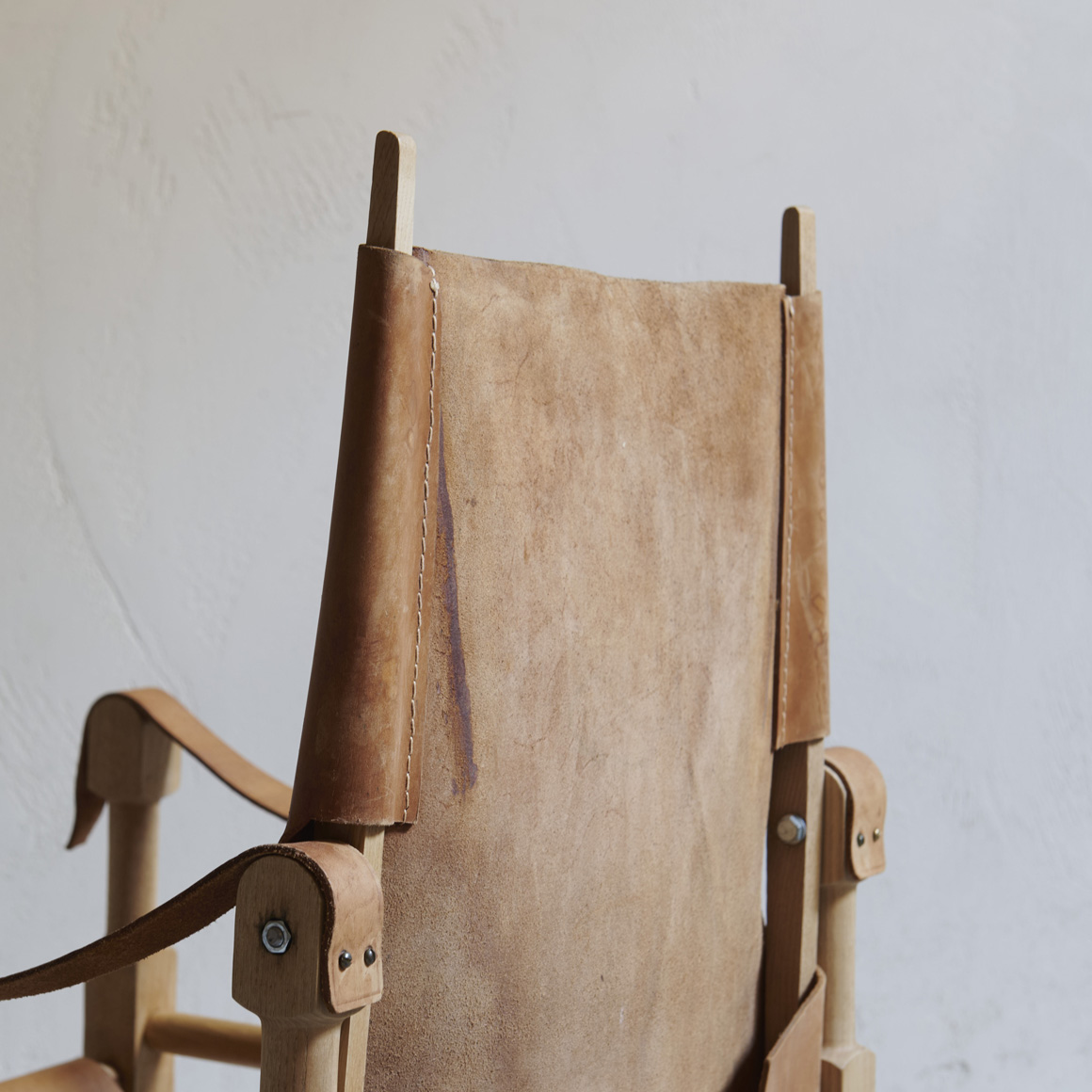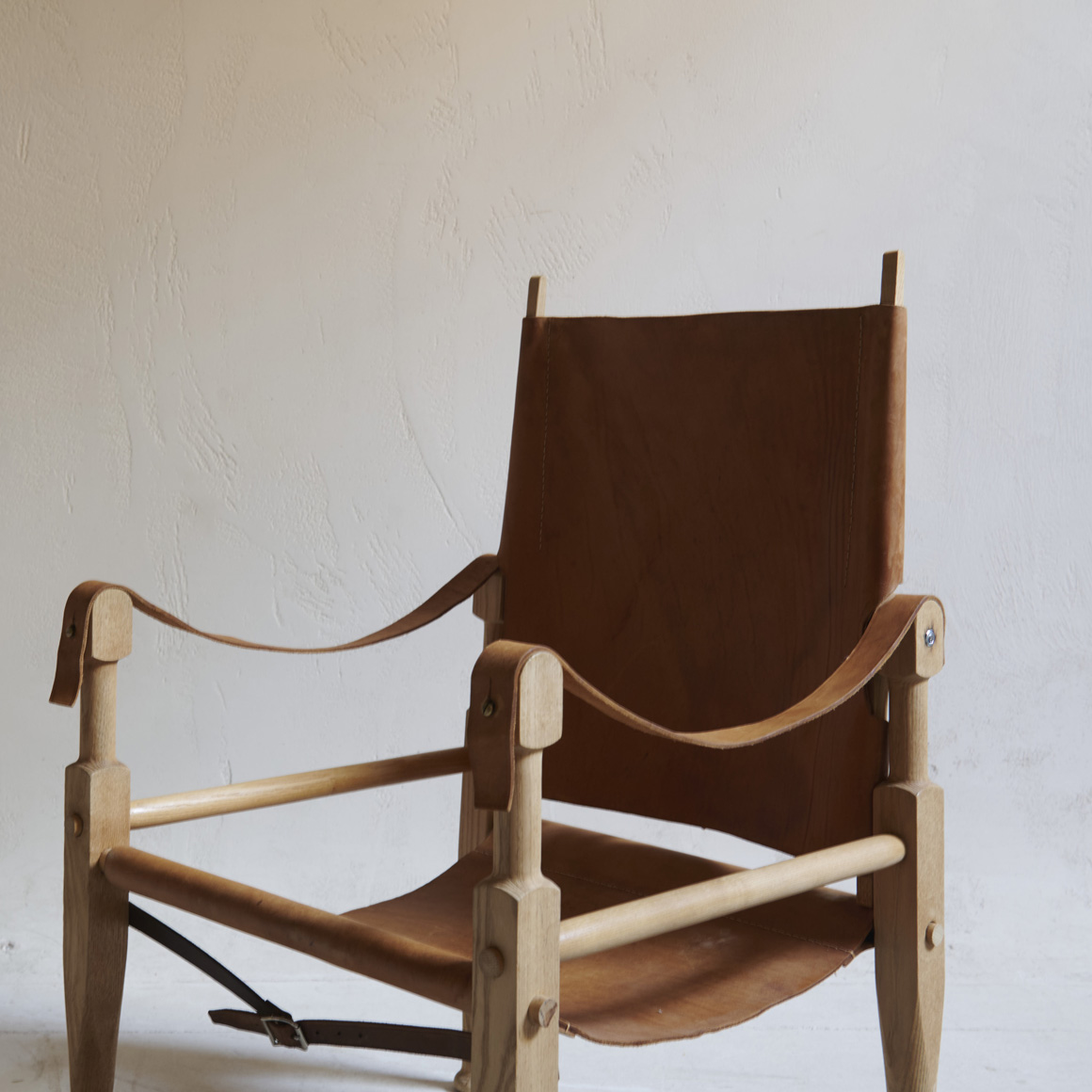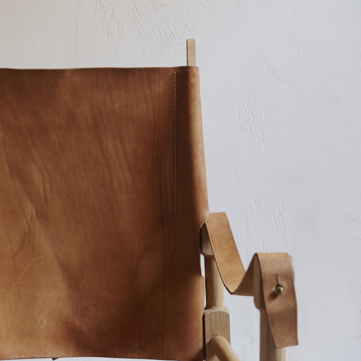 Butaca de piel vintage. Esta butaca vintage tipo safari desprende una elegancia rústica y atemporal. Su estructura de madera clara, con líneas suaves pero bien definidas, evoca la artesanía tradicional y el diseño funcional propio de las expediciones del siglo pasado. El asiento, respaldo y apoyabrazos en cuero natural curtido aportan calidez y textura, muestran las vetas y tonos únicos del material, que con el tiempo han ganado carácter y belleza.
