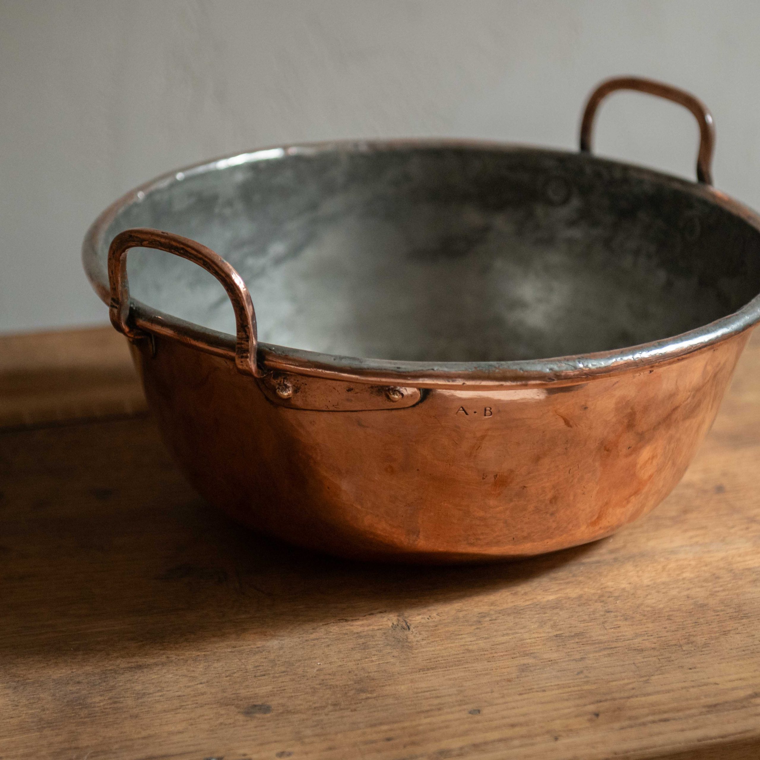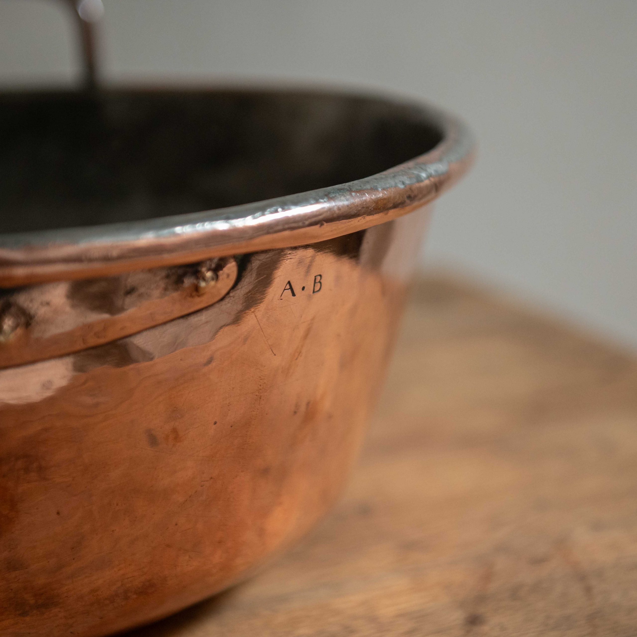 Cazuela antigua de cobre. Una bonita pieza francesa ligera, funcional y con la belleza propia del cobre amartillado artesanalmente.