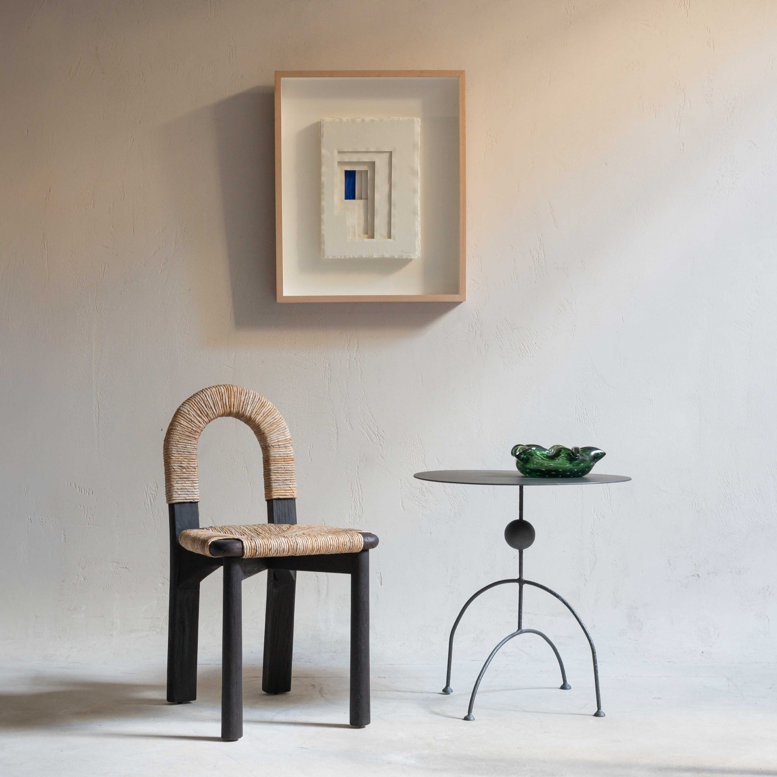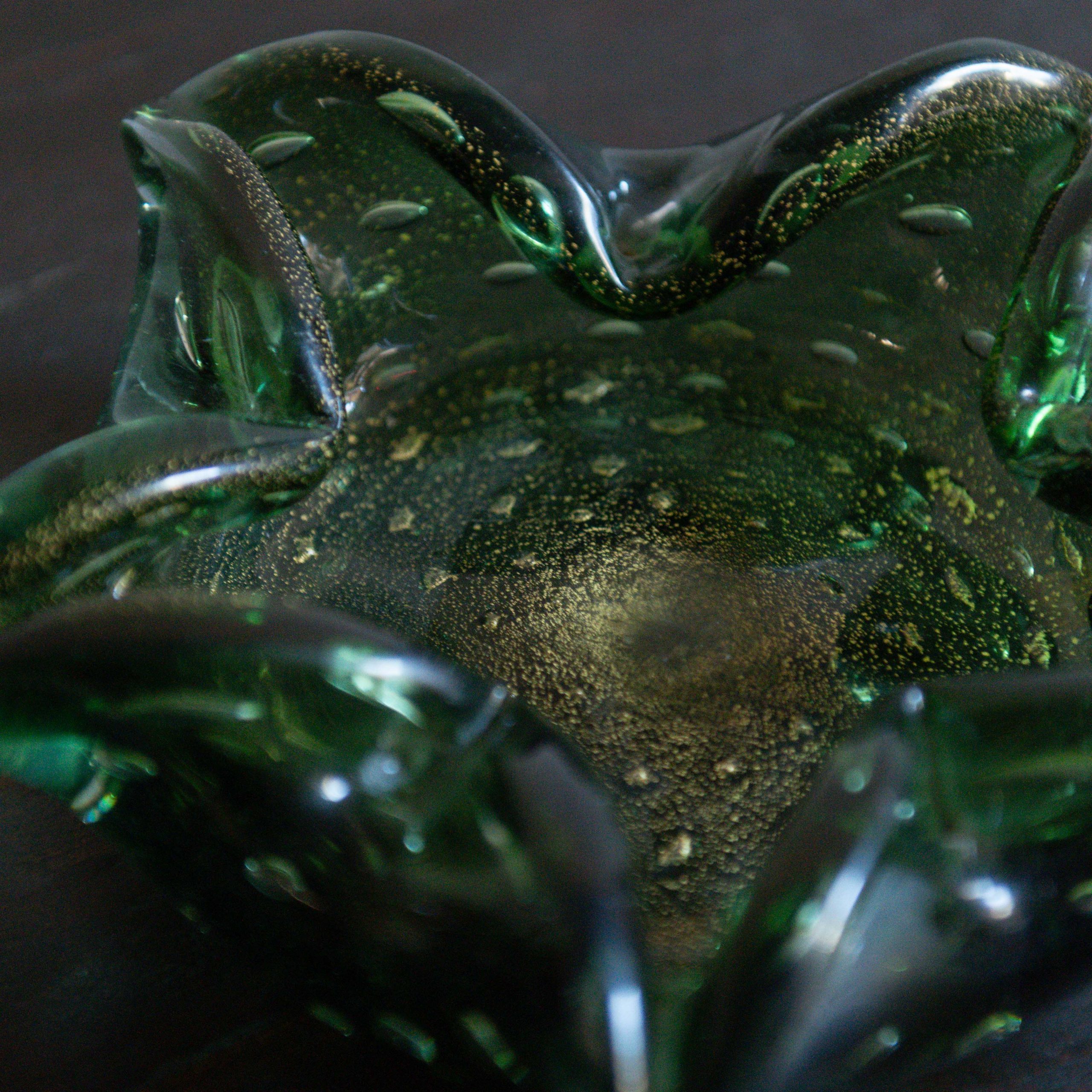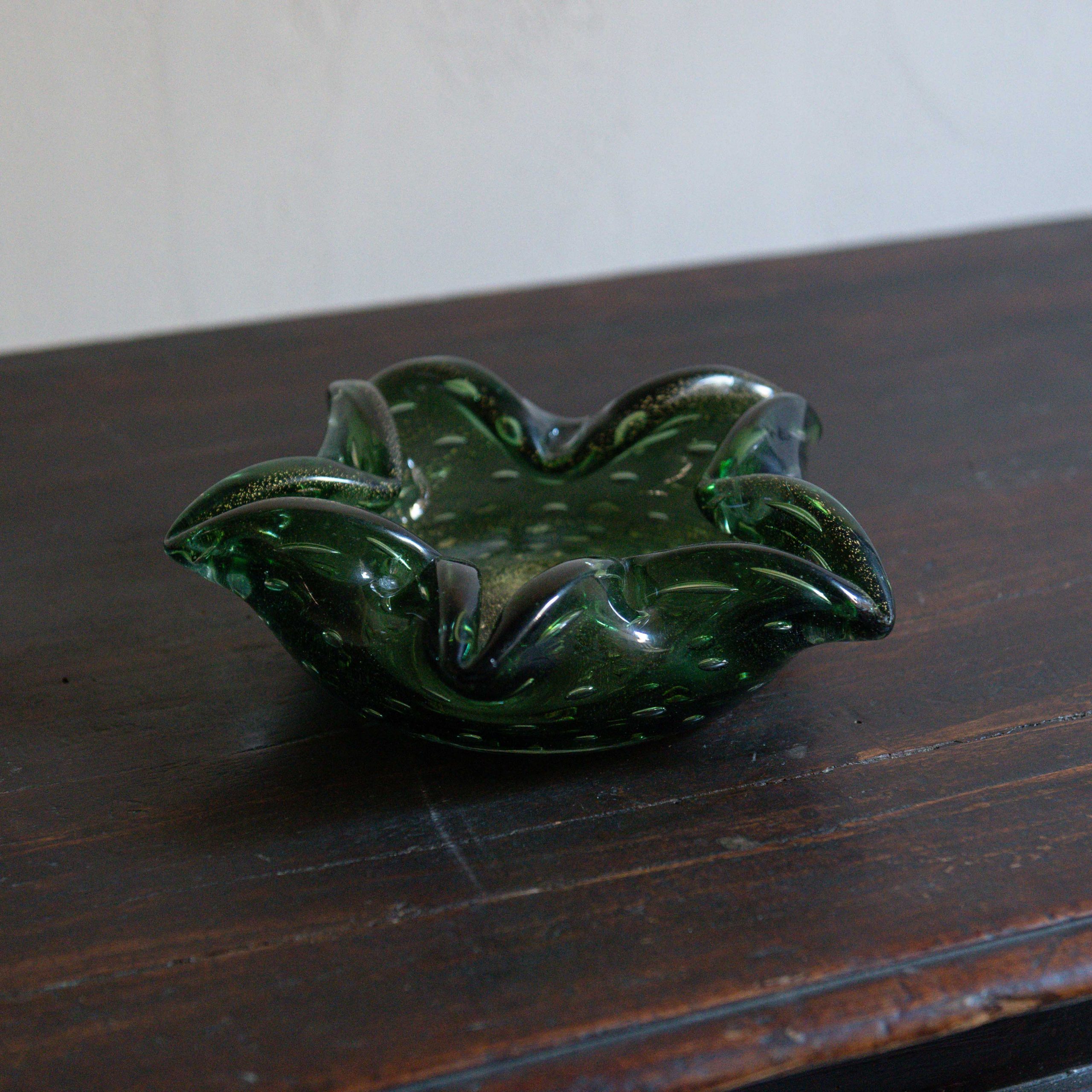 Centro de mesa de vidrio soplado de Murano. Una pieza con un encanto delicado y elegante, fabricada con el famoso cristal italiano en un tono verde profundo con su conocida técnica a técnica “bullicante”, que da como resultado preciosas burbujas de aire controladas suspendidas en el vidrio. Sus bordes ondulados se abren como pétalos suaves, creando una forma orgánica y fluida que invita a mirarlo desde distintos ángulos.