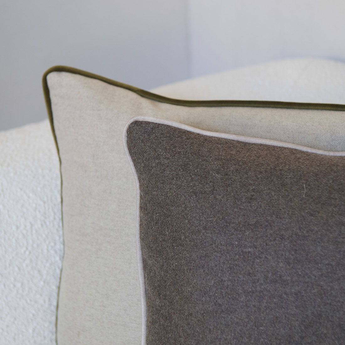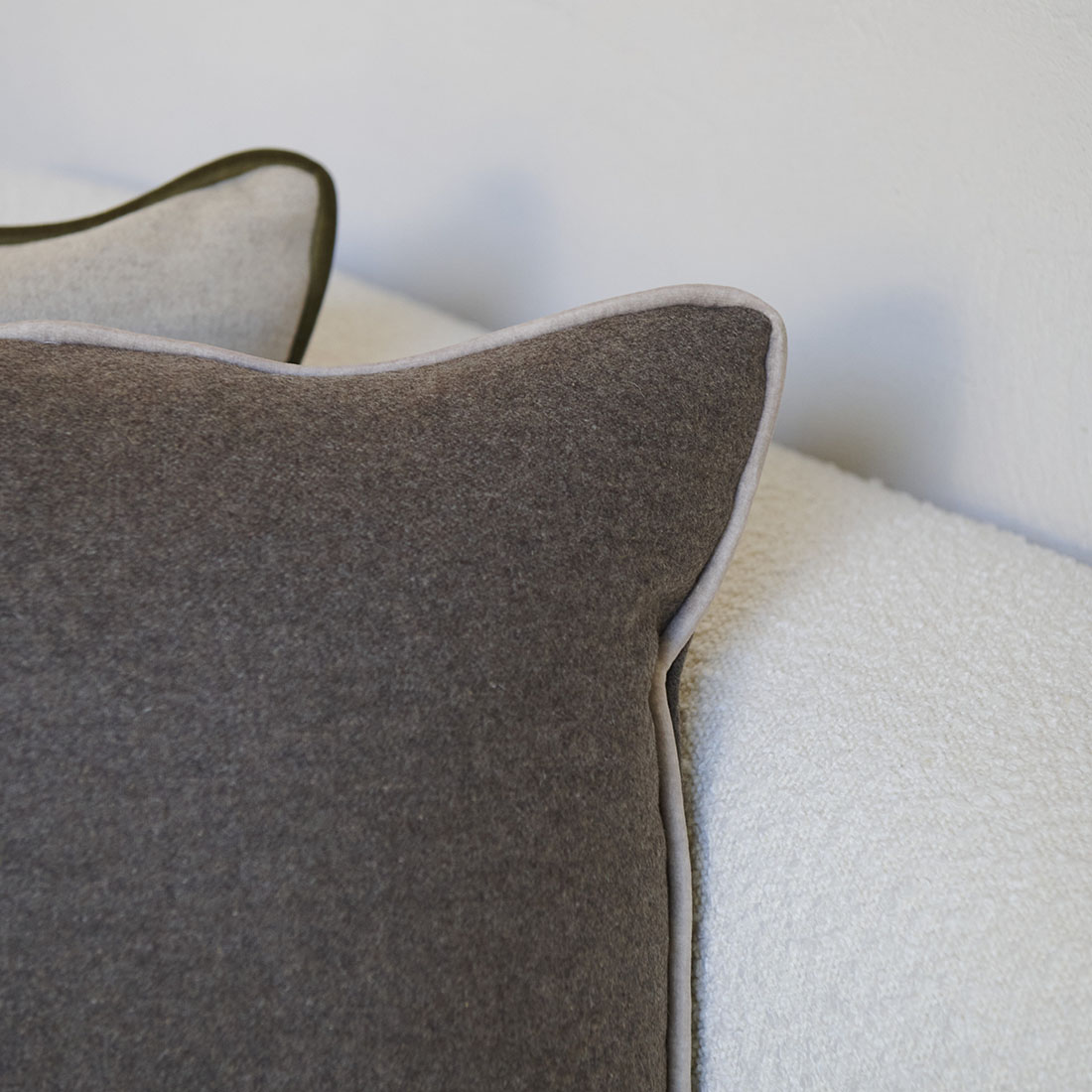 Cojín de lana color topo con ribete de terciopelo beige.