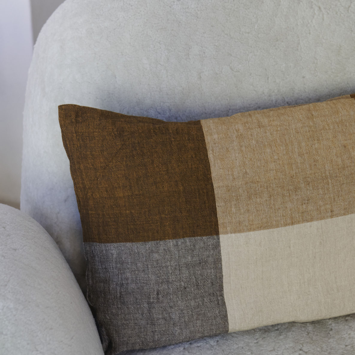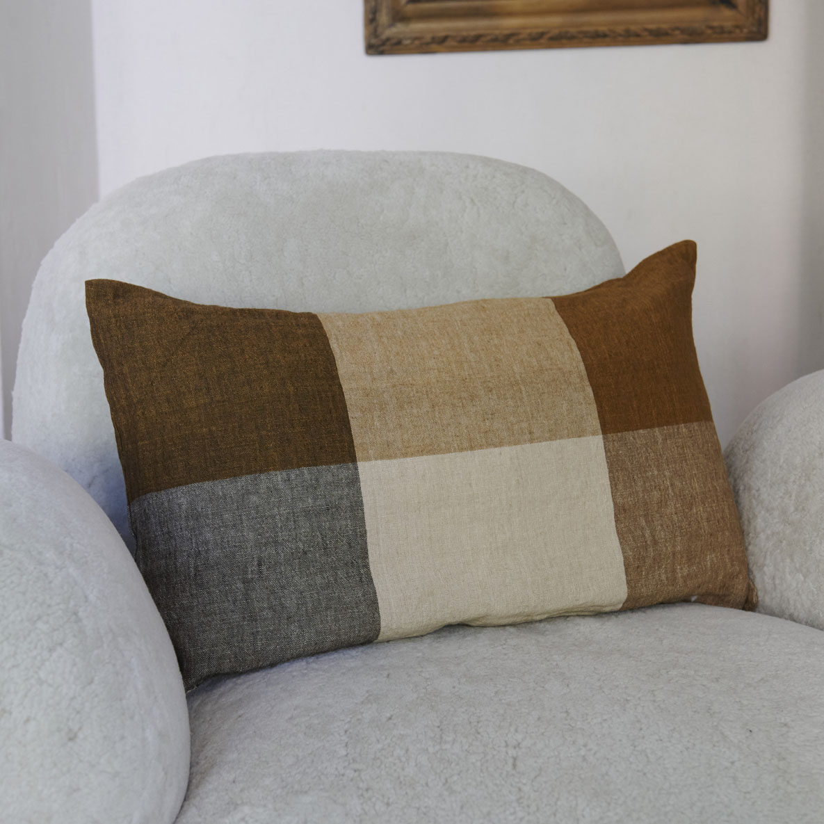Cojín de lino cuadros tonos cálidos con cierto aire retro. La combinación estampada a cuadros en tonos tierras y cálidos aporta un toque acogedor a cualquier rincón. 100% lino.