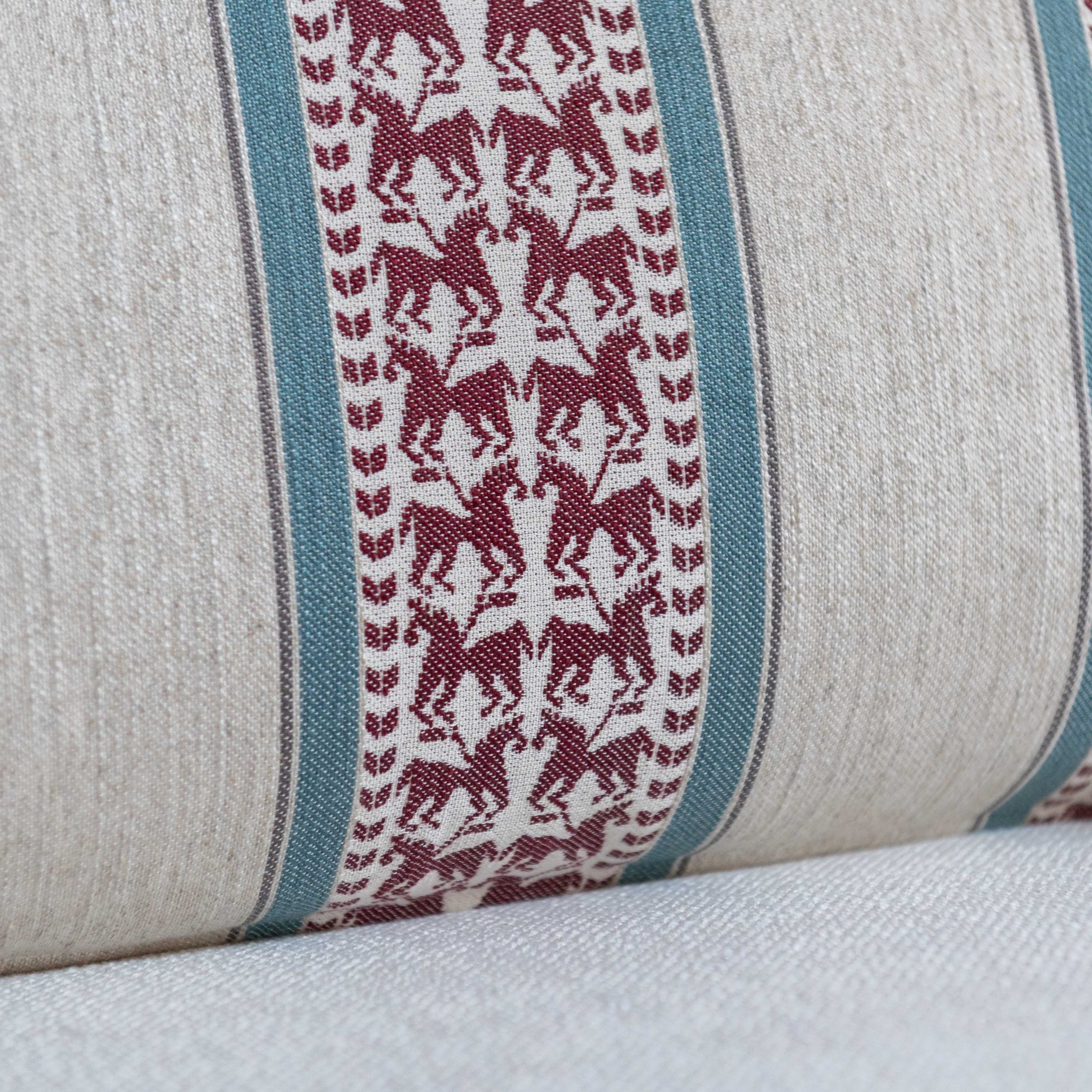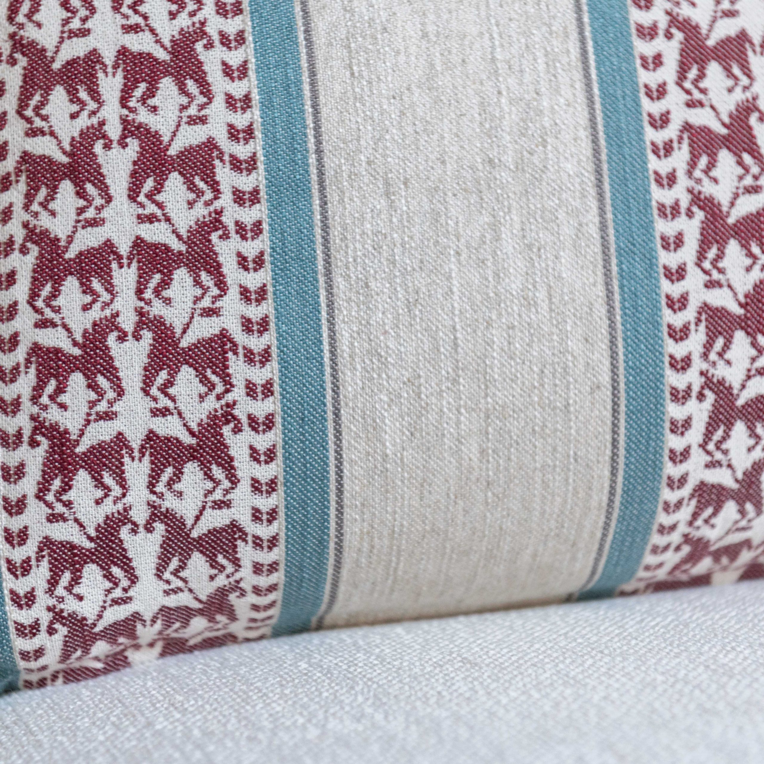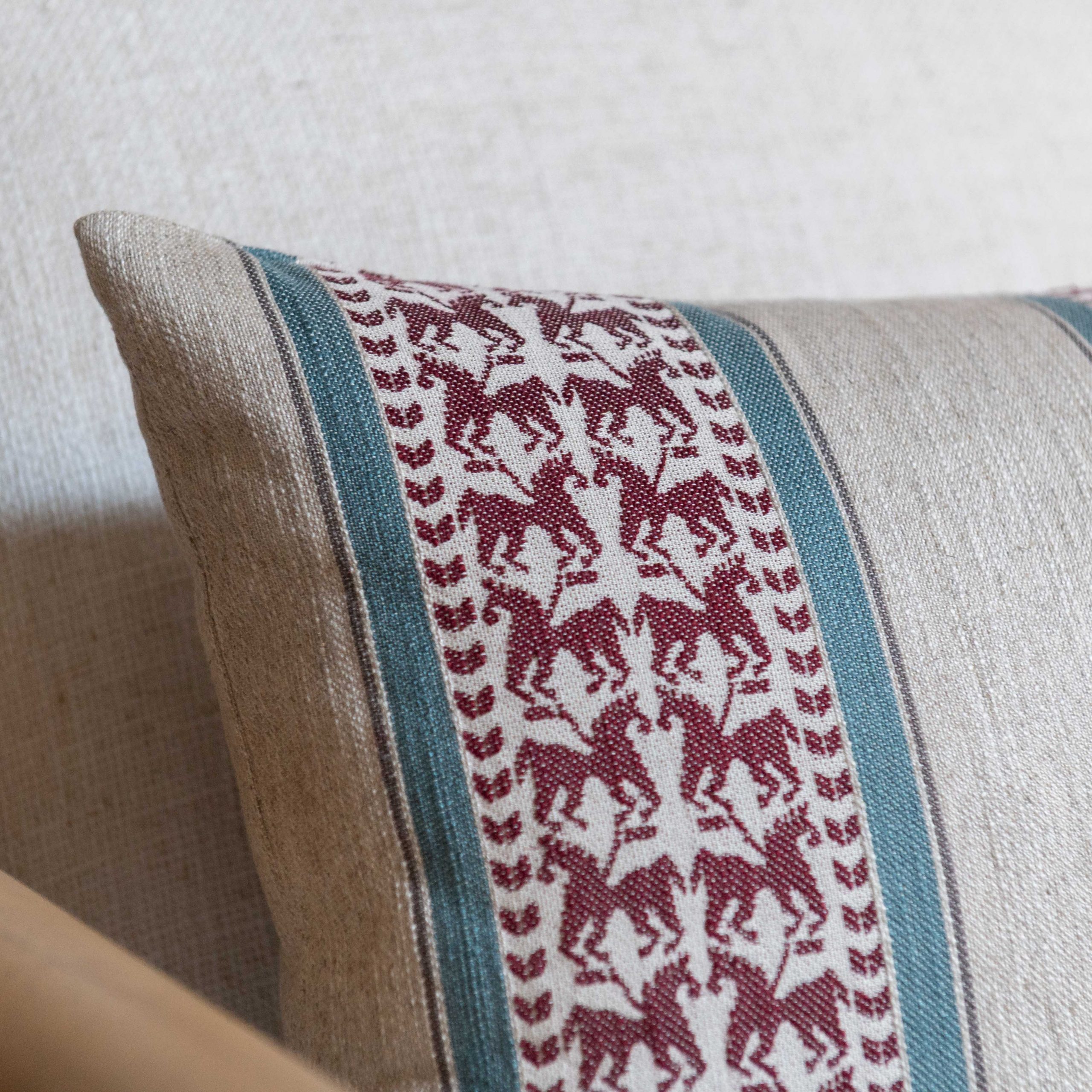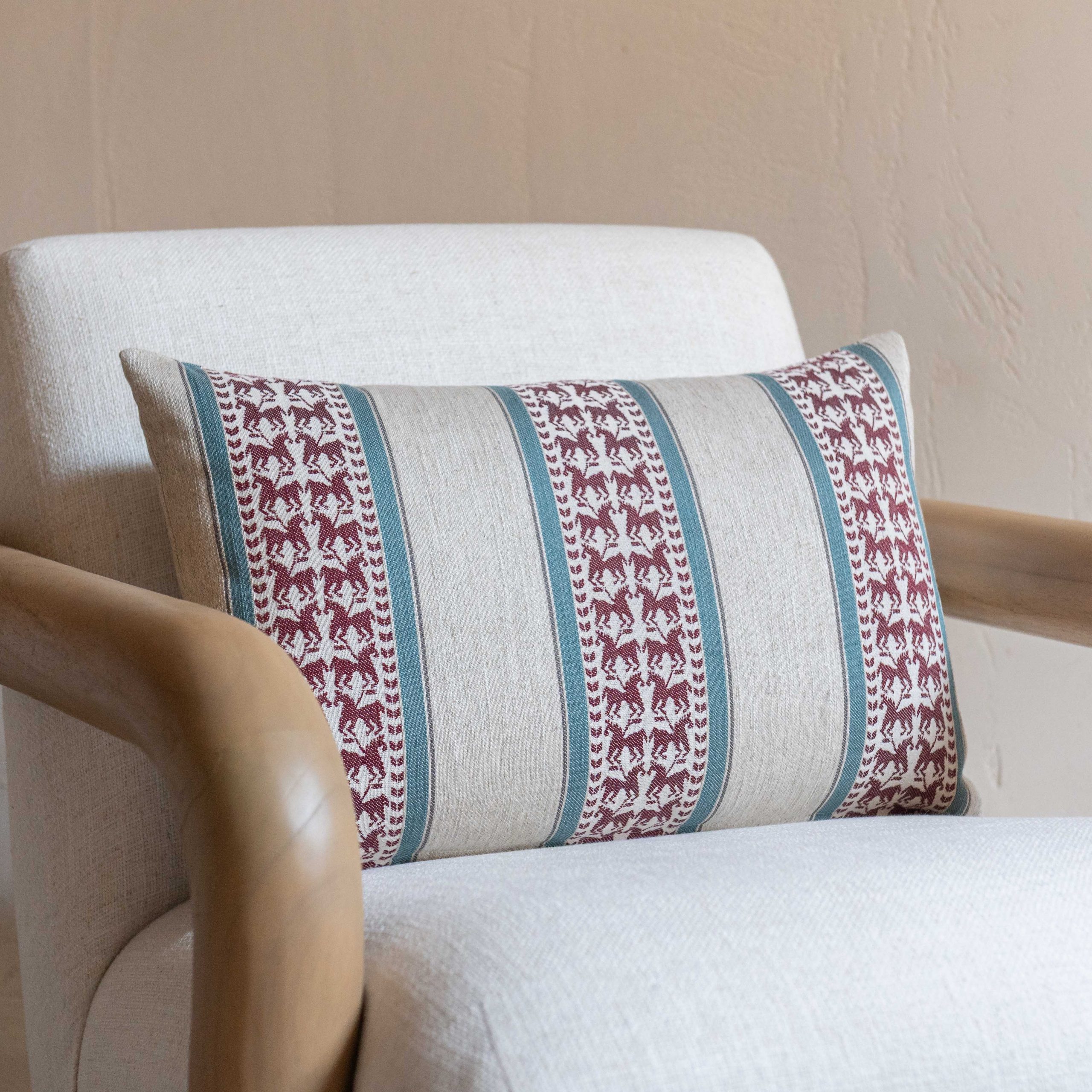 Cojín motivo Troya beige y burdeos. Un cojín de líneas alargadas y tejido natural, decorado con franjas geométricas en tonos granate y azul suave. Su diseño combina calidez y frescura, aportando un toque artesanal y elegante al espacio.