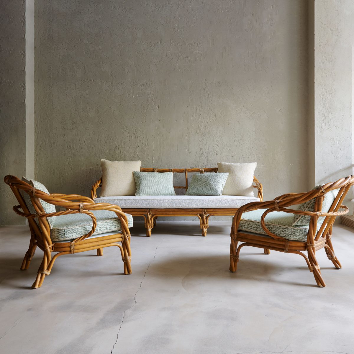 Pareja de butacas de jardín vintage francés de caña. Fabricado en Francia alrededor de la década de los 60, es 100% artesanal. Las butacas mantienen su estado original y las hemos acompañado de bonitos y mullidos asientos de fresco colorido y elegante diseño, siempre con las mejores telas. Verdes y blancos rotos que harán las delicias de cualquier jardín, porche o terraza.