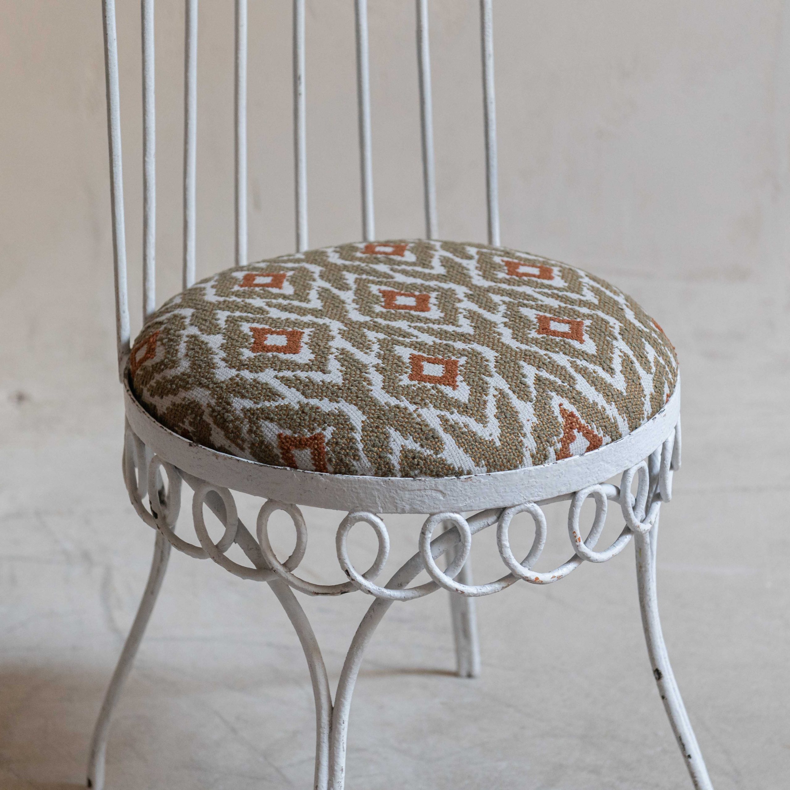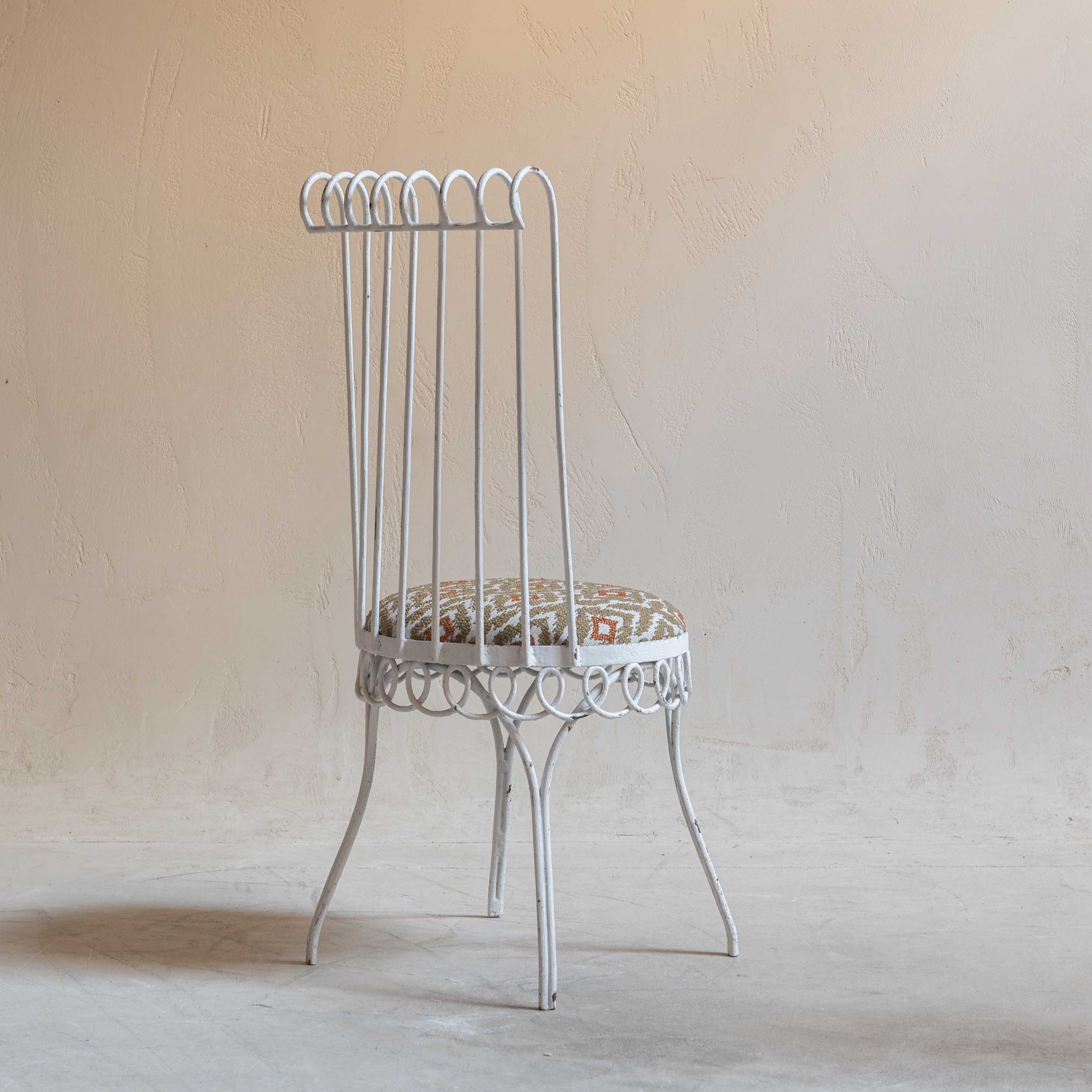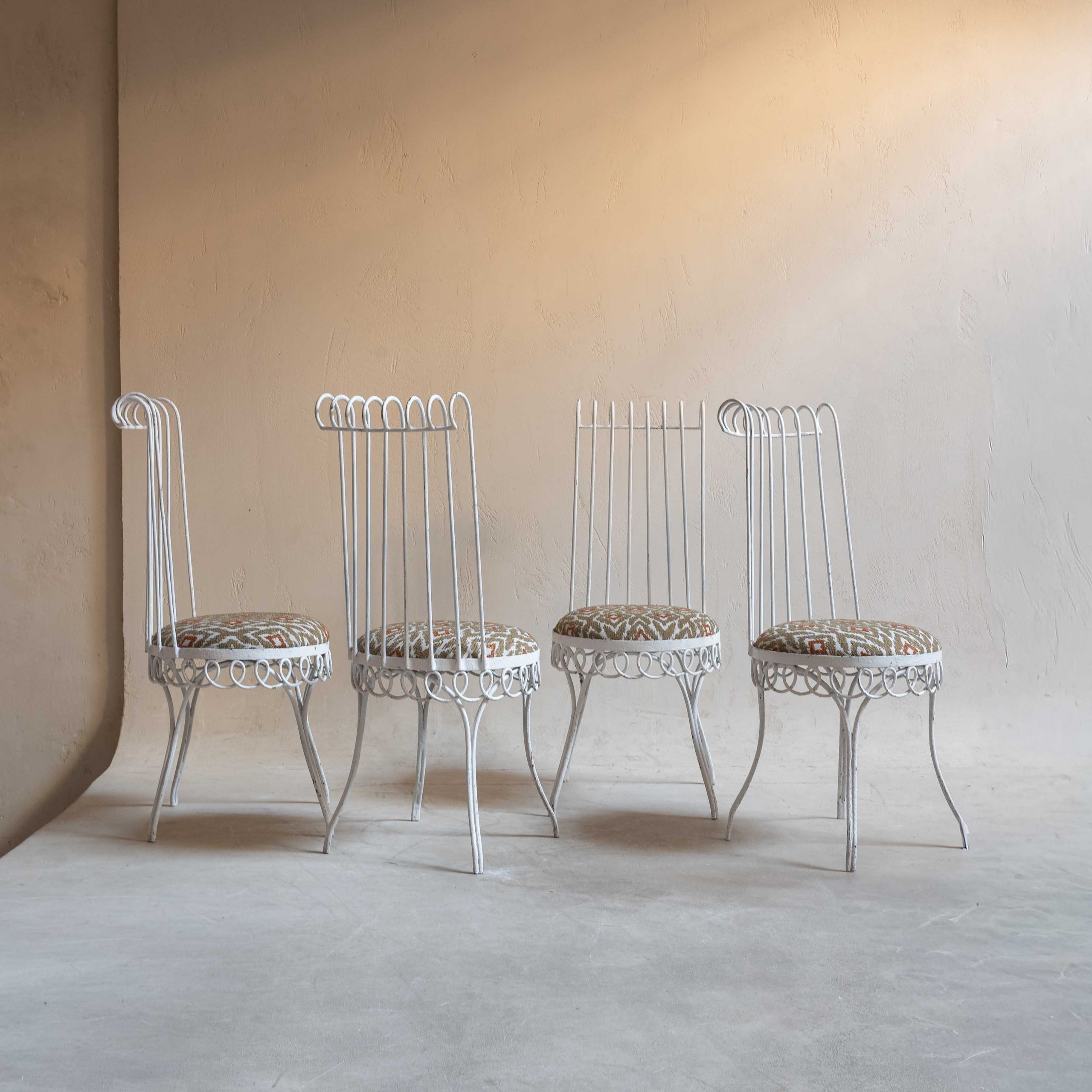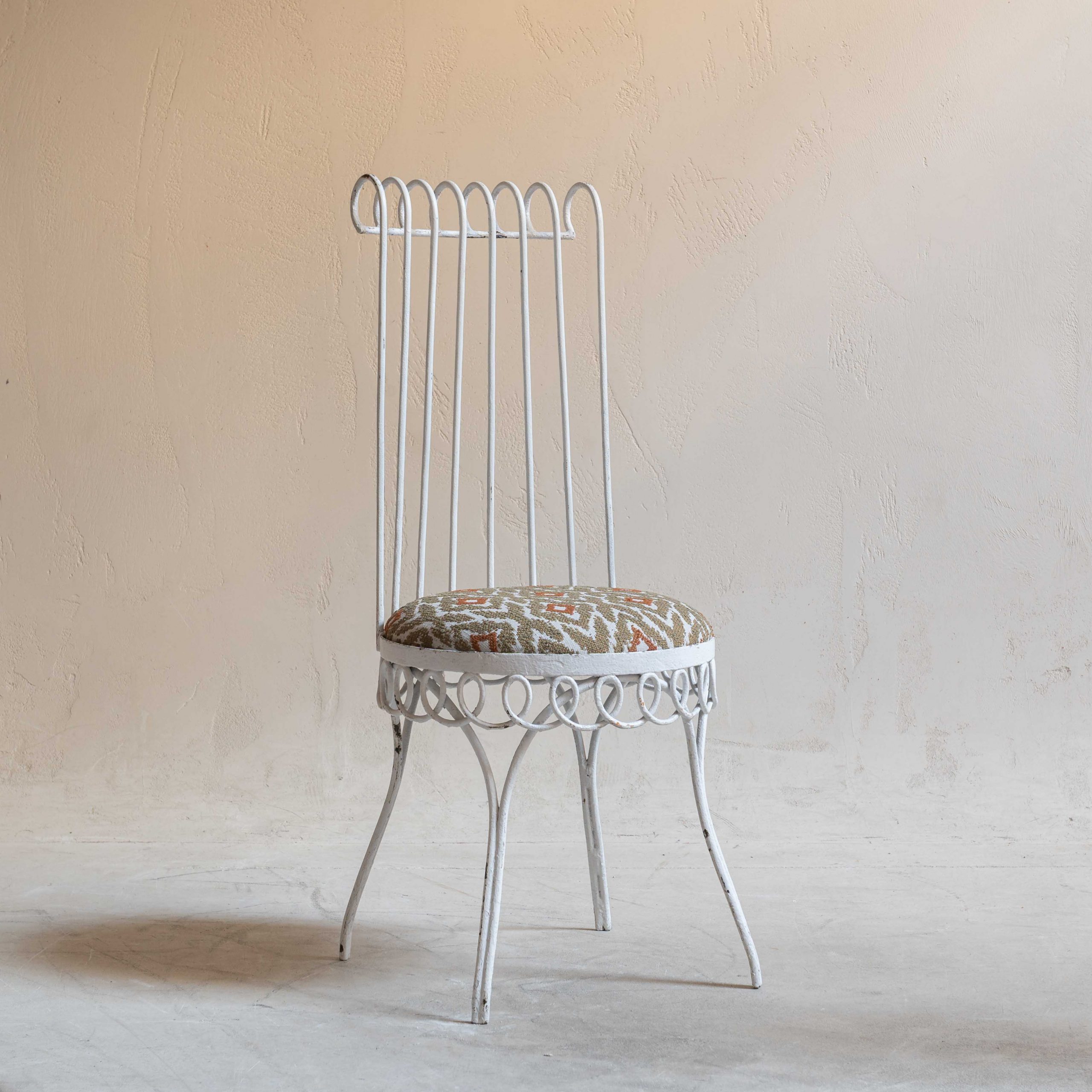 Conjunto de sillas de jardín Mid Century. Se trata de un conjunto de piezas con estructura de hierro forjada con esmero que revela un delicado equilibrio entre solidez y encanto. El hierro, trabajado en filigranas y curvas forma una pieza ornamentada que recuerda a los jardines románticos de épocas pasadas. La pintura blanca, envejecida por el paso del tiempo, se muestra con pequeñas grietas y zonas donde el óxido asoma suavemente, dándole un carácter nostálgico y encantador. Sus respaldos altos y curvados en la parte superior les dan un aire elegante y los asientos redondos están retapizados con una tela de inspiración étnica en bonitas tonos y apta para exterior, lo que añade un contraste vibrante y moderno. De estilo Mathieu Matégot -artista y diseñador húngaro afincado en París- estas sillas ponen la nota especial en cualquier espacio.