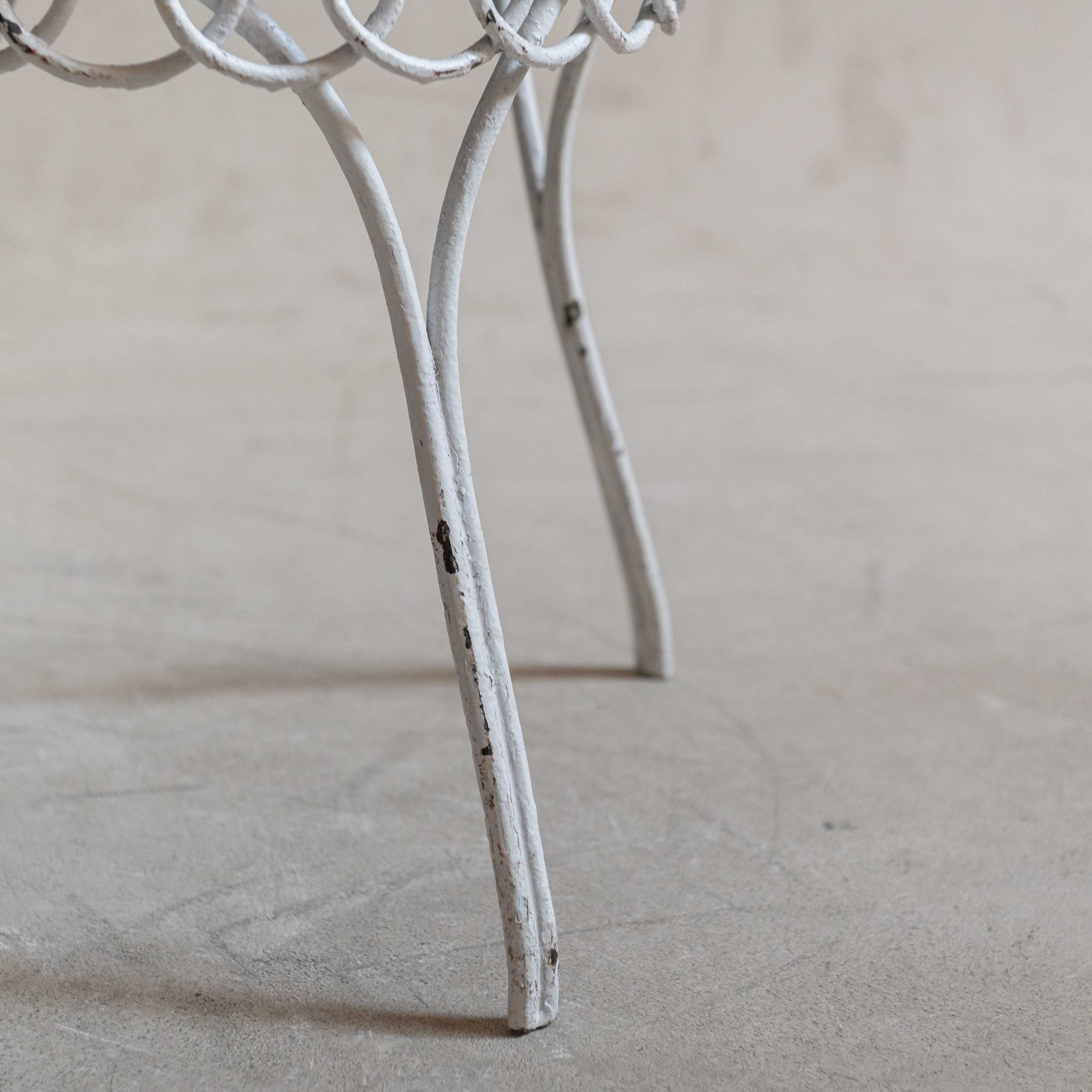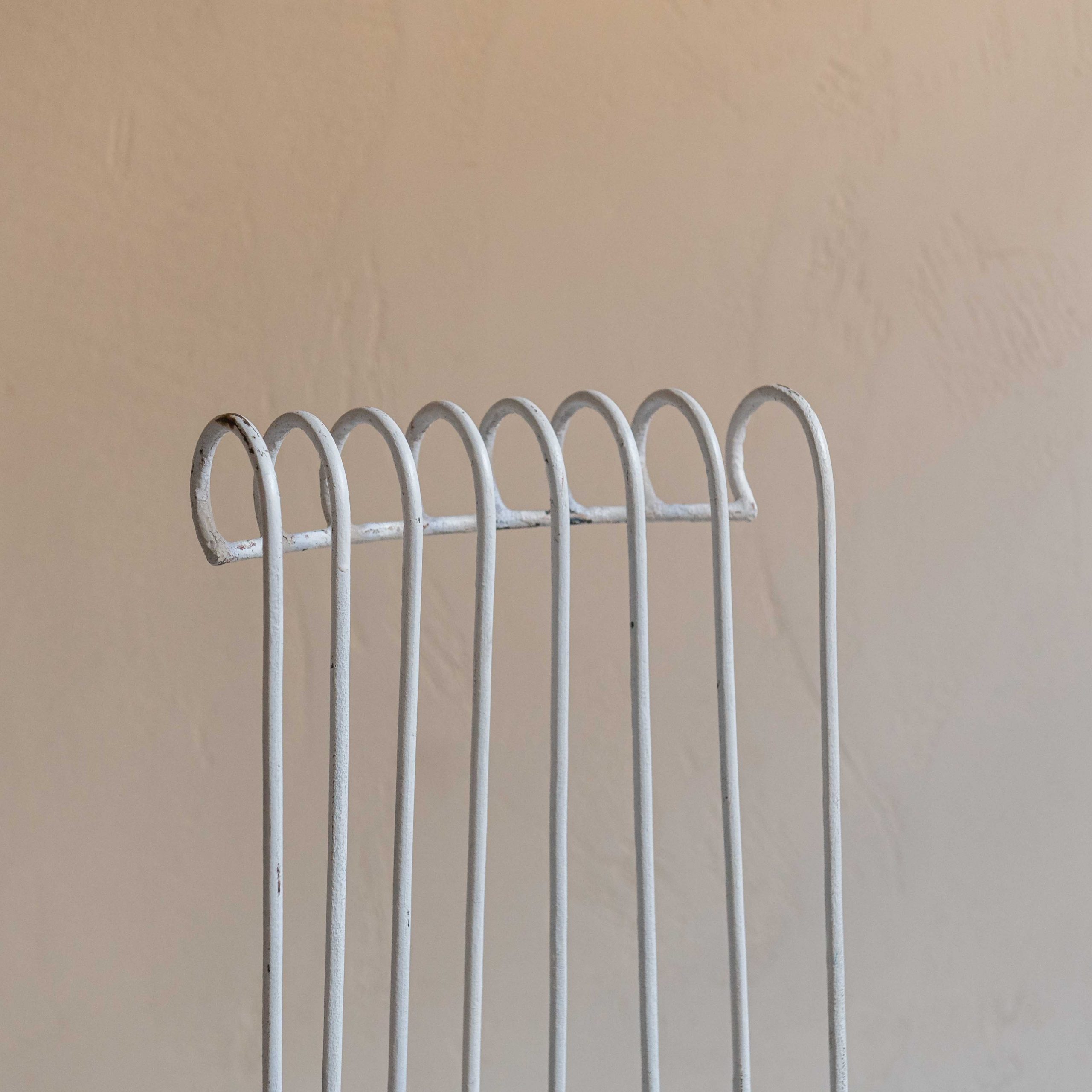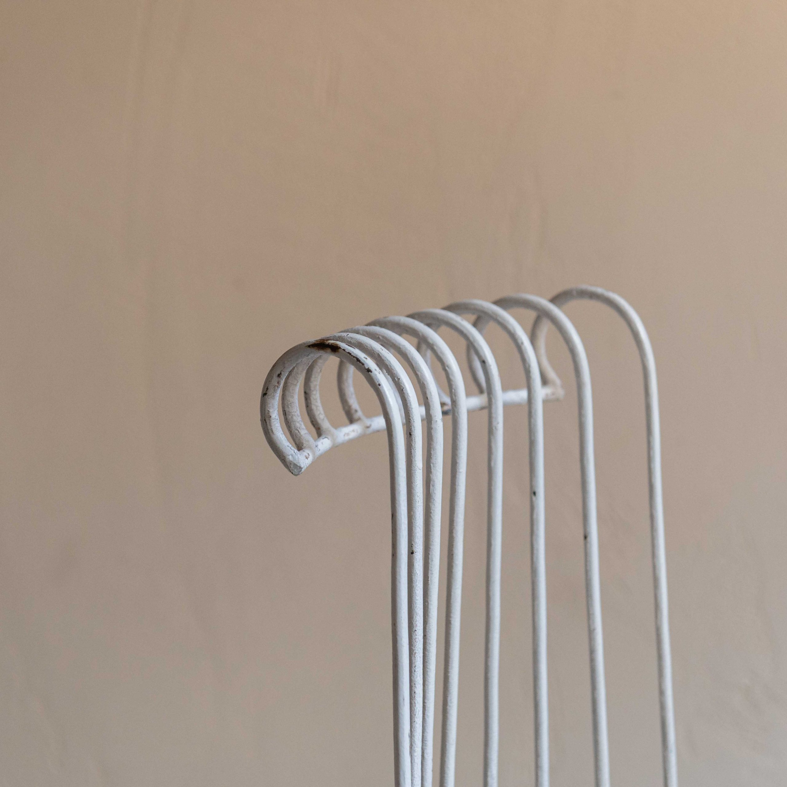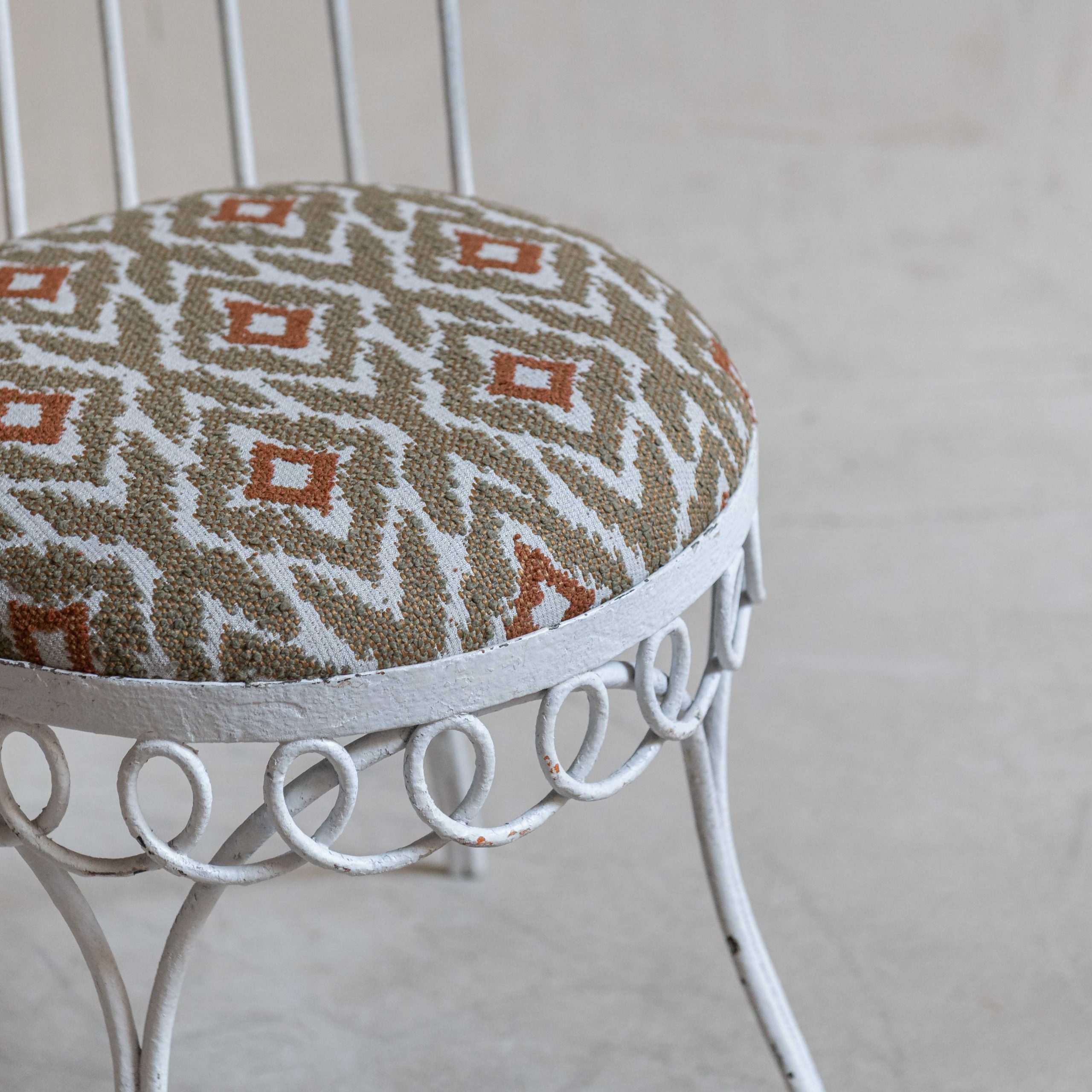 Conjunto de sillas de jardín Mid Century. Se trata de un conjunto de piezas con estructura de hierro forjada con esmero que revela un delicado equilibrio entre solidez y encanto. El hierro, trabajado en filigranas y curvas forma una pieza ornamentada que recuerda a los jardines románticos de épocas pasadas. La pintura blanca, envejecida por el paso del tiempo, se muestra con pequeñas grietas y zonas donde el óxido asoma suavemente, dándole un carácter nostálgico y encantador. Sus respaldos altos y curvados en la parte superior les dan un aire elegante y los asientos redondos están retapizados con una tela de inspiración étnica en bonitas tonos y apta para exterior, lo que añade un contraste vibrante y moderno. De estilo Mathieu Matégot -artista y diseñador húngaro afincado en París- estas sillas ponen la nota especial en cualquier espacio.