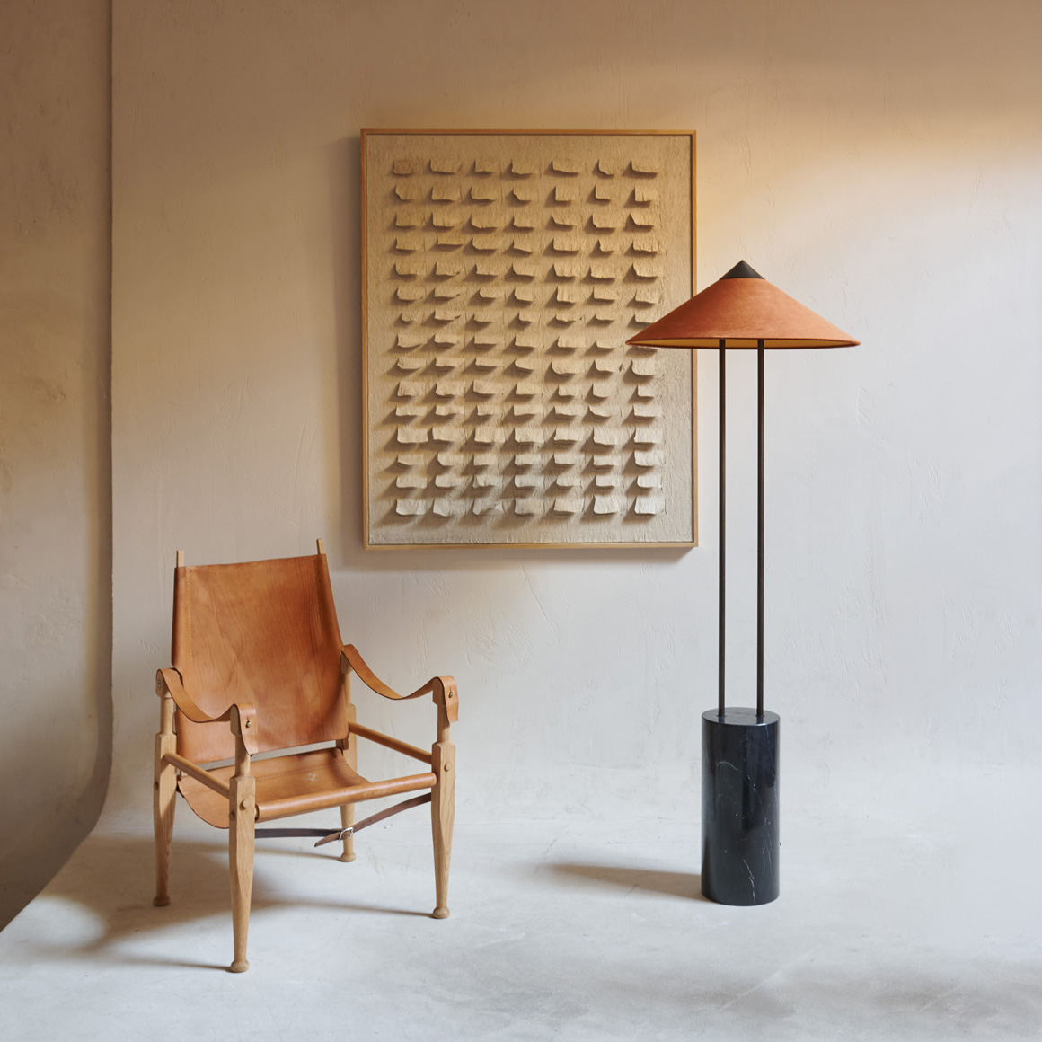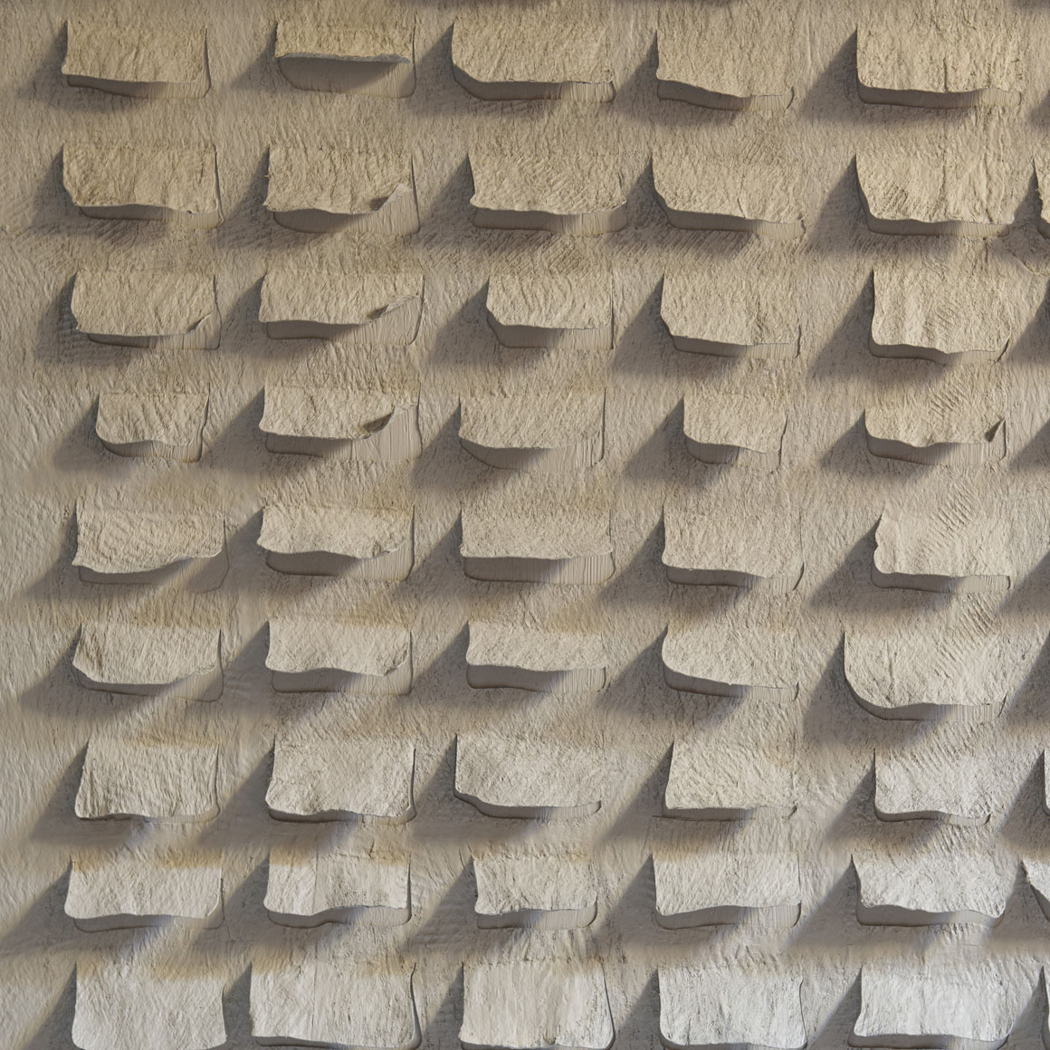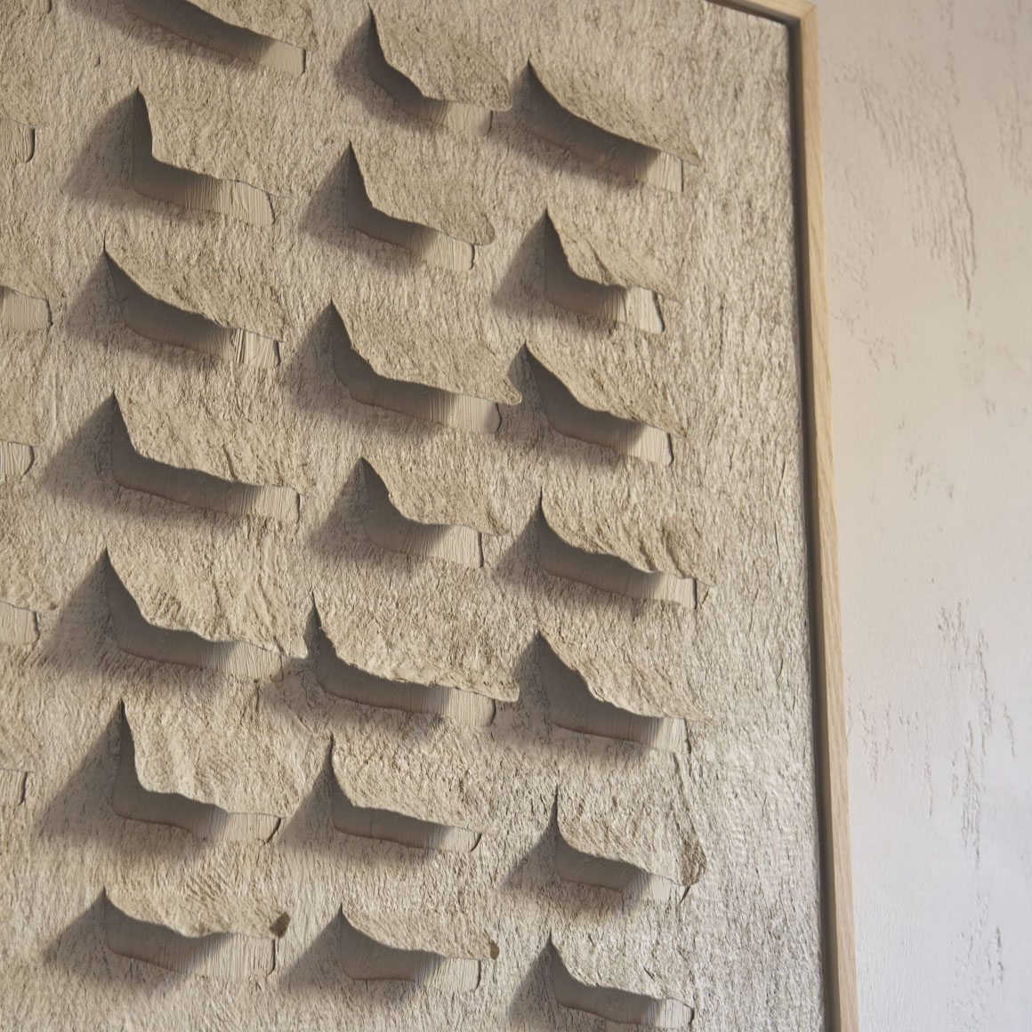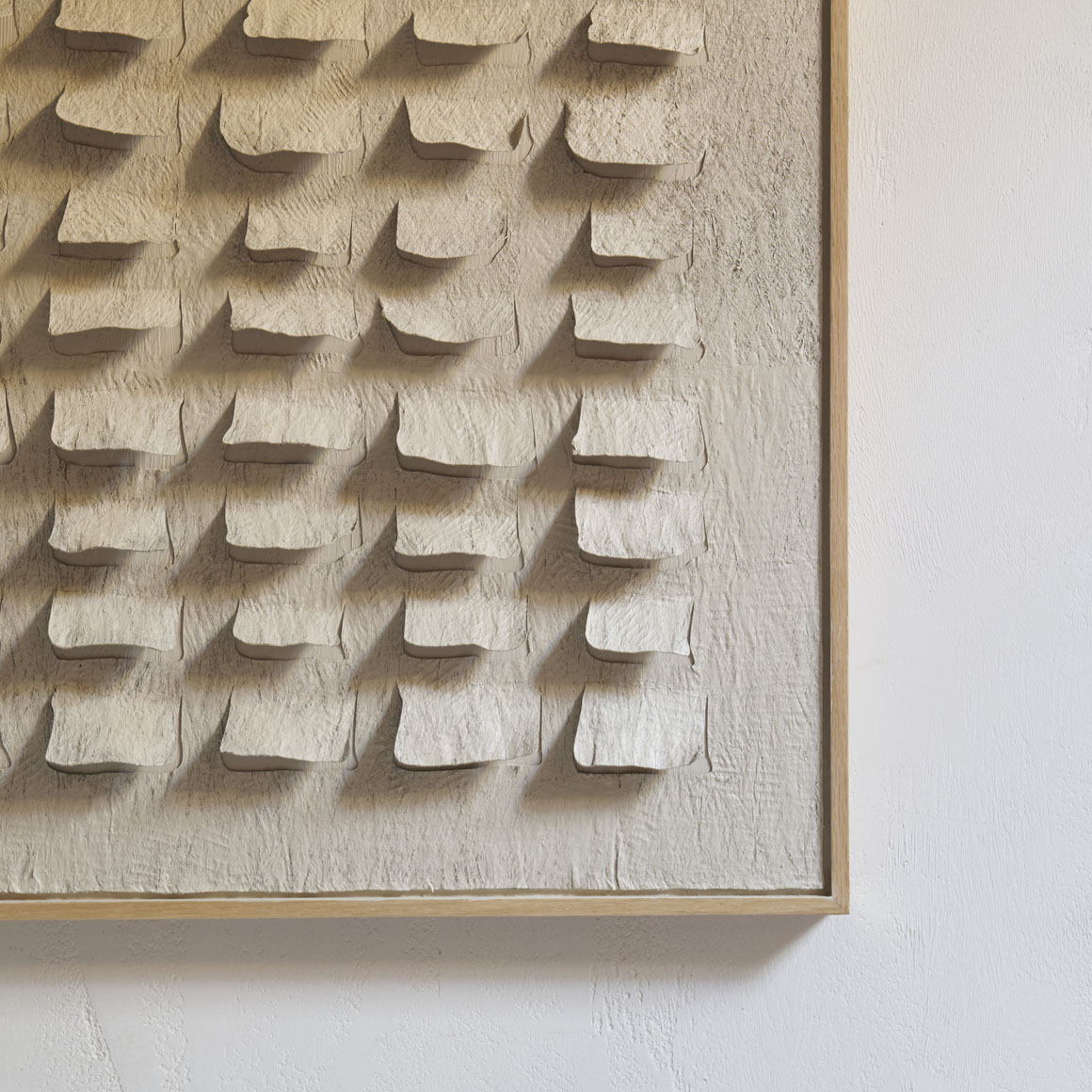 Obra abstracta con relieves. Se trata de una pieza artística de estilo minimalista y contemporáneo, enmarcada en madera clara resaltando su sencillez natural. La obra está compuesta por una serie de formas rectangulares blancas dispuestas en filas sobre un fondo texturizado también claro, creando un juego de sombras sutiles y profundidad visual. Una obra que transmite equilibrio y un cierto ritmo visual.