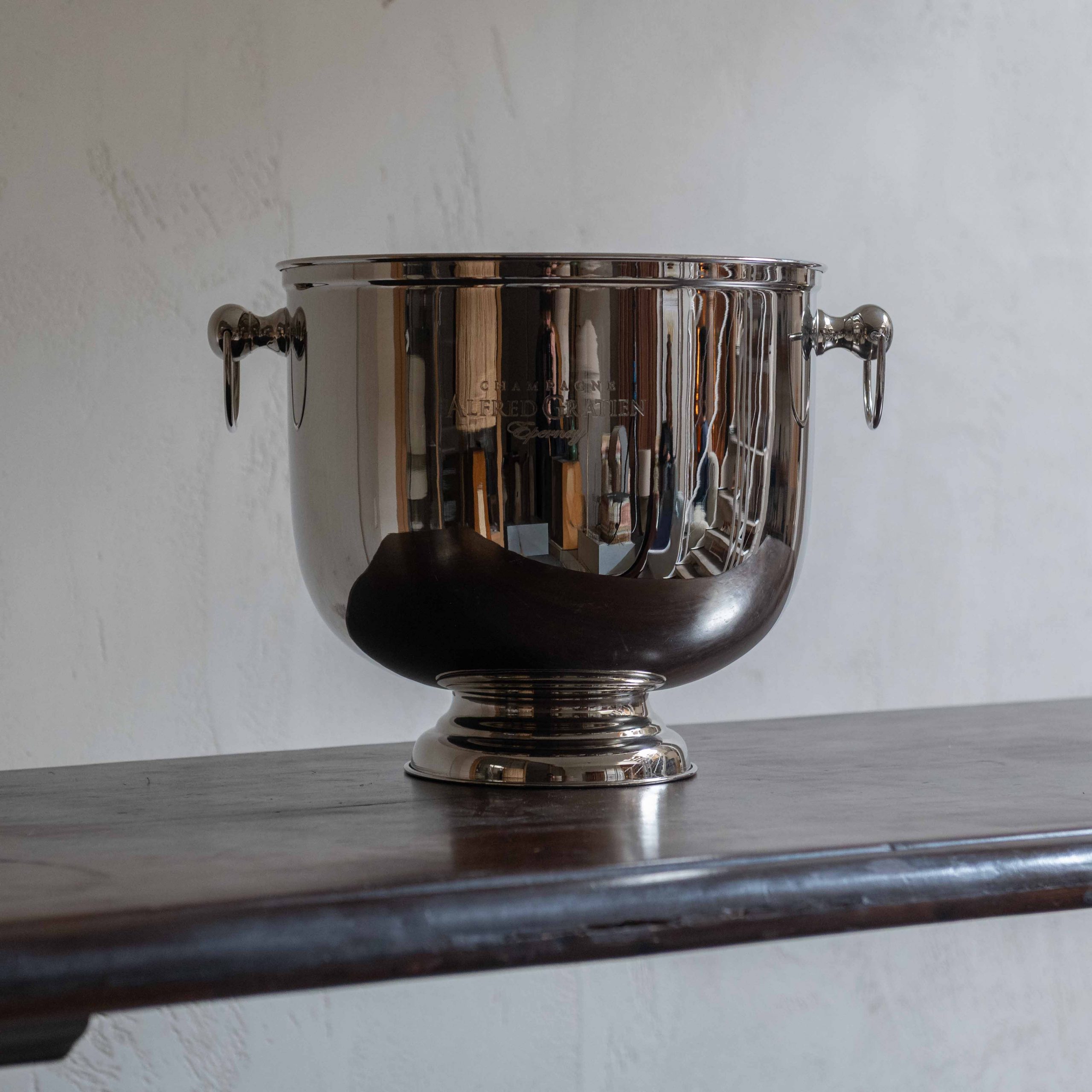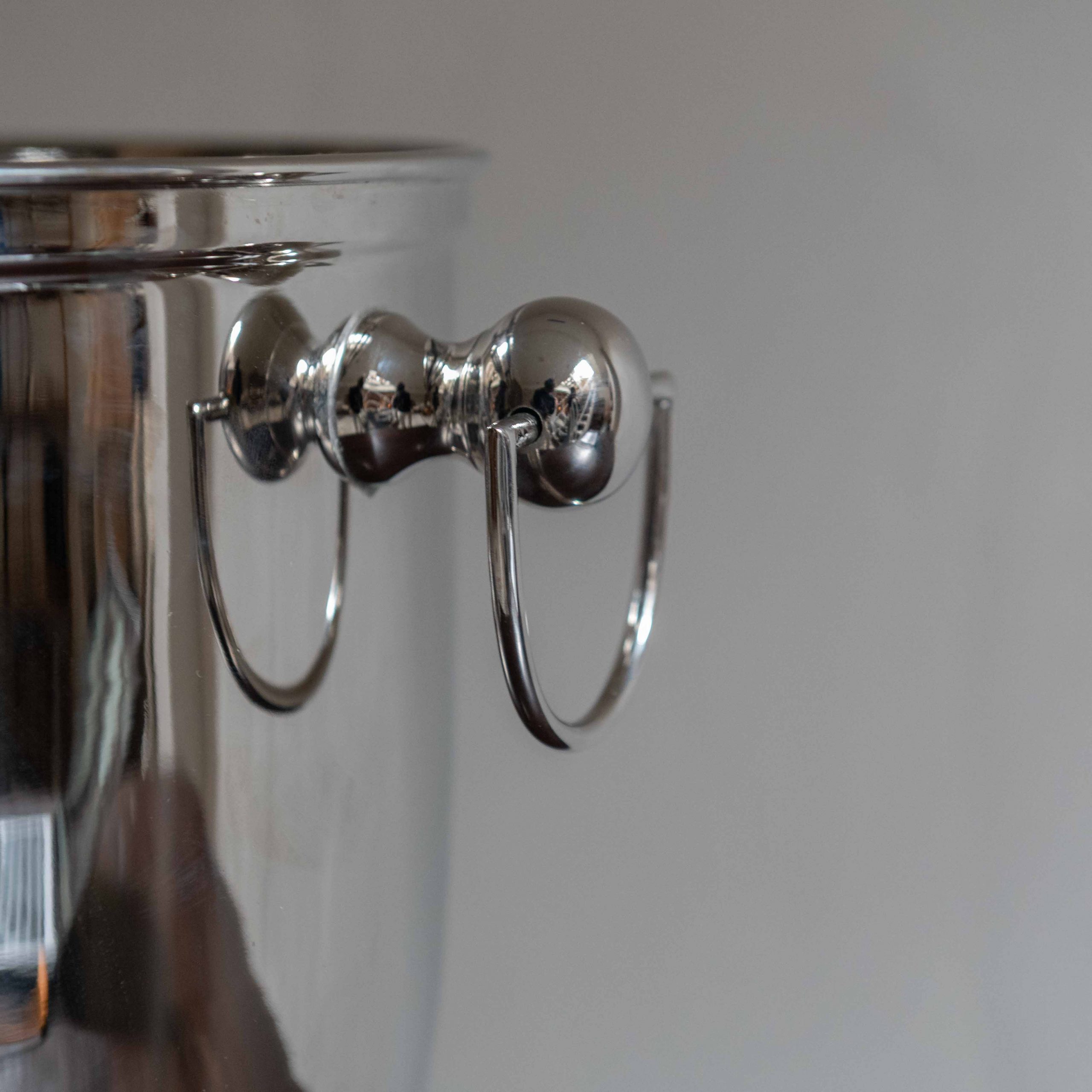 Champanera de níquel. Una pieza elegante y sofisticada cuya superficie metálica, pulida y brillante, refleja la luz con delicadeza, creando destellos suaves. El níquel, con su tono plateado profundo, le otorga un carácter refinado que se integra perfectamente tanto en mesas modernas como en ambientes clásicos. De líneas redondeadas y generosas, abraza las botellas con delicadeza, manteniendo el frío del hielo y permite gran capacidad.