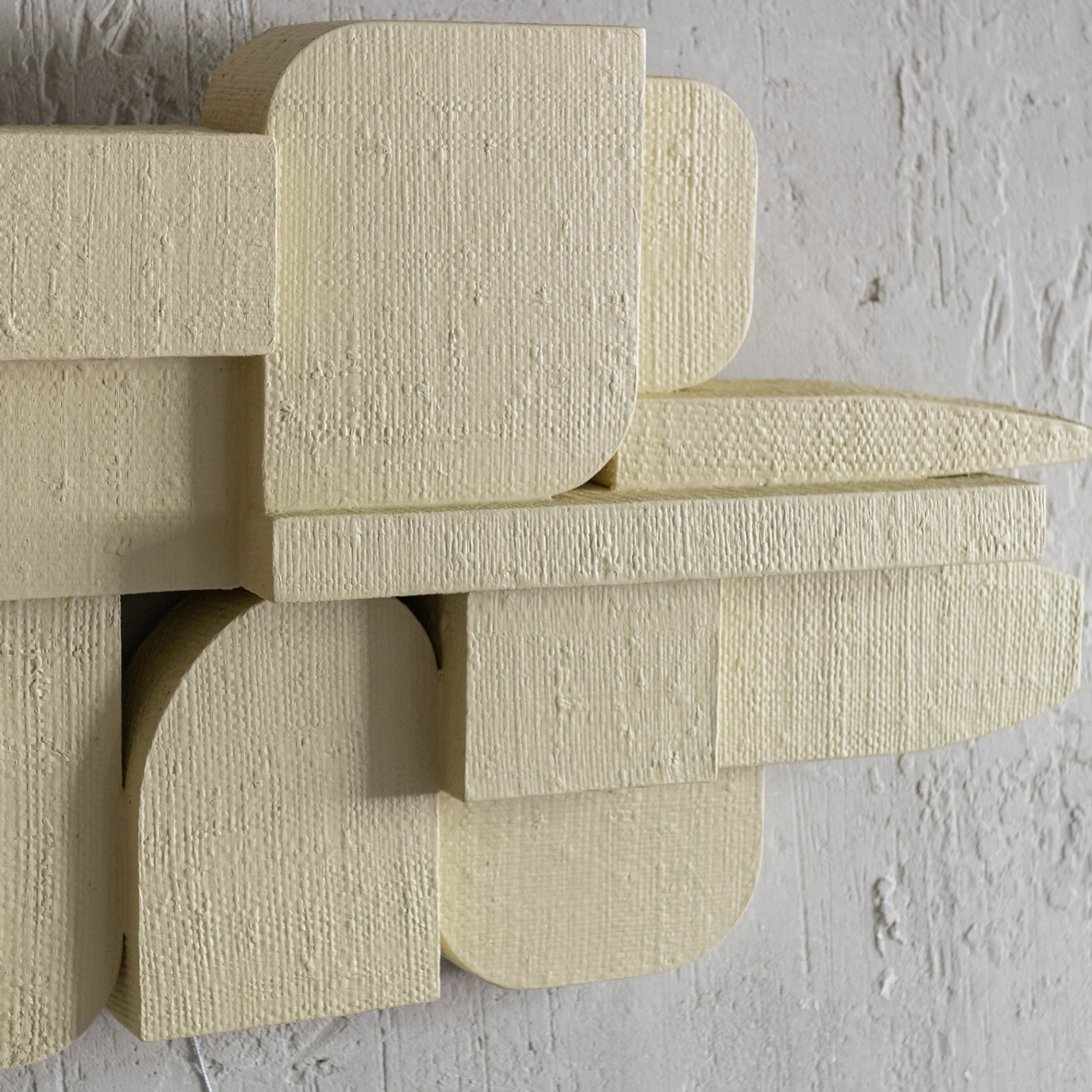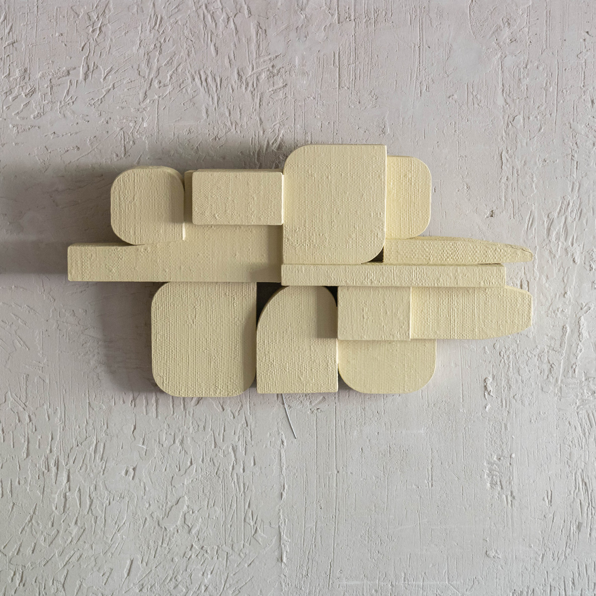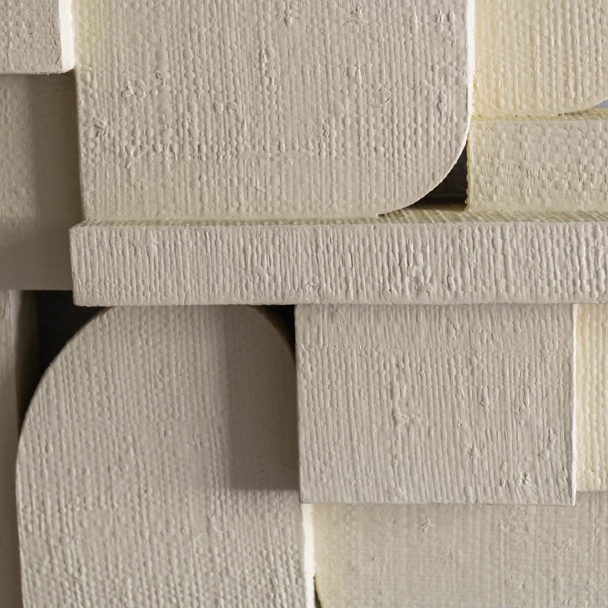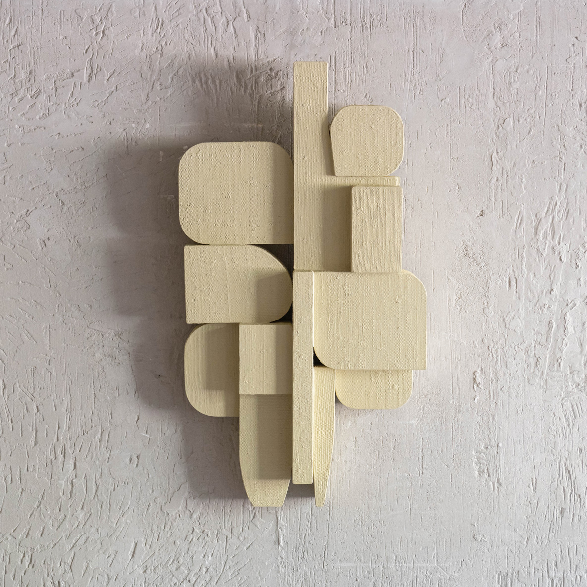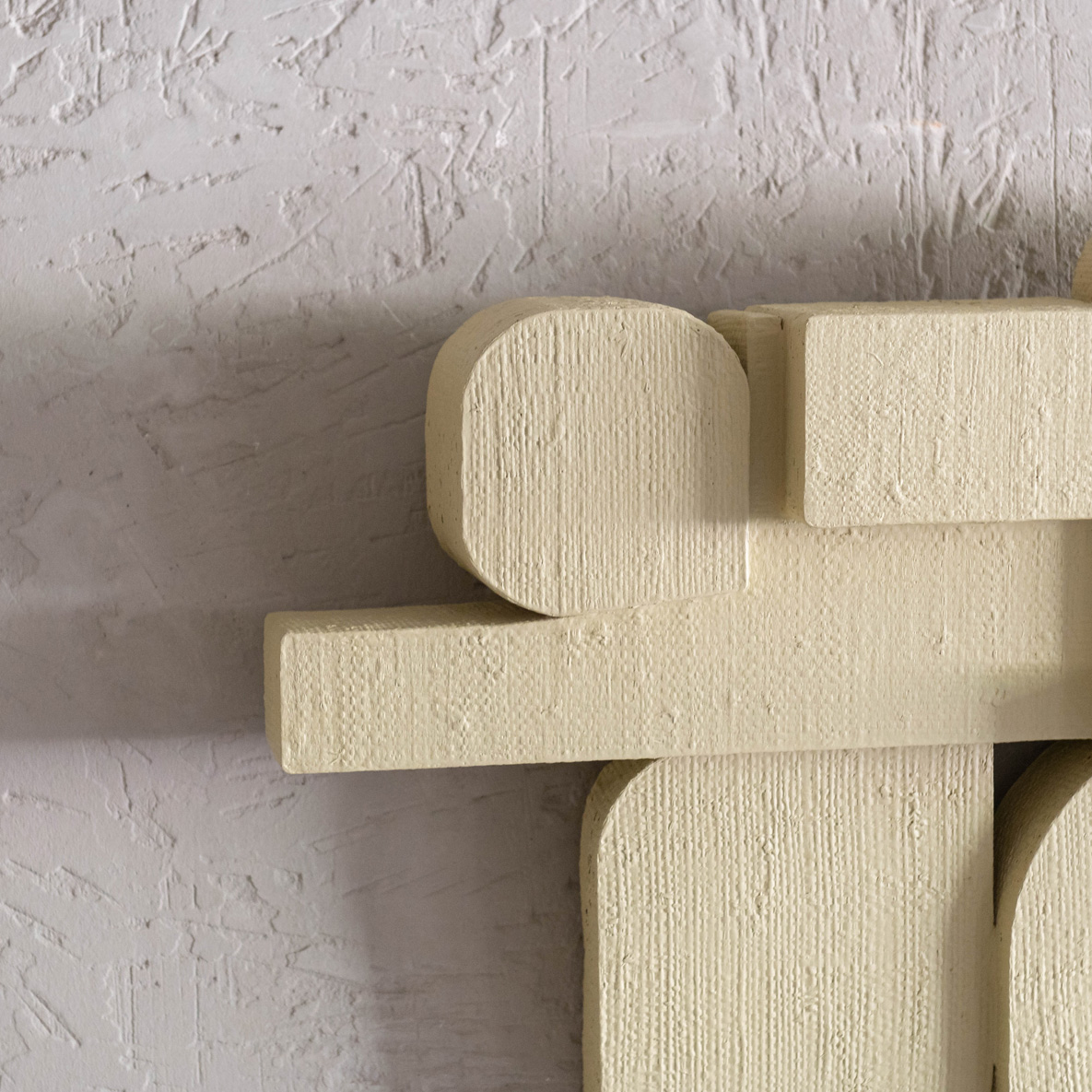 Escultura de pared modernista. Esta escultura cautiva con su diseño contemporáneo y sofisticado, donde las formas geométricas se entrelazan con una fluidez encantadora. Los bloques rectangulares y cuadrados, de suaves bordes redondeados, se combinan en una estructura que se puede colocar vertical u horizontal que parece bailar con la luz. El tono neutro y cálido del blanco roto le otorga una sensación de armonía y serenidad, mientras que las intersecciones y superposiciones de las piezas crean un juego de texturas sutil pero cautivador. Fabricada con tejido de palma.