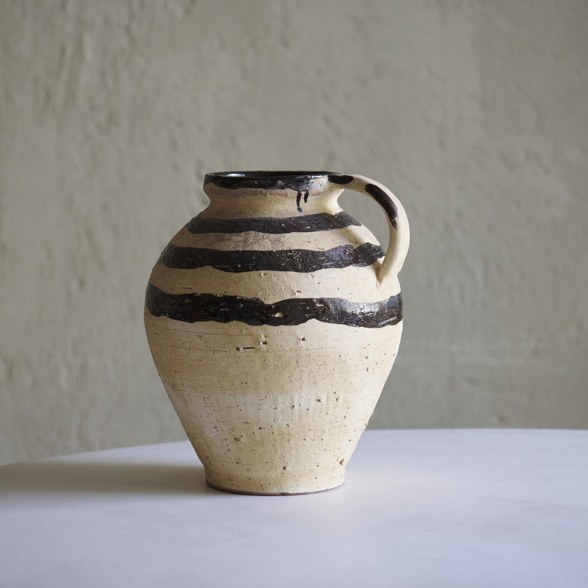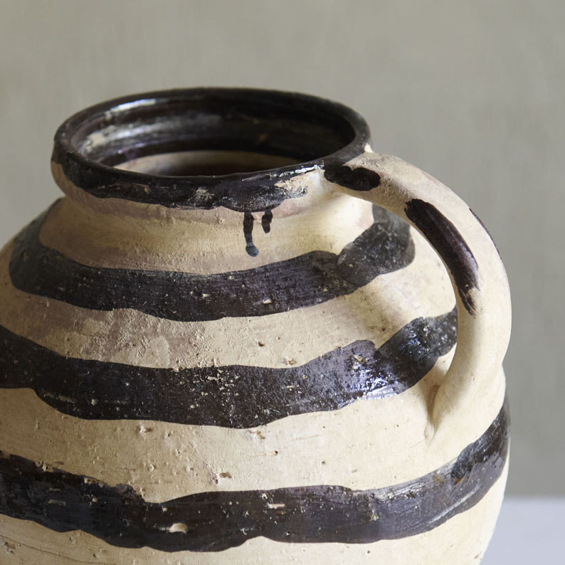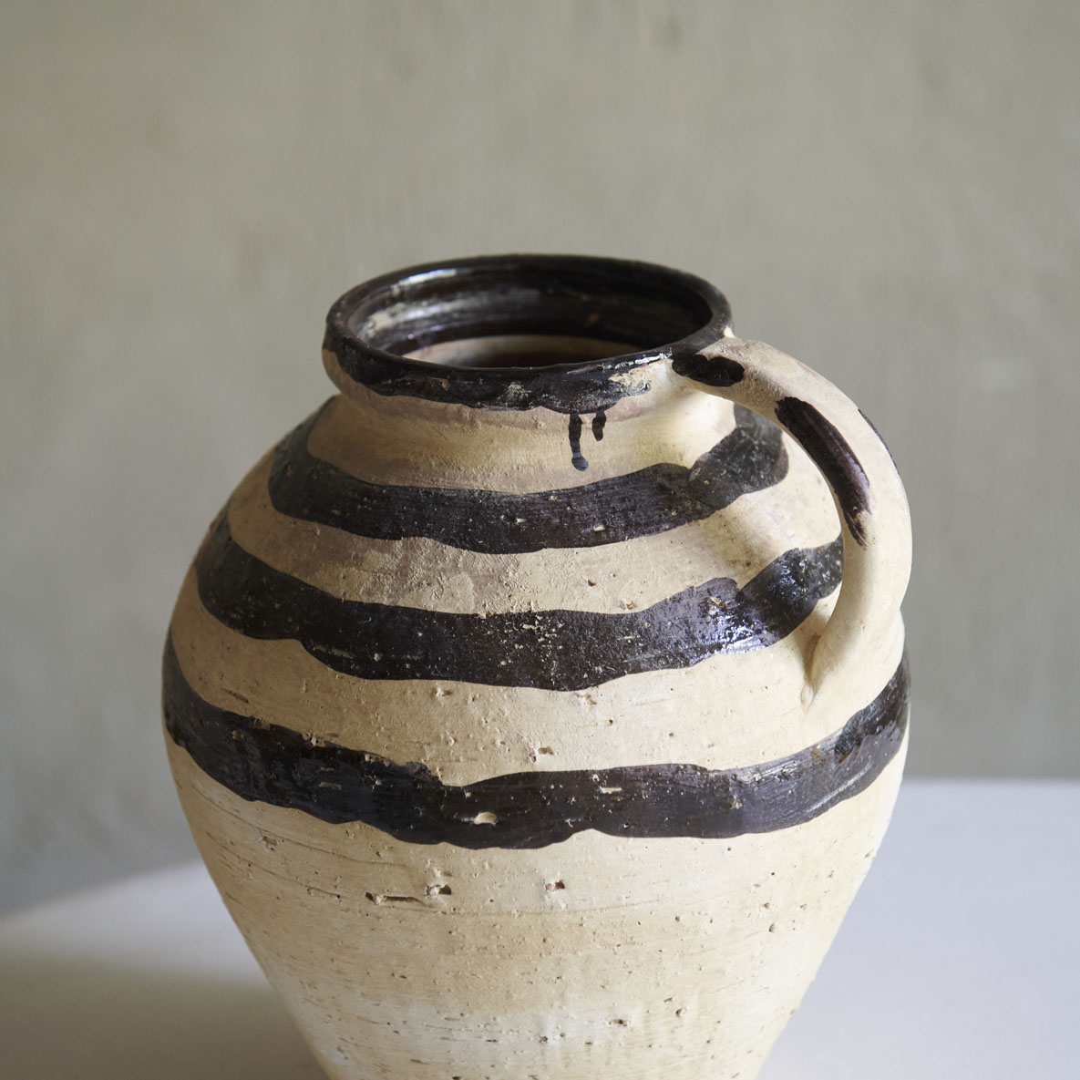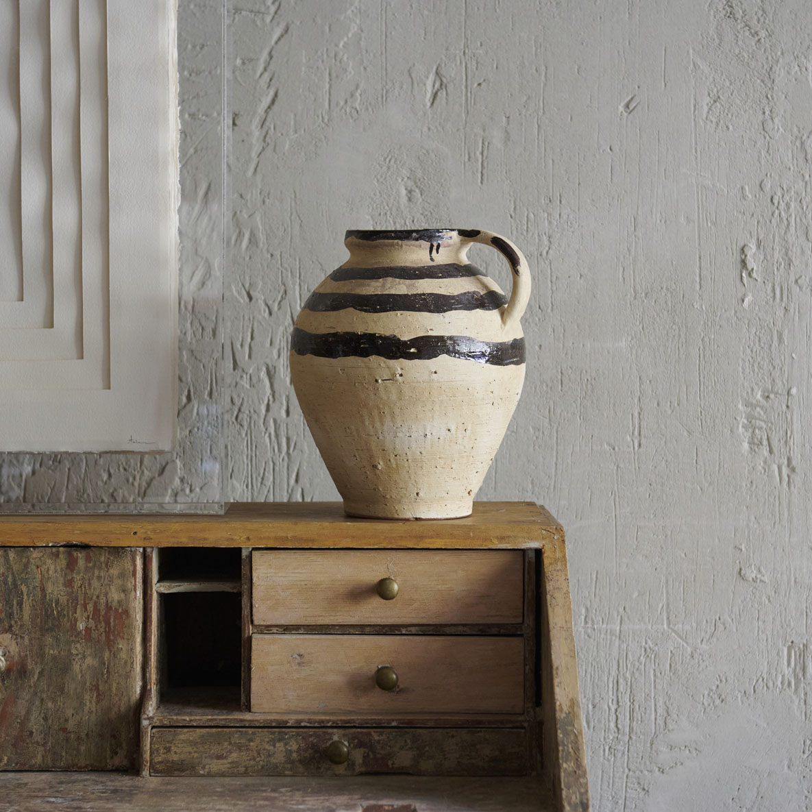 Jarra antigua de barro. Una pieza muy especial procedente de Asia que emana artesanía pura. Con bonitos con detalles a rayas, está elaborada a mano y es única en cada pieza.