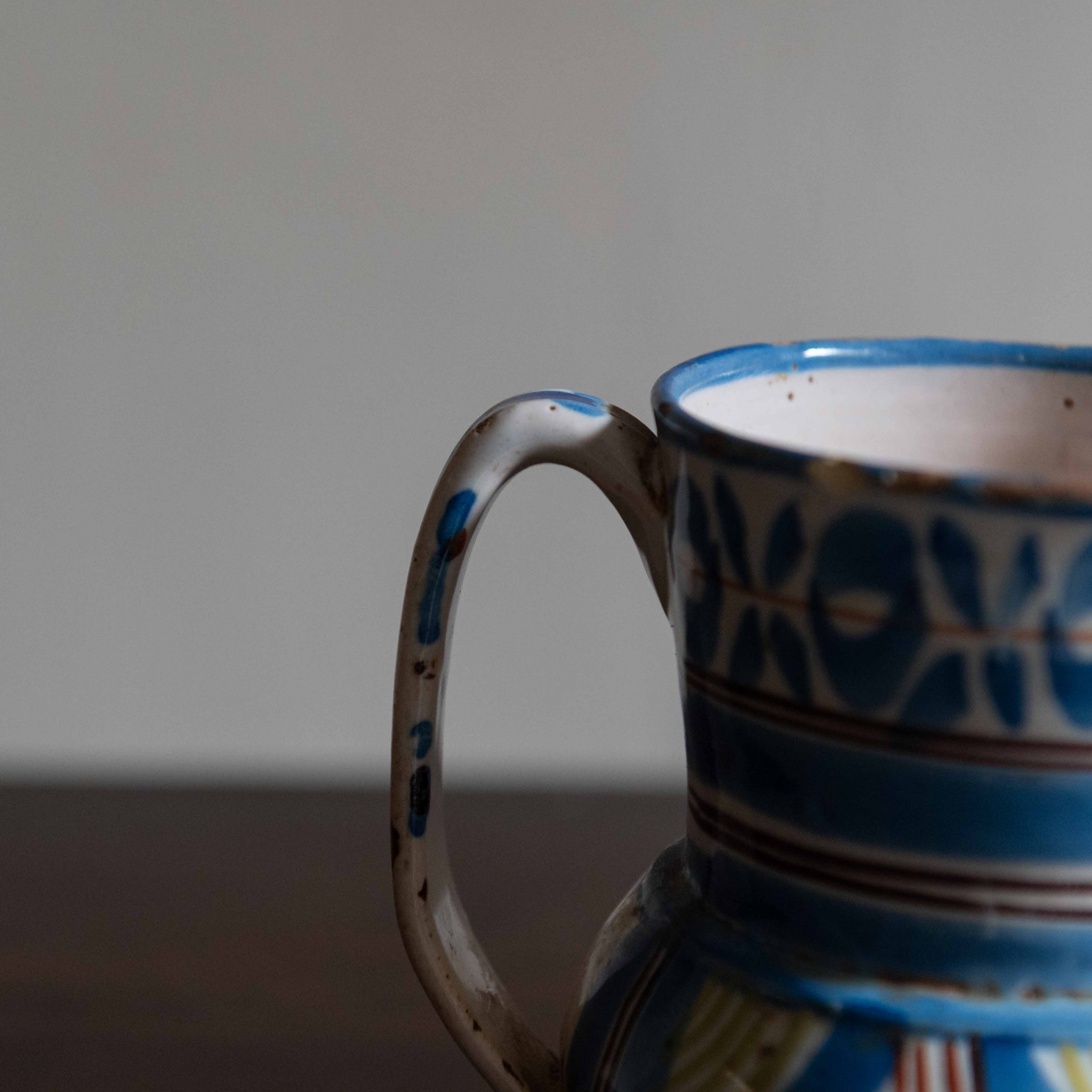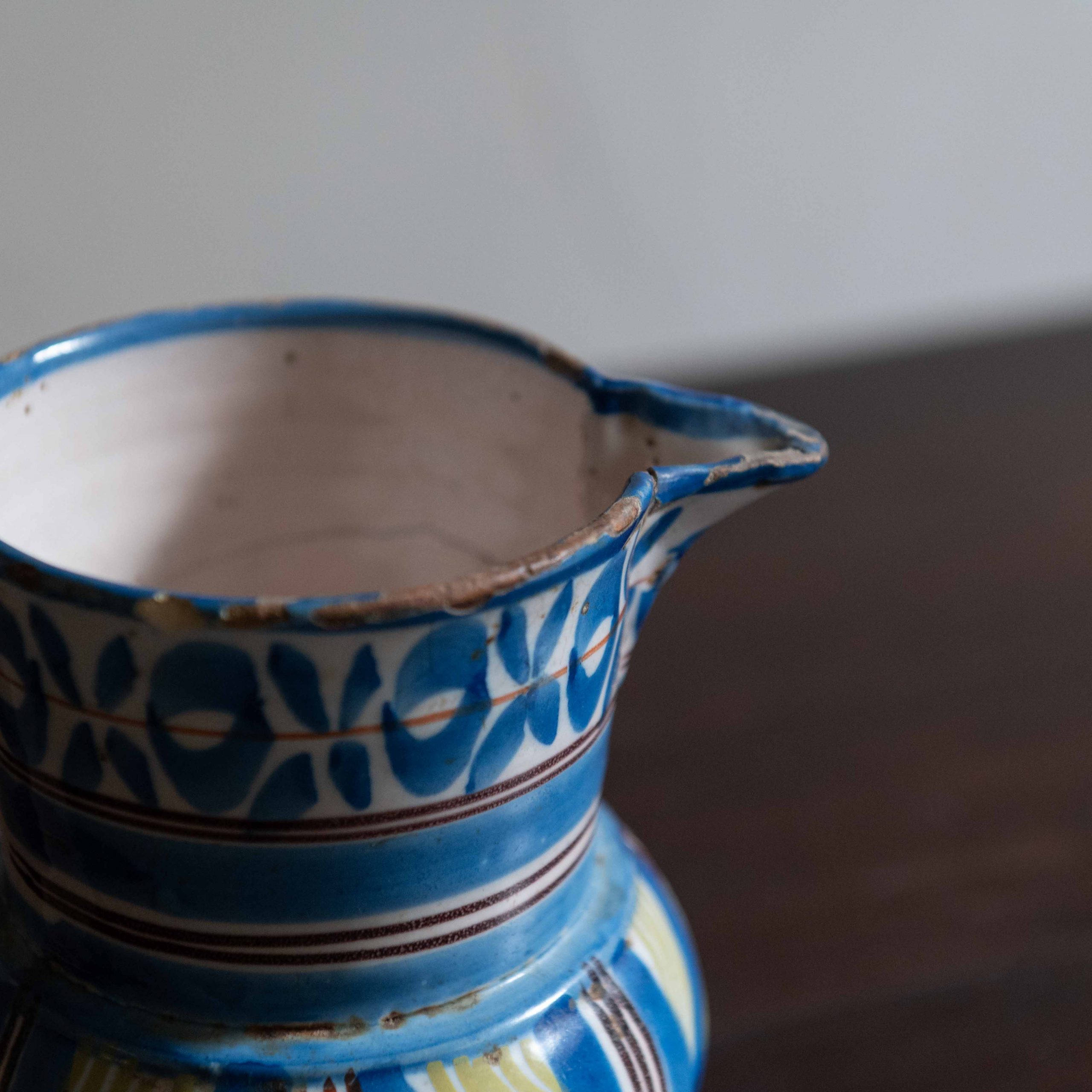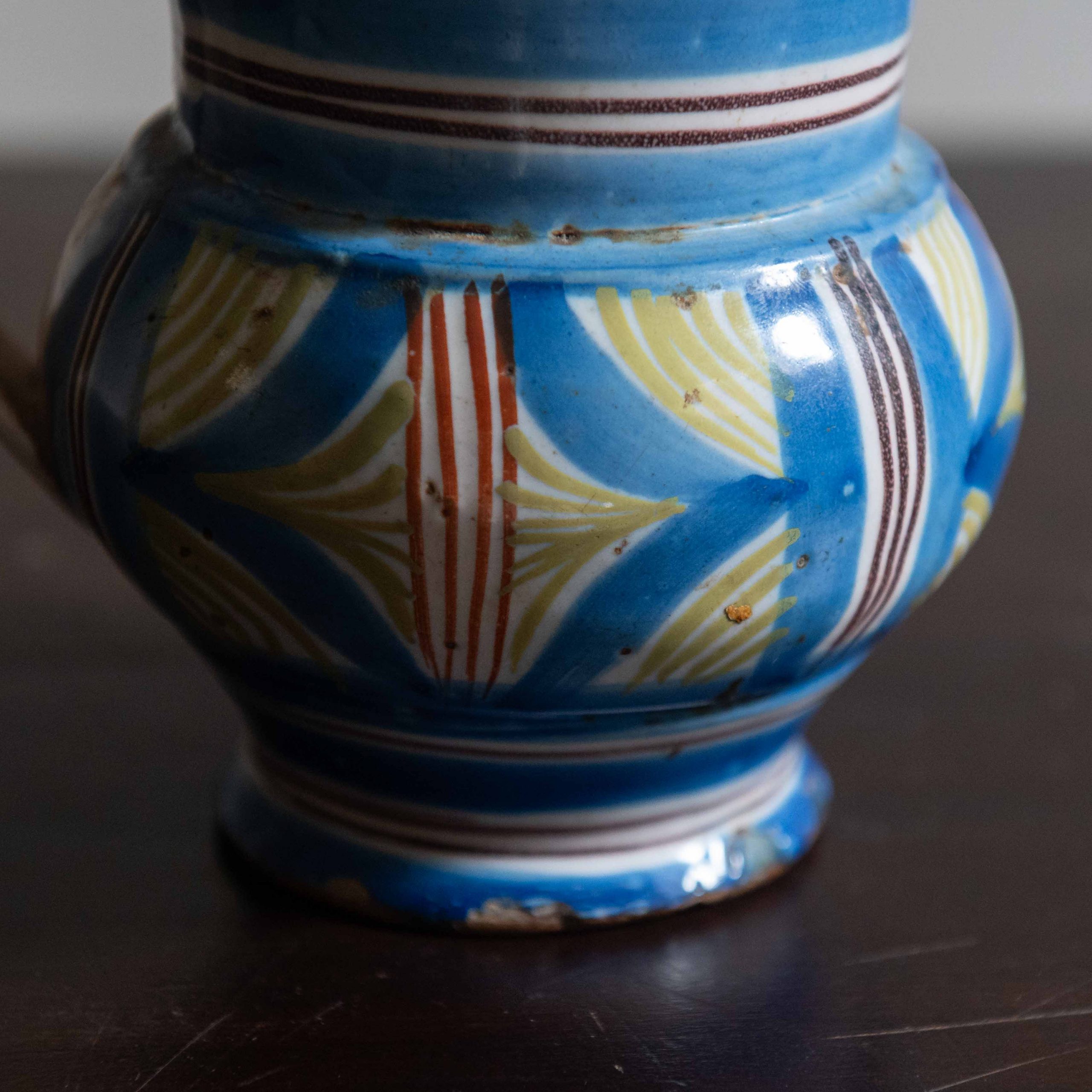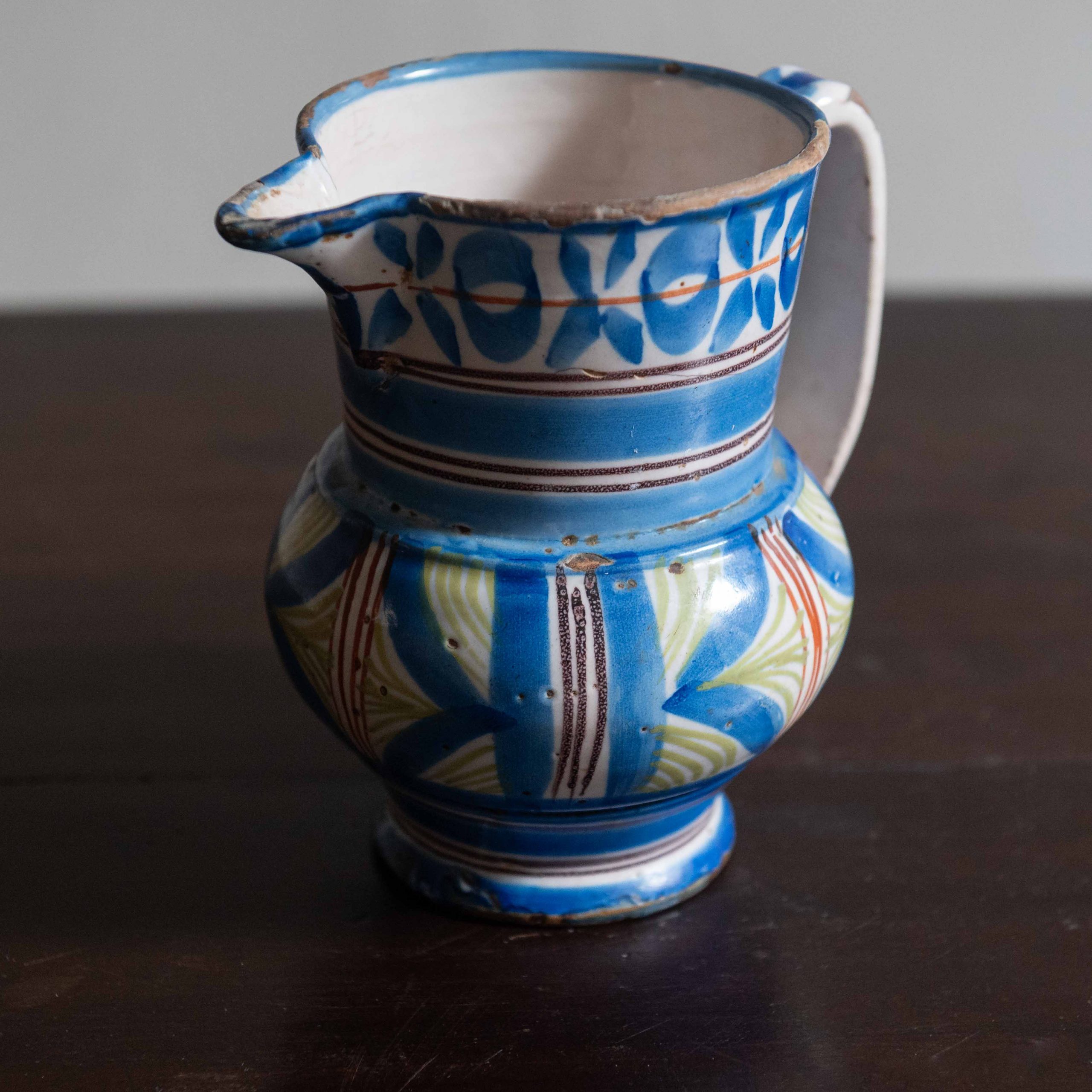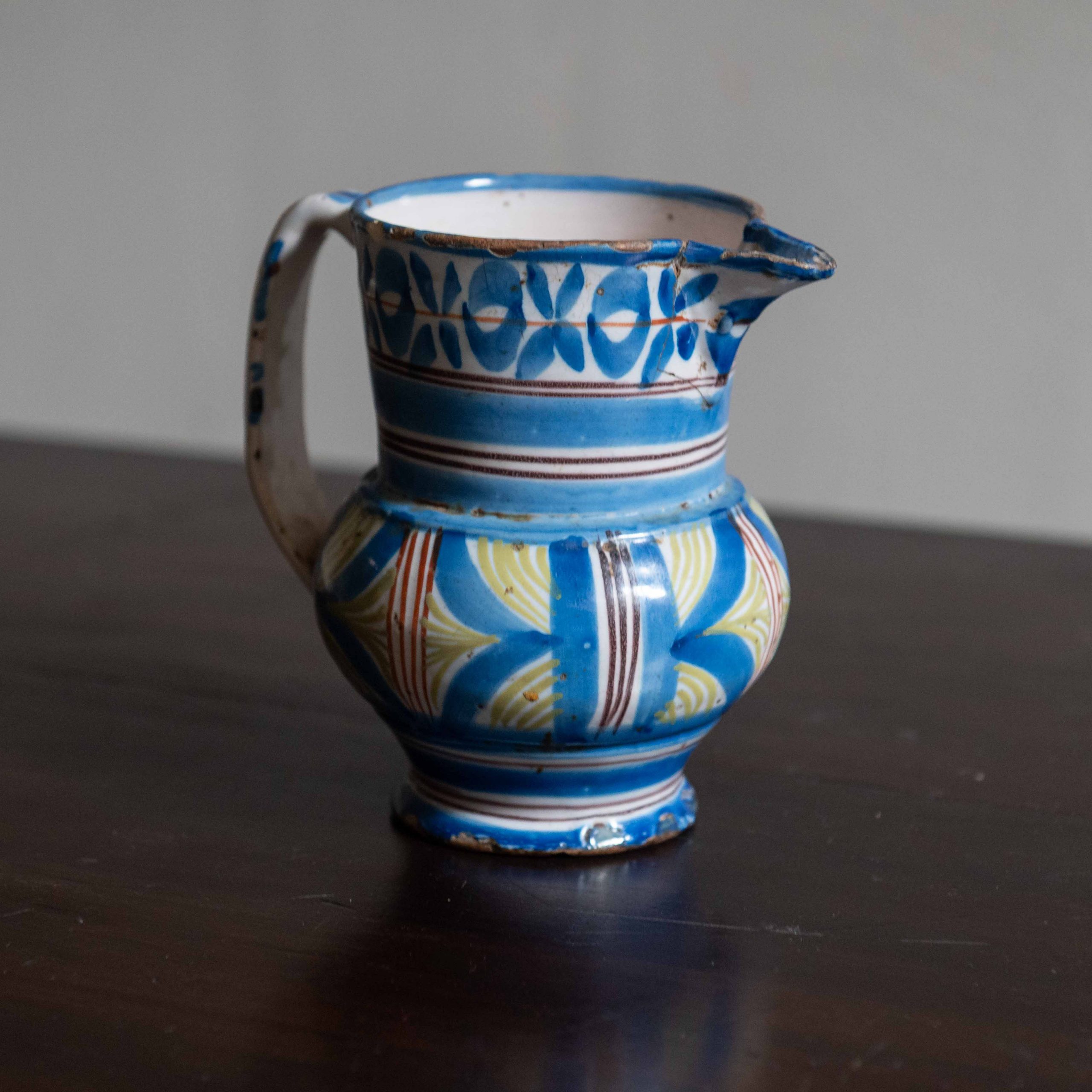 Jarra de cerámica levantina siglo XIX colores S. Una pequeña jarra completamente artesanal típica del Levante español con su predominio de azules y blancos. Incorpora también en sus formas geométricas tonos verdes y marrones más sutiles. Una pieza que muestra el desgaste y la pátina propios de una antigüedad auténtica.