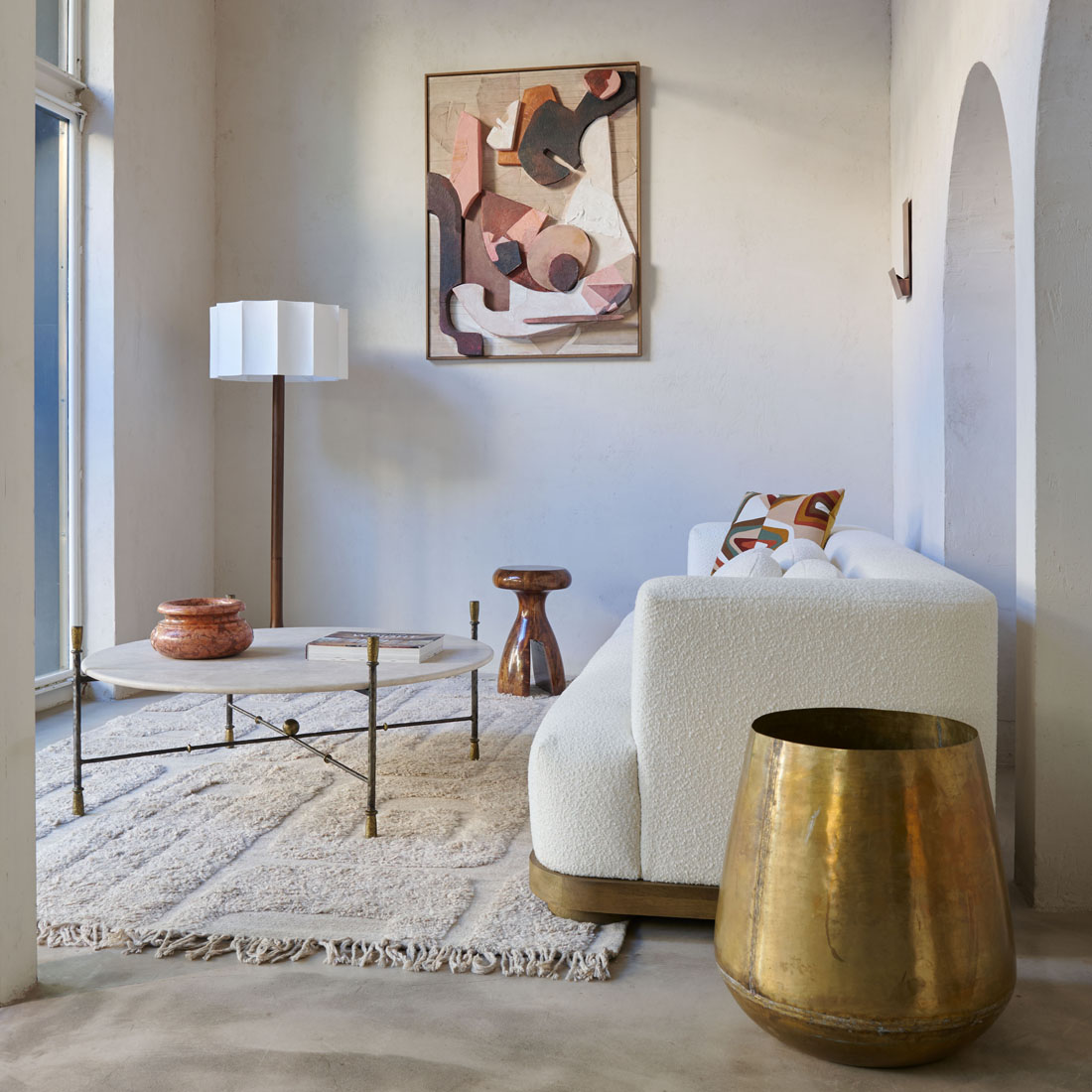 Jarrón de latón antiguo XL. Una pieza de apariencia elegante, con una pátina dorada que solo el paso del tiempo puede otorgar. Su superficie presenta ligeros desgastes y marcas que narran historias de su antigüedad, lo que lo convierte en una pieza única llena de carácter. Tiene una forma redonda y maciza en la base que se va estrechando hacia el cuello, coronado por un borde delicadamente curvado. Perfecto como elemento decorativo y para utilizar como macetero.