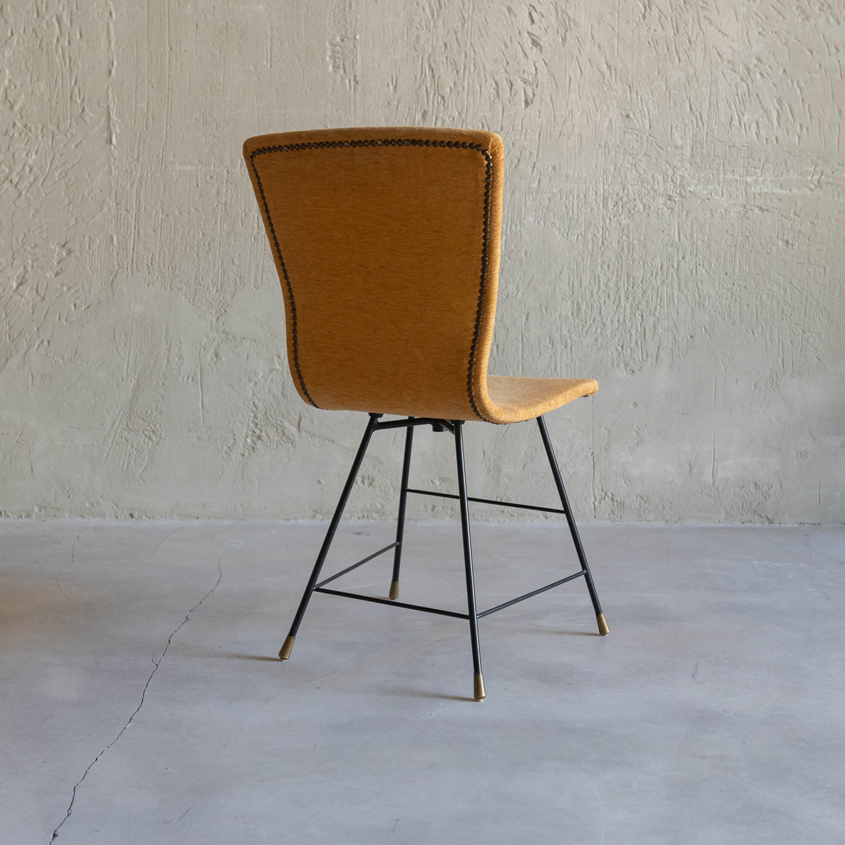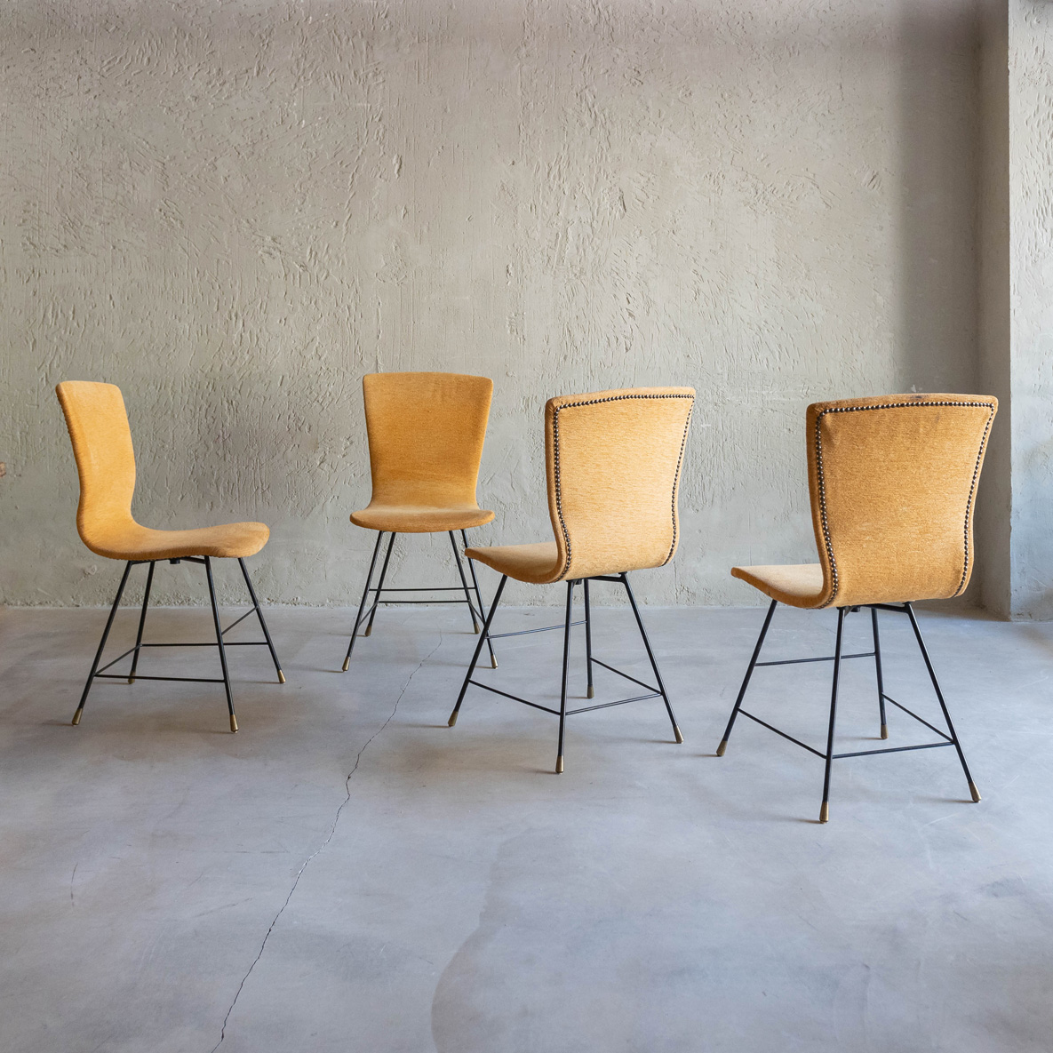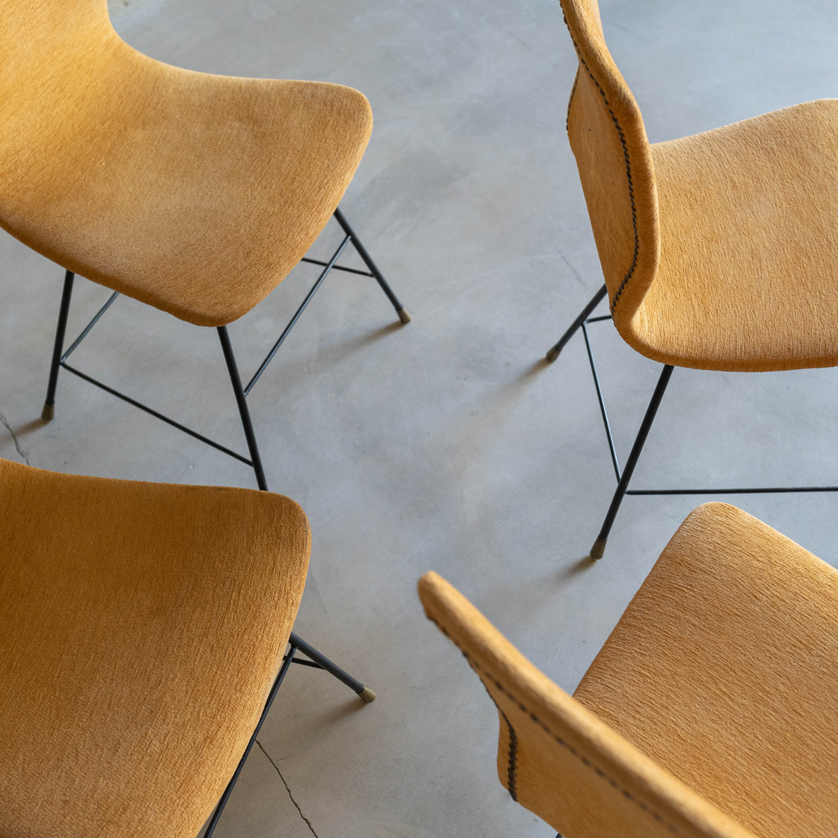 Juego de cuatro sillas Mid Century mostaza. Con un encanto vintage muy especial, estas sillas presentan respaldo curvado y un bonito tapizado en cálido tono mostaza, que les da un aire acogedor y elegante a la vez. El borde está delicadamente rematado con tachuelas metálicas que aportan un toque clásico y artesanal, resaltando la silueta suavemente envolvente de la estructura. Las patas delgadas de metal negro, unidas por travesaños geométricos, evocan un diseño industrial sutil y sofisticado y van rematadas con un bonito detalle en latón.