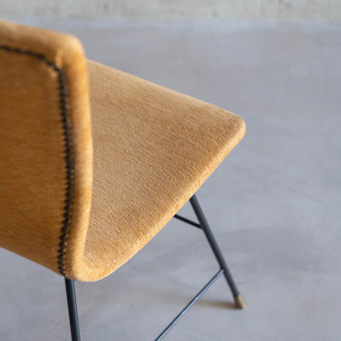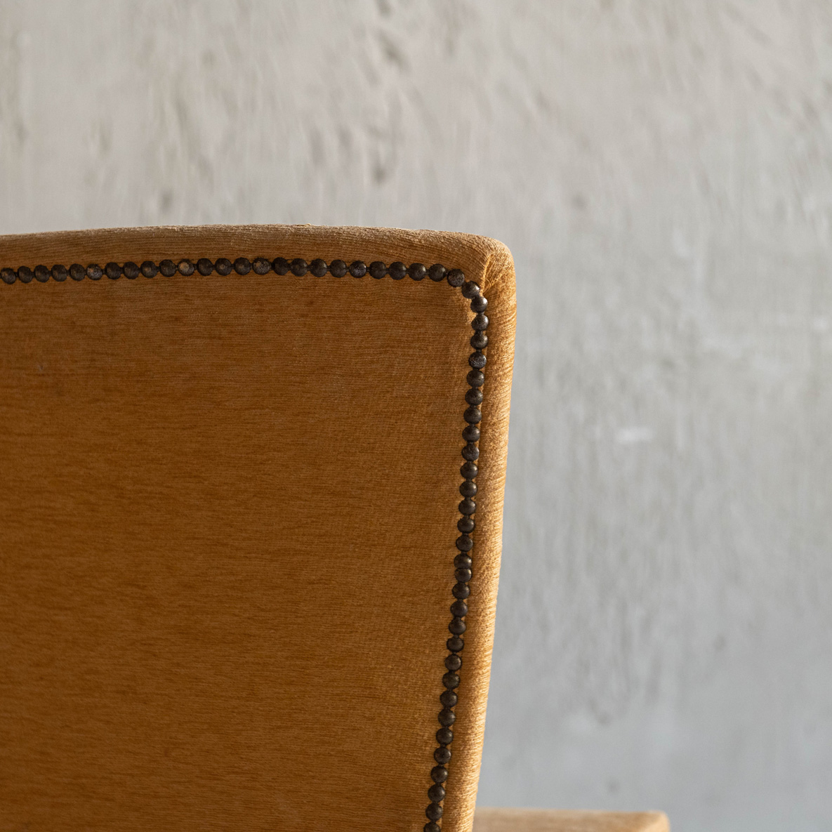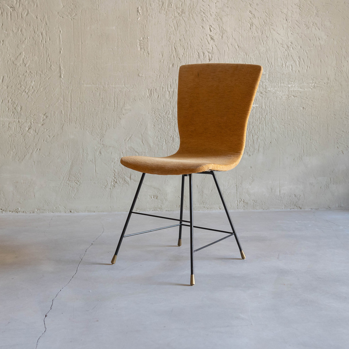 Juego de cuatro sillas Mid Century mostaza. Con un encanto vintage muy especial, estas sillas presentan respaldo curvado y un bonito tapizado en cálido tono mostaza, que les da un aire acogedor y elegante a la vez. El borde está delicadamente rematado con tachuelas metálicas que aportan un toque clásico y artesanal, resaltando la silueta suavemente envolvente de la estructura. Las patas delgadas de metal negro, unidas por travesaños geométricos, evocan un diseño industrial sutil y sofisticado y van rematadas con un bonito detalle en latón.