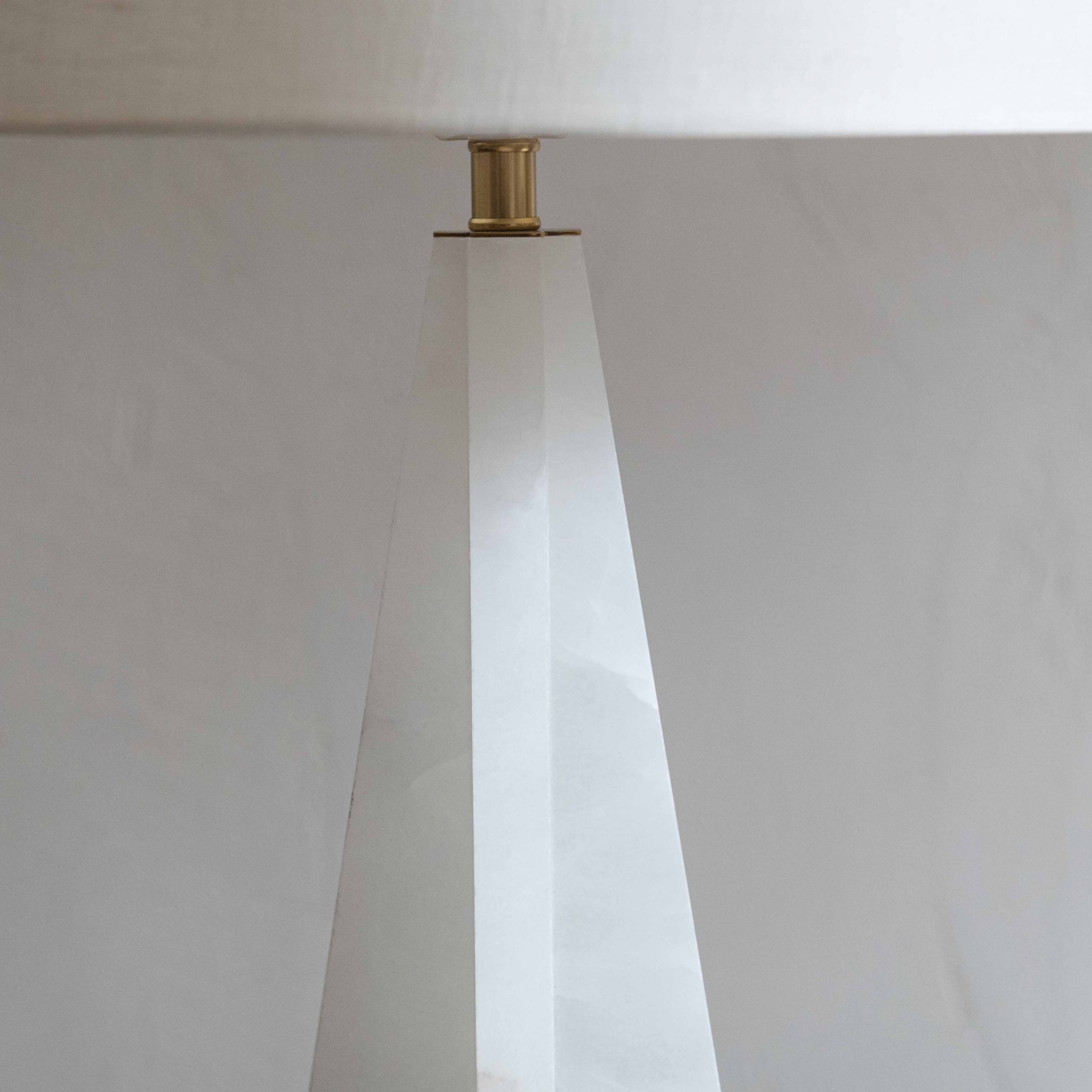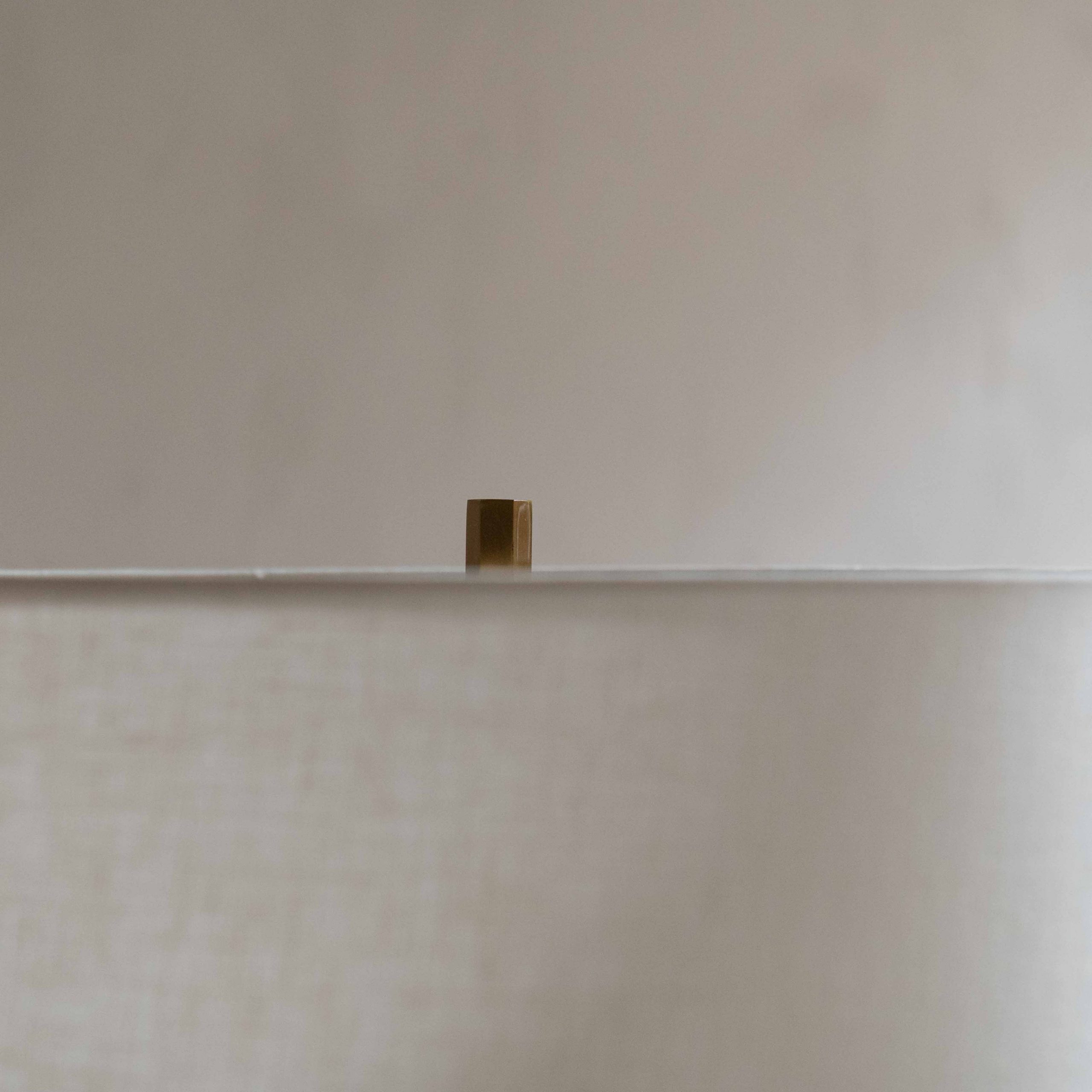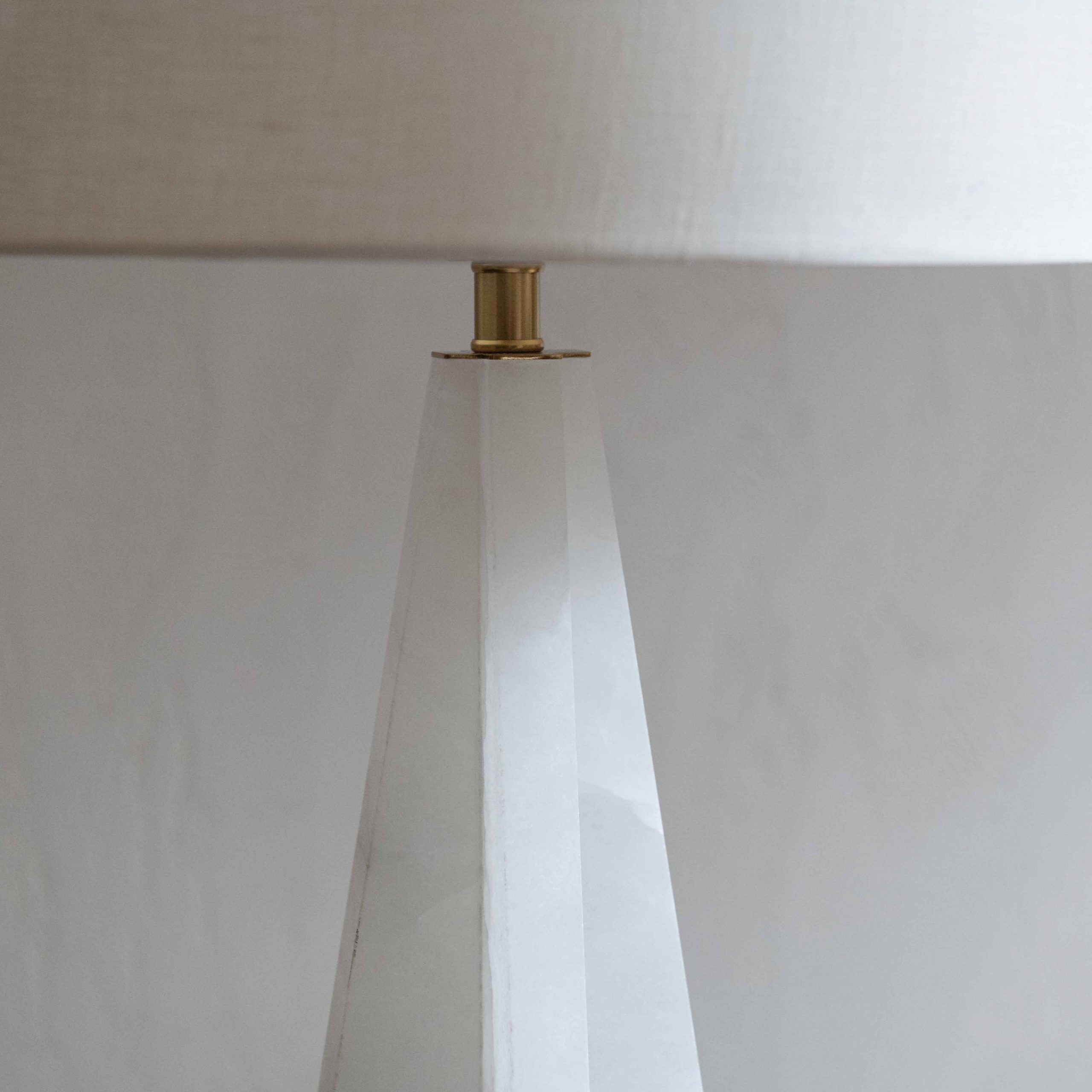 Lámpara de mesa de alabastro con pantalla de lino. Una pieza que destaca por su base de alabastro macizo, cuidadosamente tallada en cuatro prismas que aportan carácter y sofisticación. Se completa con una fina pantalla cilíndrica de lino blanco que difunde la luz con suavidad. La lámpara incorpora pequeños detalles en latón, que añaden un toque de elegancia atemporal.