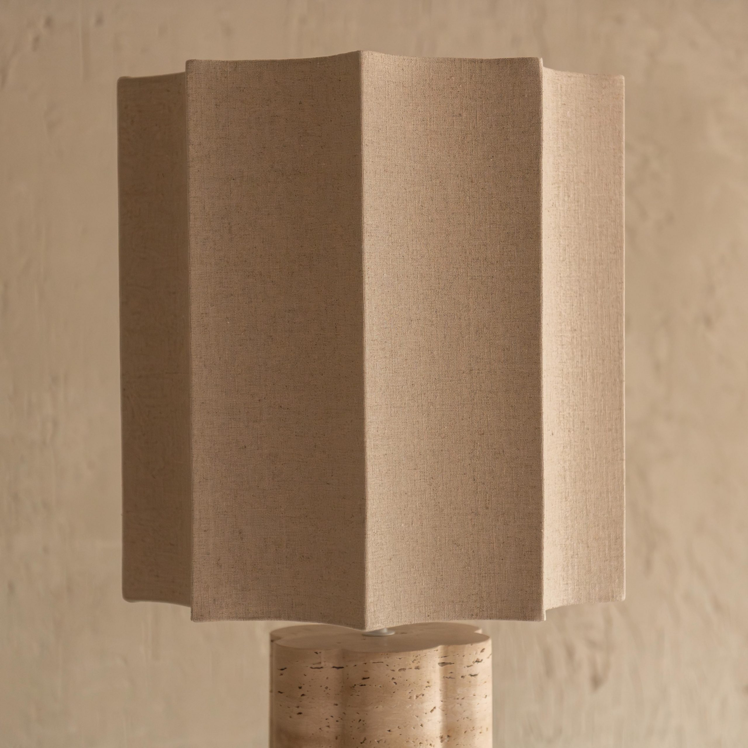 Lámpara de mesa de travertino romano. Preciosa pieza con base travertino natural que presenta texturas únicas en tonos tierra, dando un toque sofisticado tanto a interiores modernos como tradicionales. Lleva incluida una original pantalla de lino con sinuosas formas.