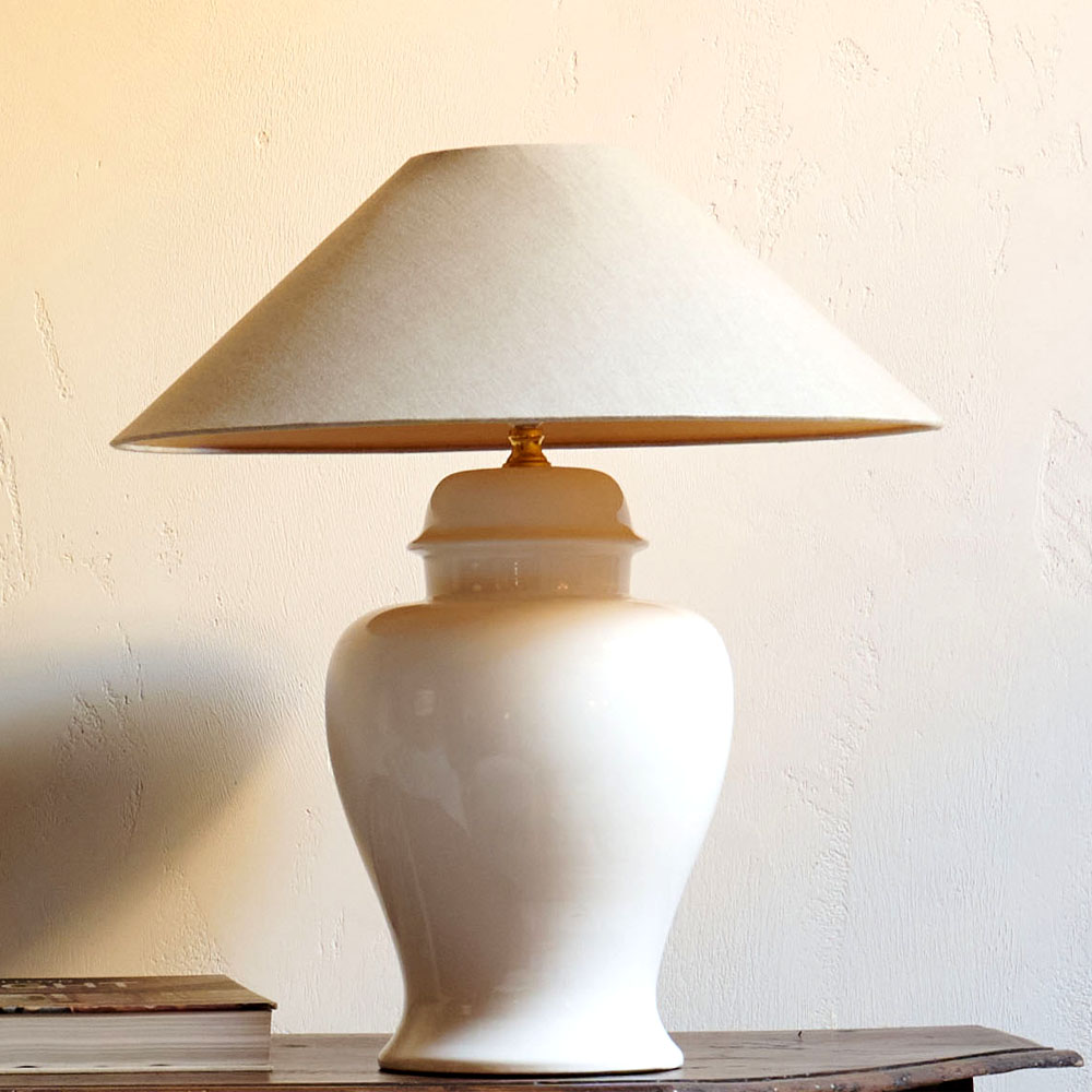 Lámpara de mesa vintage de cerámica blanca. Elaborada artesanalmente en cerámica esmaltada y con forma de tibor oriental, esta lámpara de mesa tiene una presencia serena y elegante. Su base de cerámica, de un blanco suave y luminoso, presenta una silueta clásica inspirada en los jarrones tradicionales de Oriente, con curvas amplias y equilibradas que le dan un aire atemporal y sofisticado. El esmalte brillante refleja delicadamente la luz, aportando una sensación de pureza y calma. No incluye pantalla.