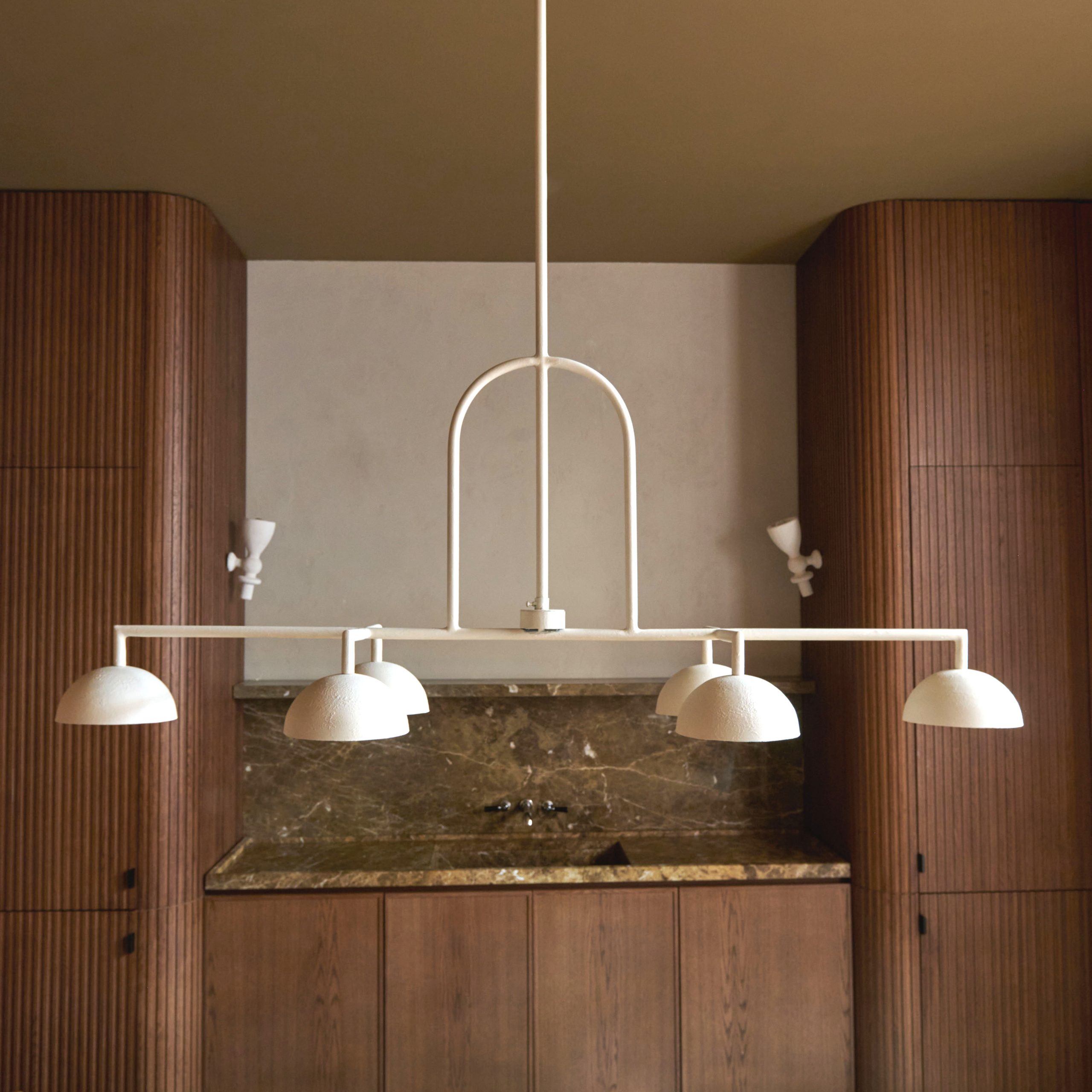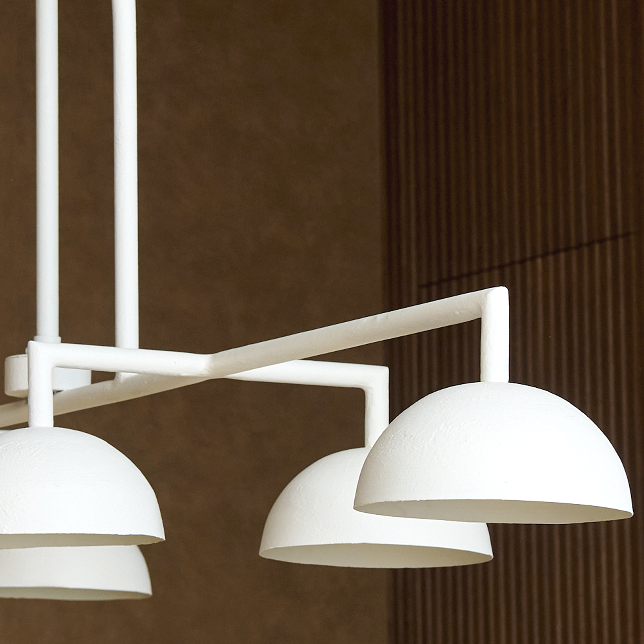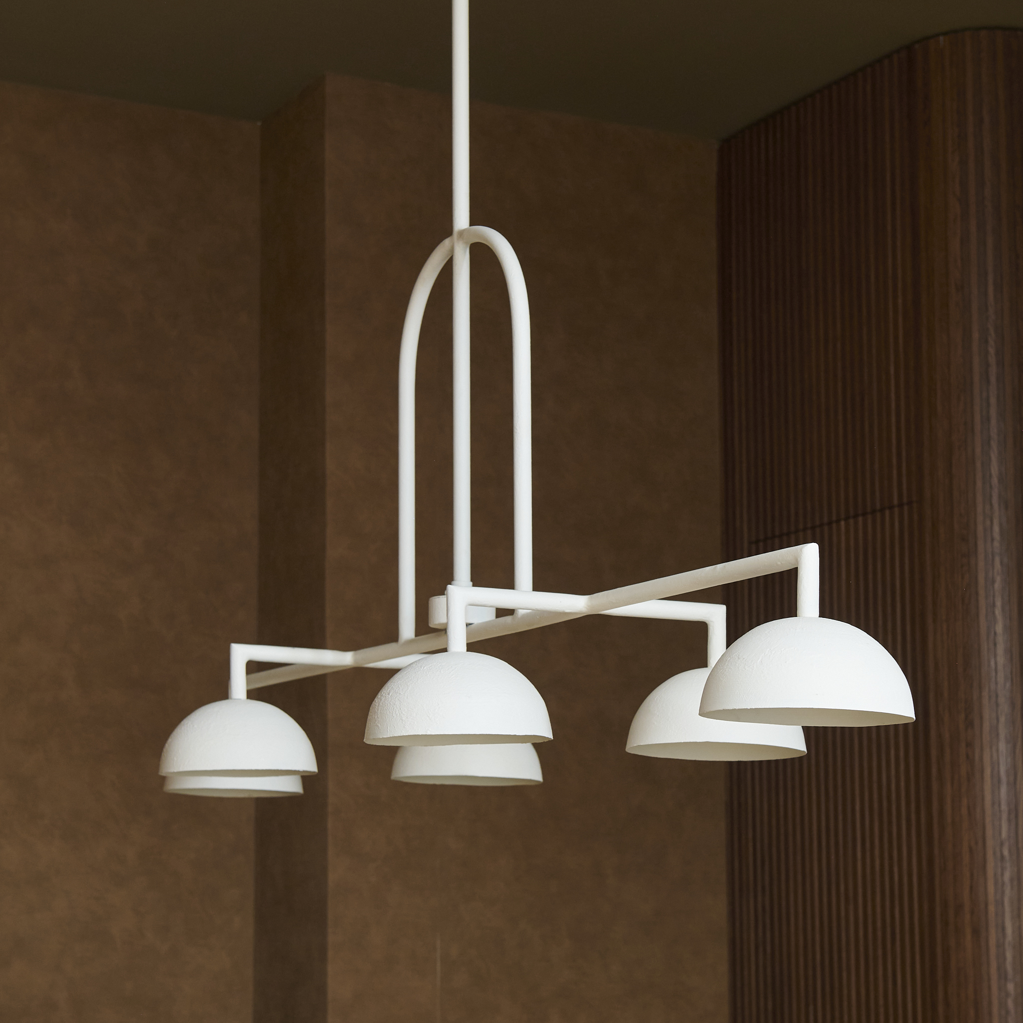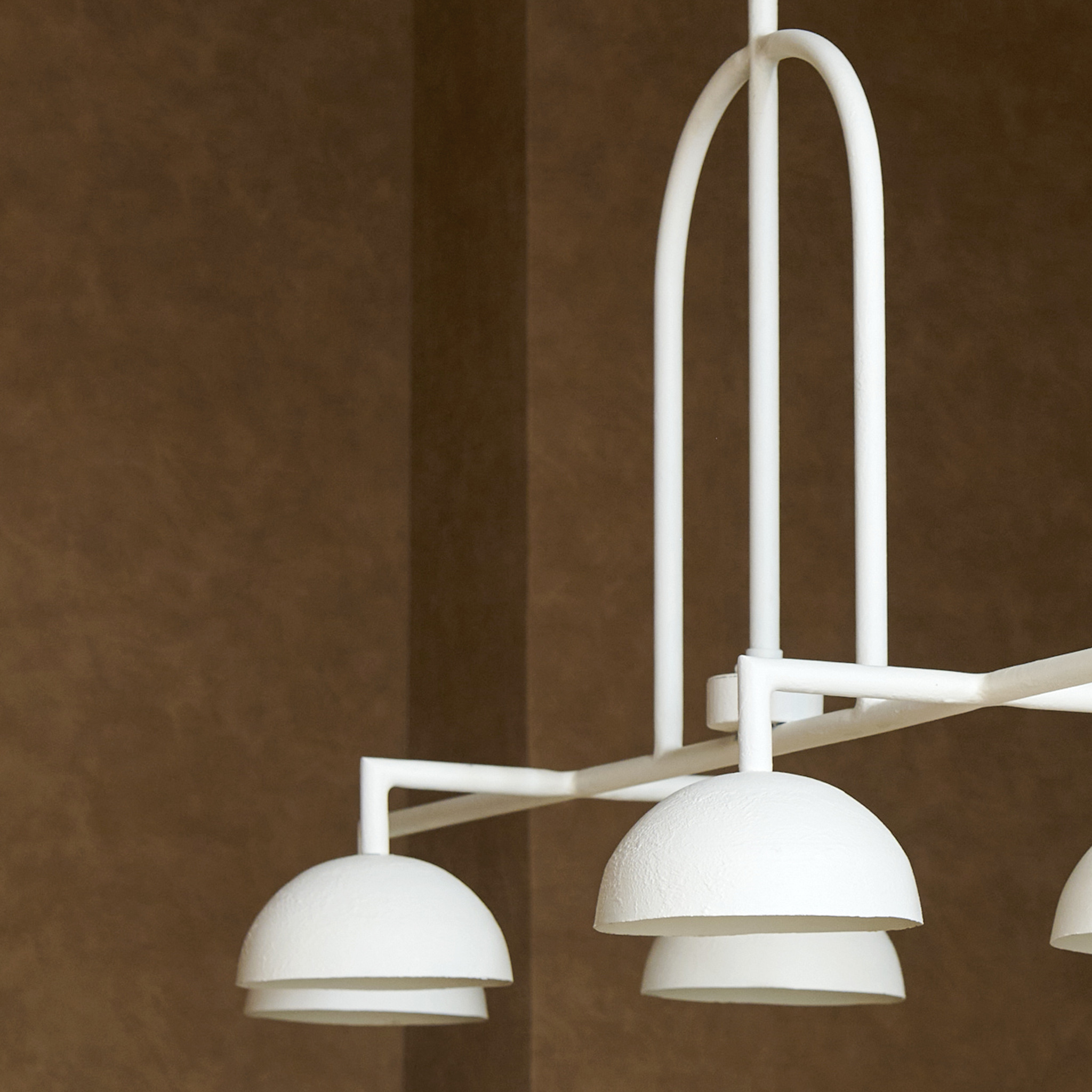Lámpara de techo de forja en acabado texturizado color hueso. Destaca por su diseño moderno y minimalista, combinando líneas limpias con una estructura geométrica elegante. Suspendida del techo mediante una delgada barra vertical blanca, la lámpara se ramifica en una estructura simétrica con seis pantallas semiesféricas, también en blanco mate, que cuelgan hacia abajo con gracia. Una pieza que aportan un toque de contemporaneidad sin romper la serenidad de los entornos. Una lámpara que no solo ilumina, sino que también se convierte en una pieza decorativa central, que da carácter y estilo al lugar.
