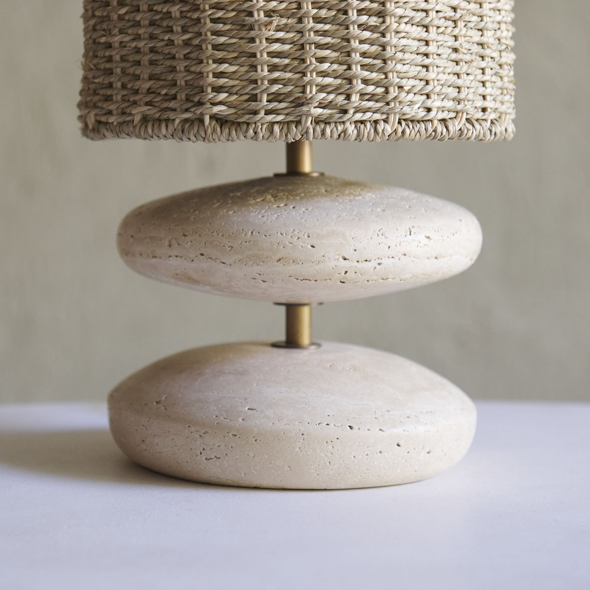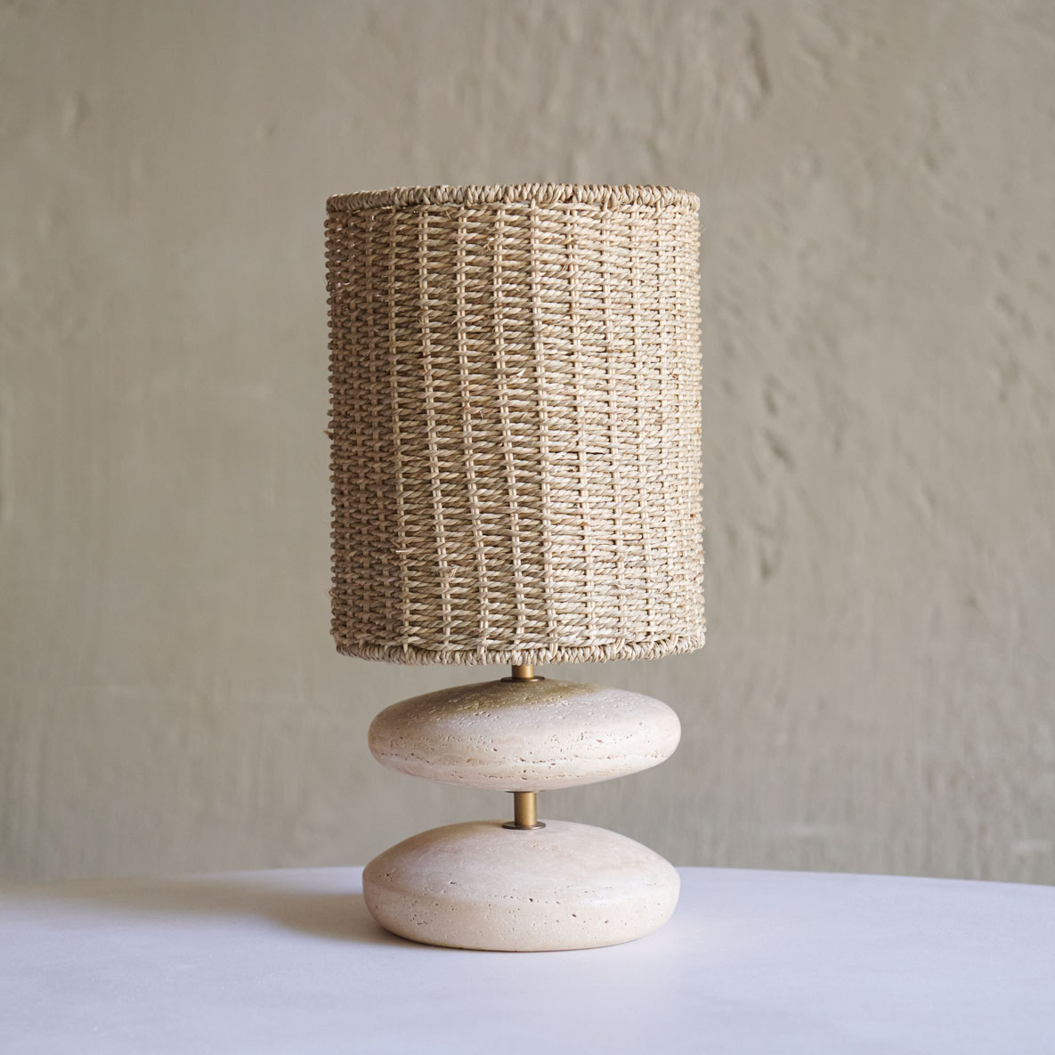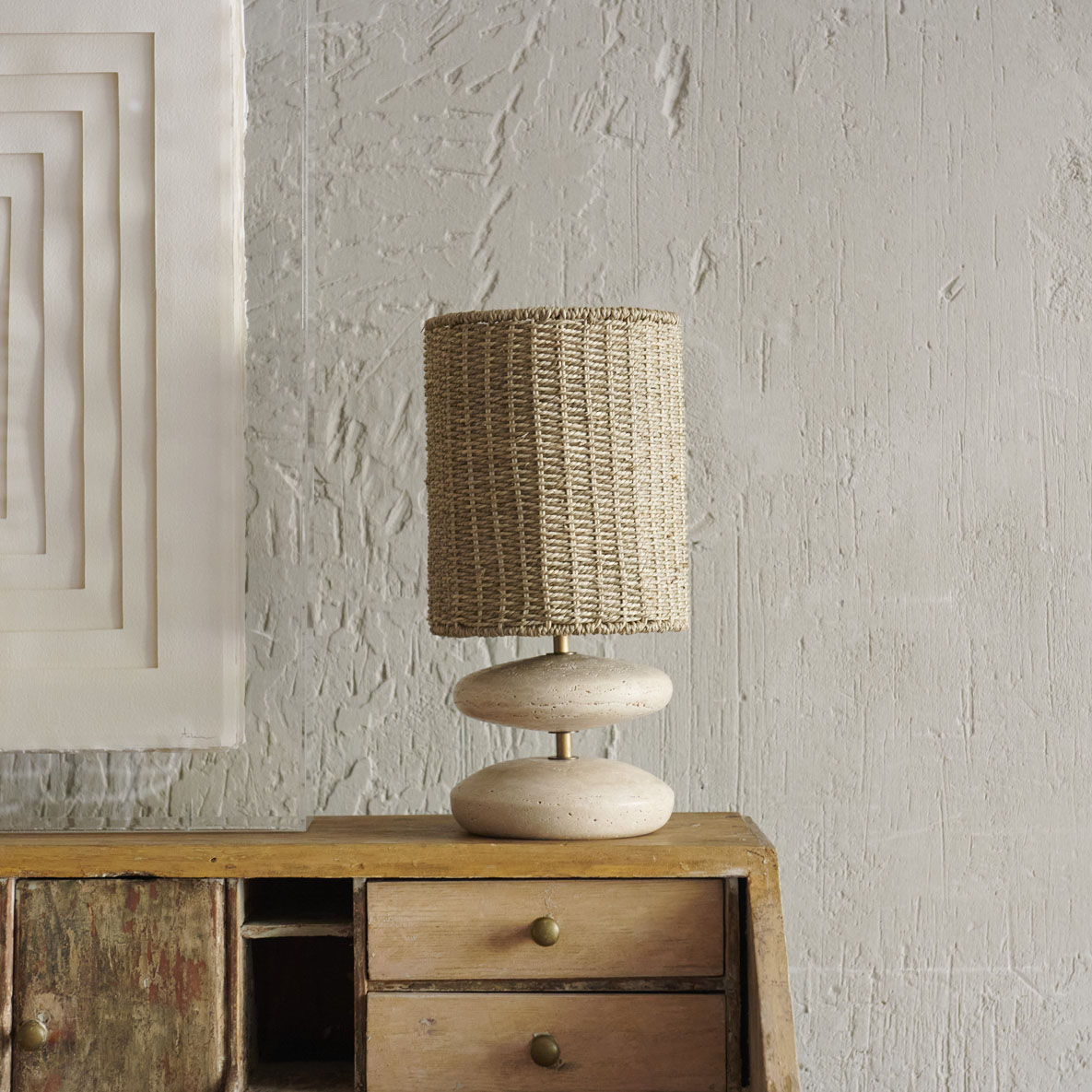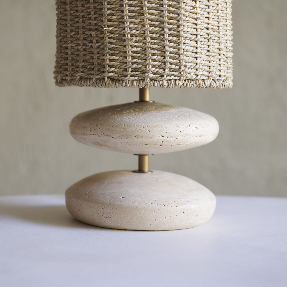 Lámpara de travertino y ratán. Con una bonita base de travertino italiano con elegantes formas sinuosas, incluye pequeña pantalla de ratán. Un diseño en agradables tonos terrosos que añaden belleza natural a cualquier espacio y que encaja perfectamente en cualquier estilo decorativo.
