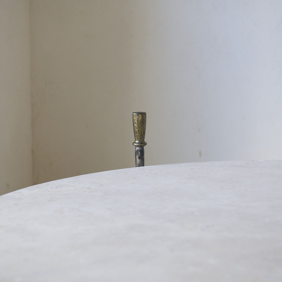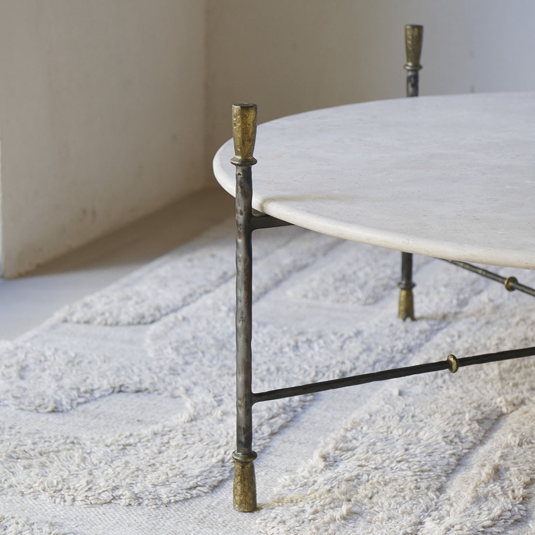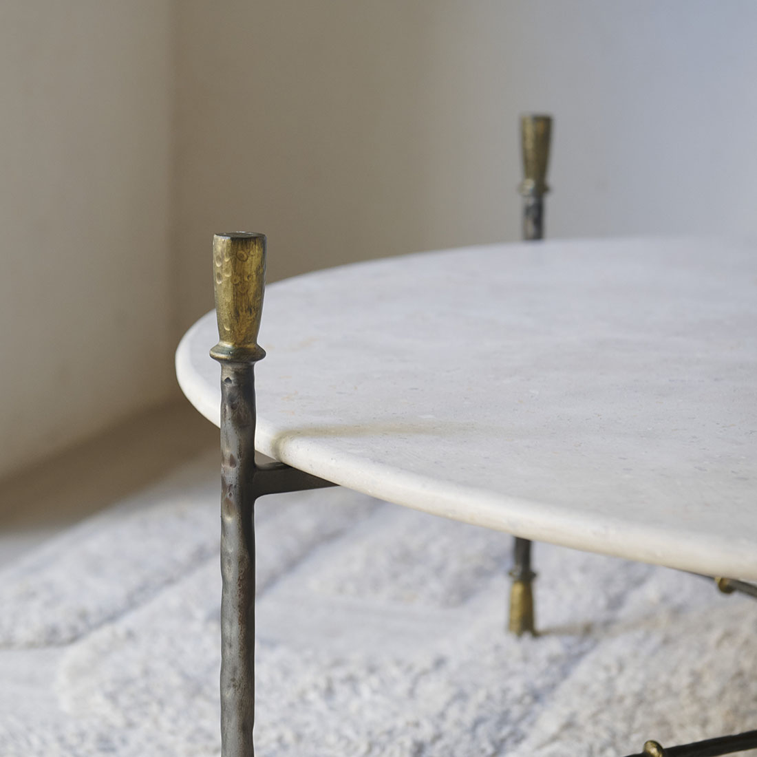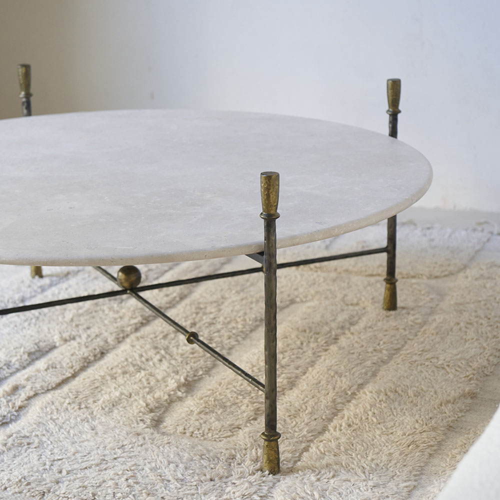 Mesa de centro Colonnata de Campaspero diseño Tristán Domecq Casa. Una pieza que deja ver una elegancia sobria y atemporal, con una estructura de hierro forjado, delicada pero firme, y un sobre en forma circular de Campaspero, claro y suave. Una pieza con un carácter equilibrado, robusta y ligera a la vez, pensada para integrarse con naturalidad en espacios contemporáneos y rústicos, aportando armonía y una belleza discreta.