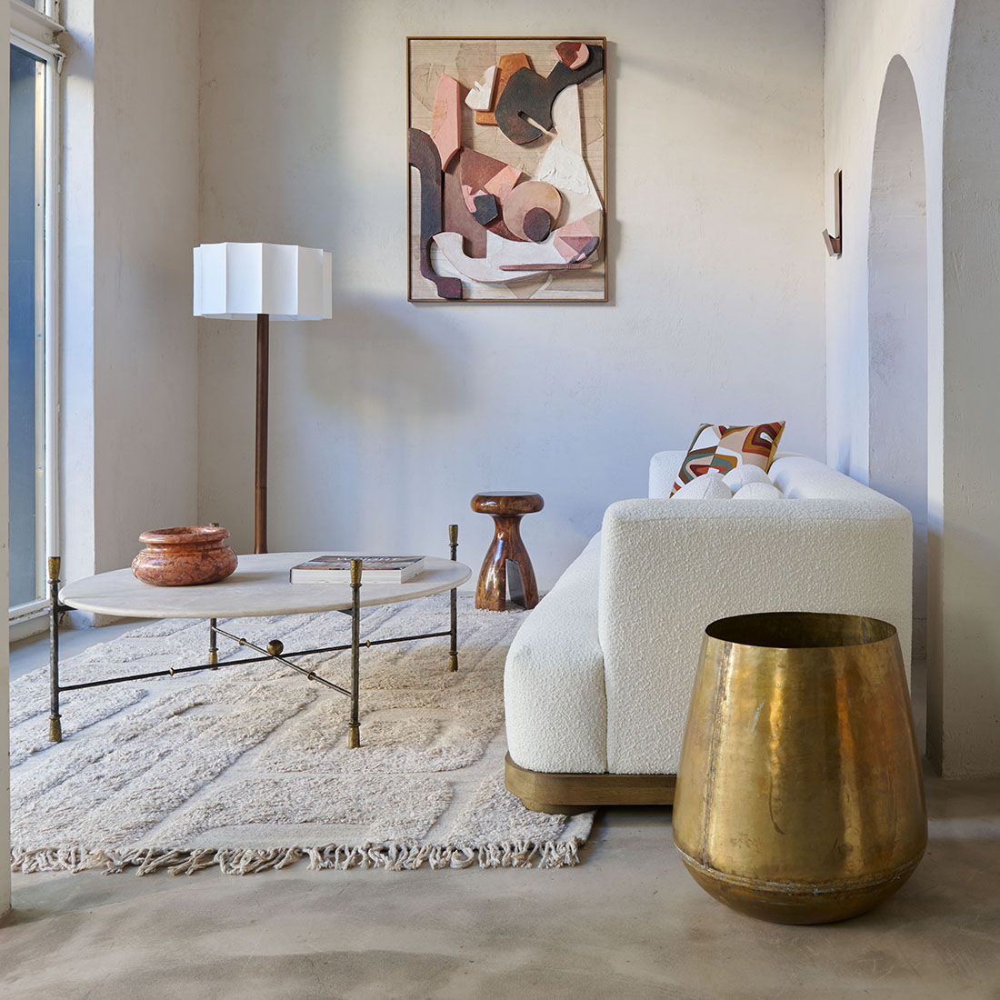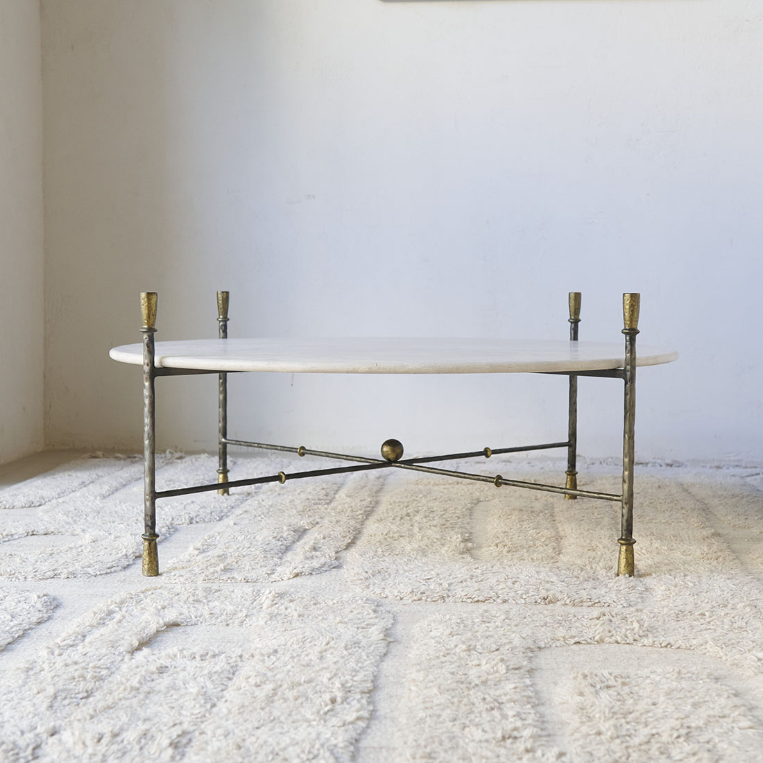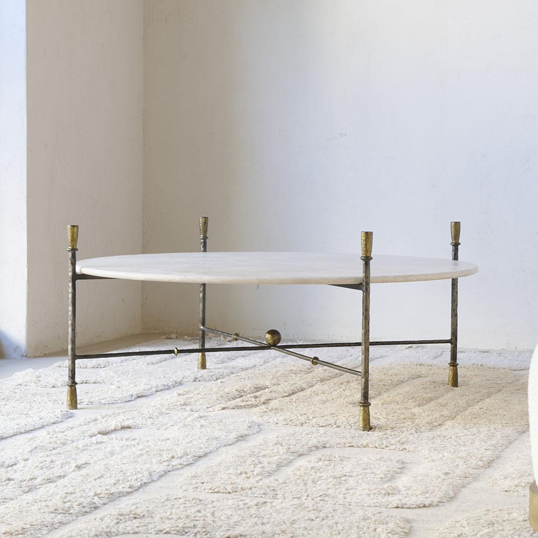 Mesa de centro Colonnata de Campaspero diseño Tristán Domecq Casa. Una pieza que deja ver una elegancia sobria y atemporal, con una estructura de hierro forjado, delicada pero firme, y un sobre en forma circular de Campaspero, claro y suave. Una pieza con un carácter equilibrado, robusta y ligera a la vez, pensada para integrarse con naturalidad en espacios contemporáneos y rústicos, aportando armonía y una belleza discreta.