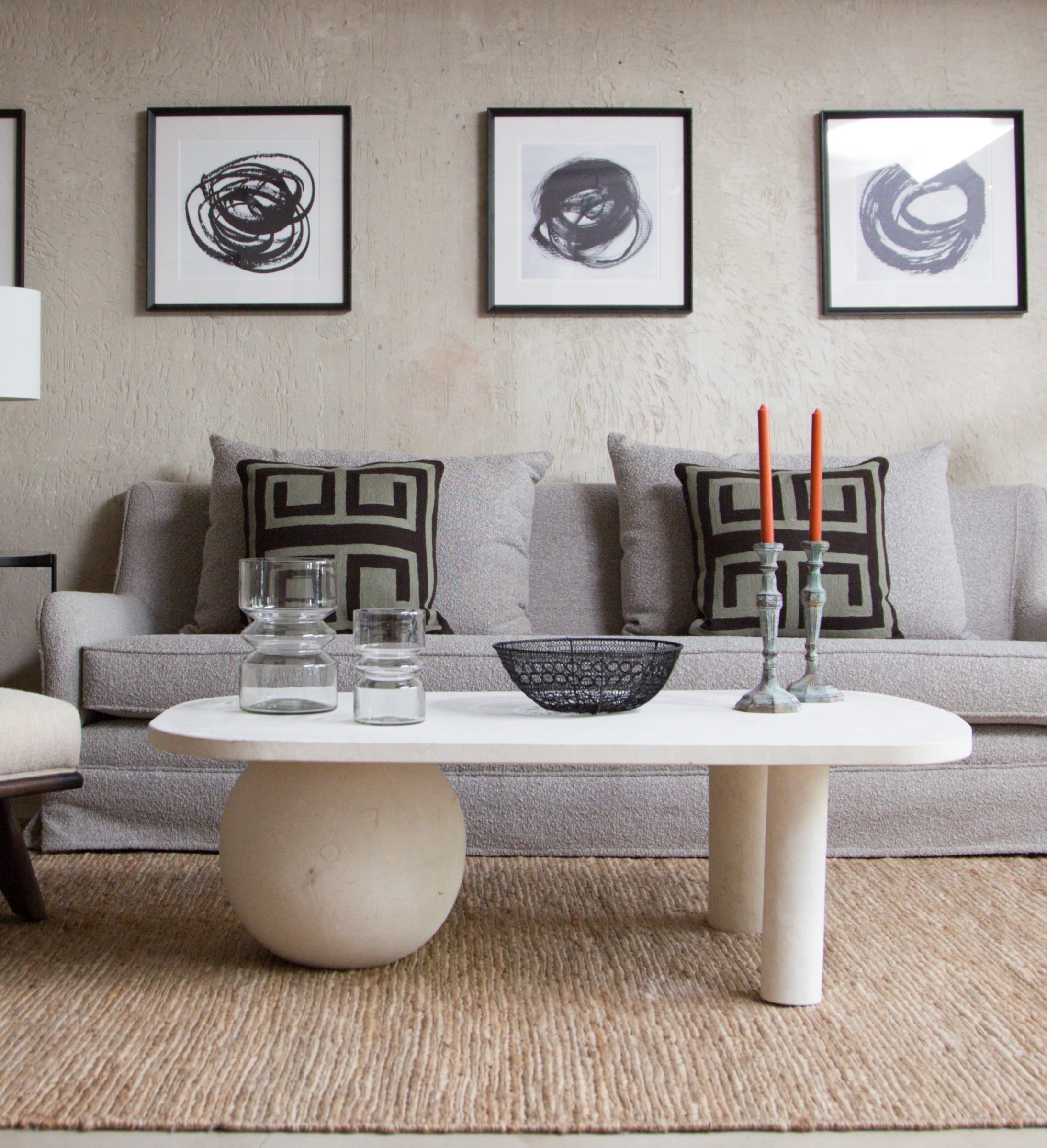 Mesa de centro de piedra caliza alba mate e hidrofugada. Con un original diseño con sobre en forma ovalada y con dos patas cilíndricas y una más grande esférica. Medidas: 130x79x40 cm. Se puede encargar en diferentes medidas.