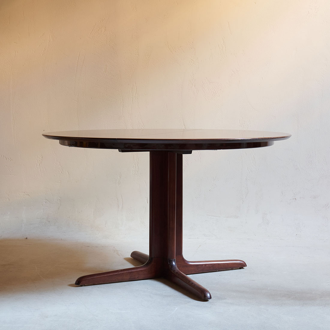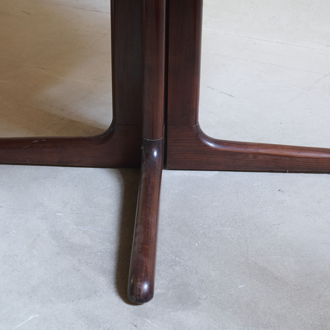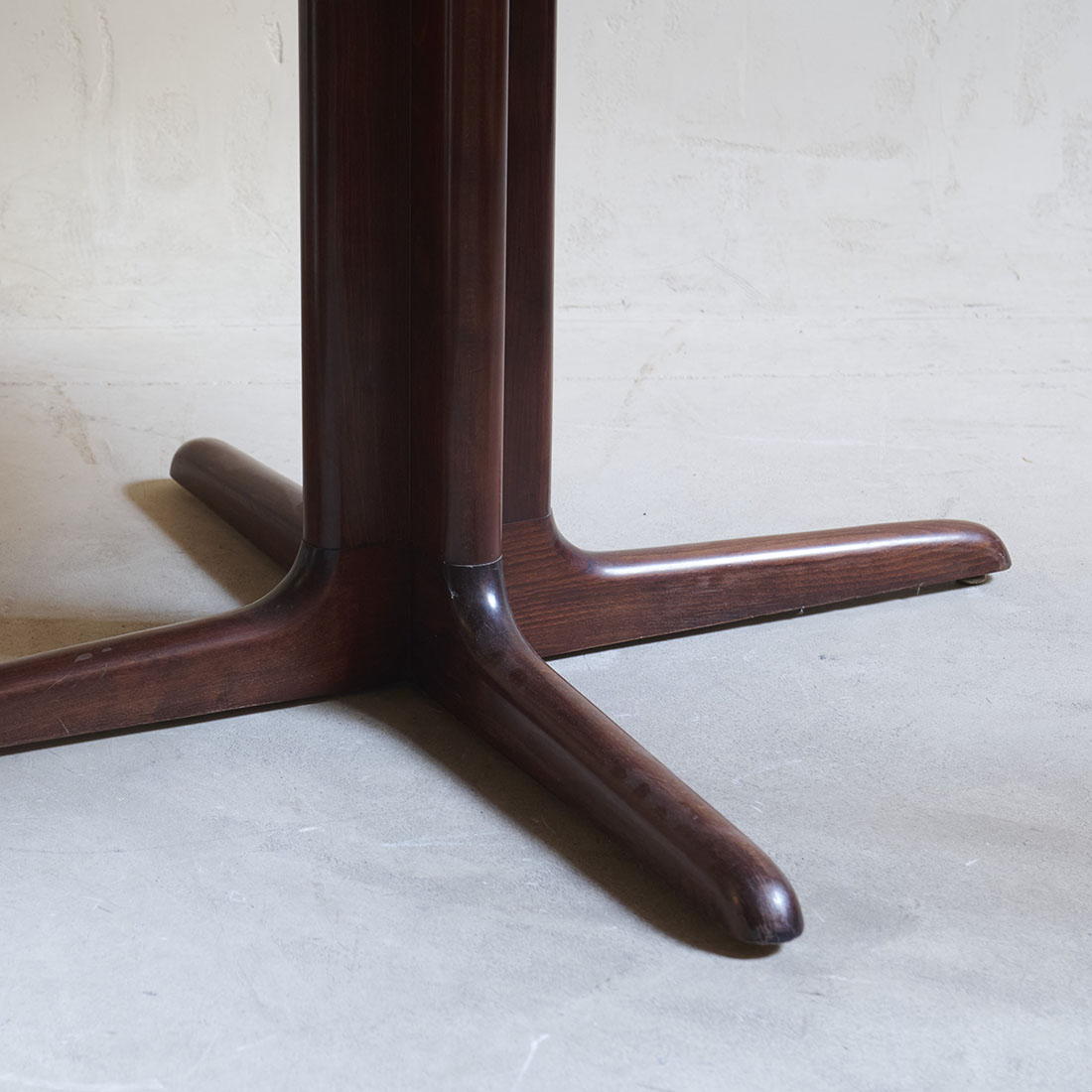Esta mesa de comedor de madera vintage tiene un encanto clásico y atemporal. de mediados del siglo XX, su superficie redonda, pulida con un brillo que refleja la calidez del material, muestra las vetas naturales de la madera, realzando su elegancia y carácter. El soporte central, robusto pero estilizado, se abre en una base con suaves curvas que equilibran firmeza y delicadeza.