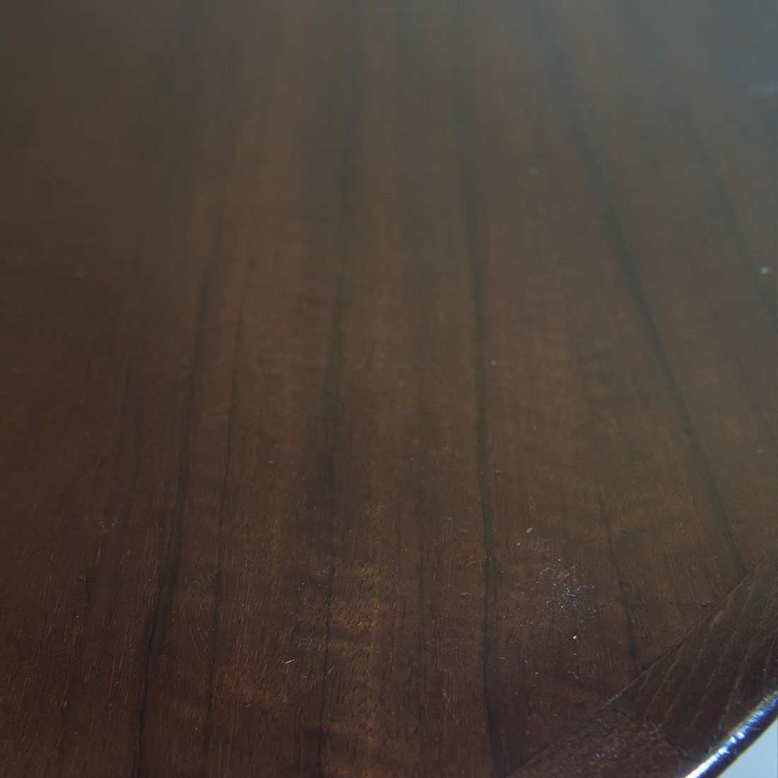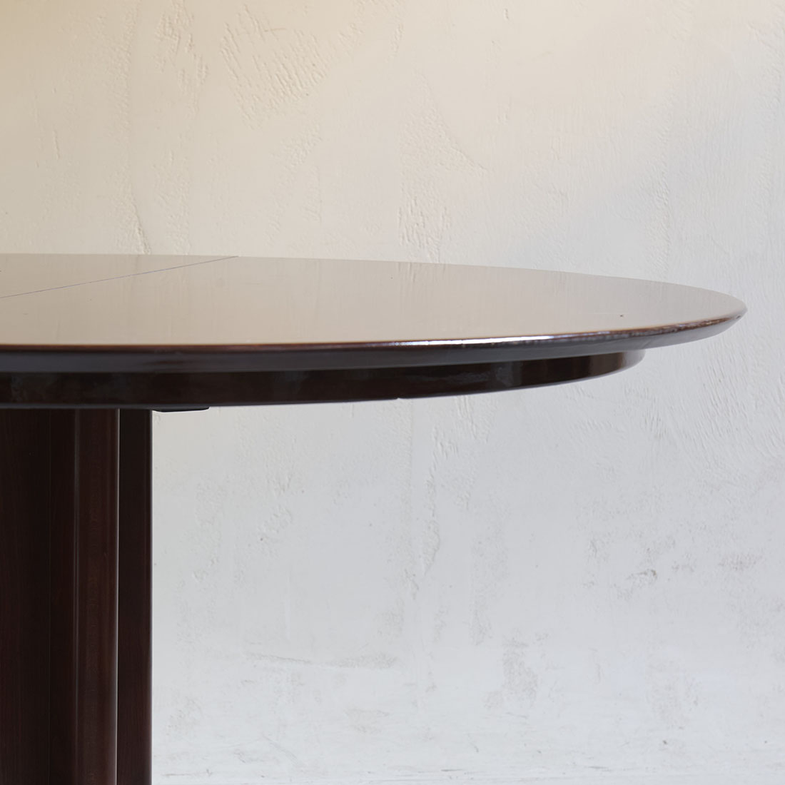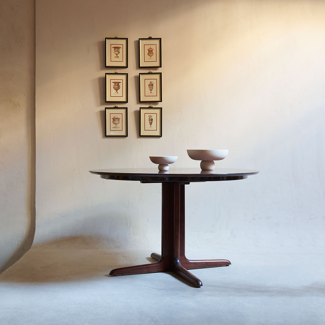Esta mesa de comedor de madera vintage tiene un encanto clásico y atemporal. de mediados del siglo XX, su superficie redonda, pulida con un brillo que refleja la calidez del material, muestra las vetas naturales de la madera, realzando su elegancia y carácter. El soporte central, robusto pero estilizado, se abre en una base con suaves curvas que equilibran firmeza y delicadeza.