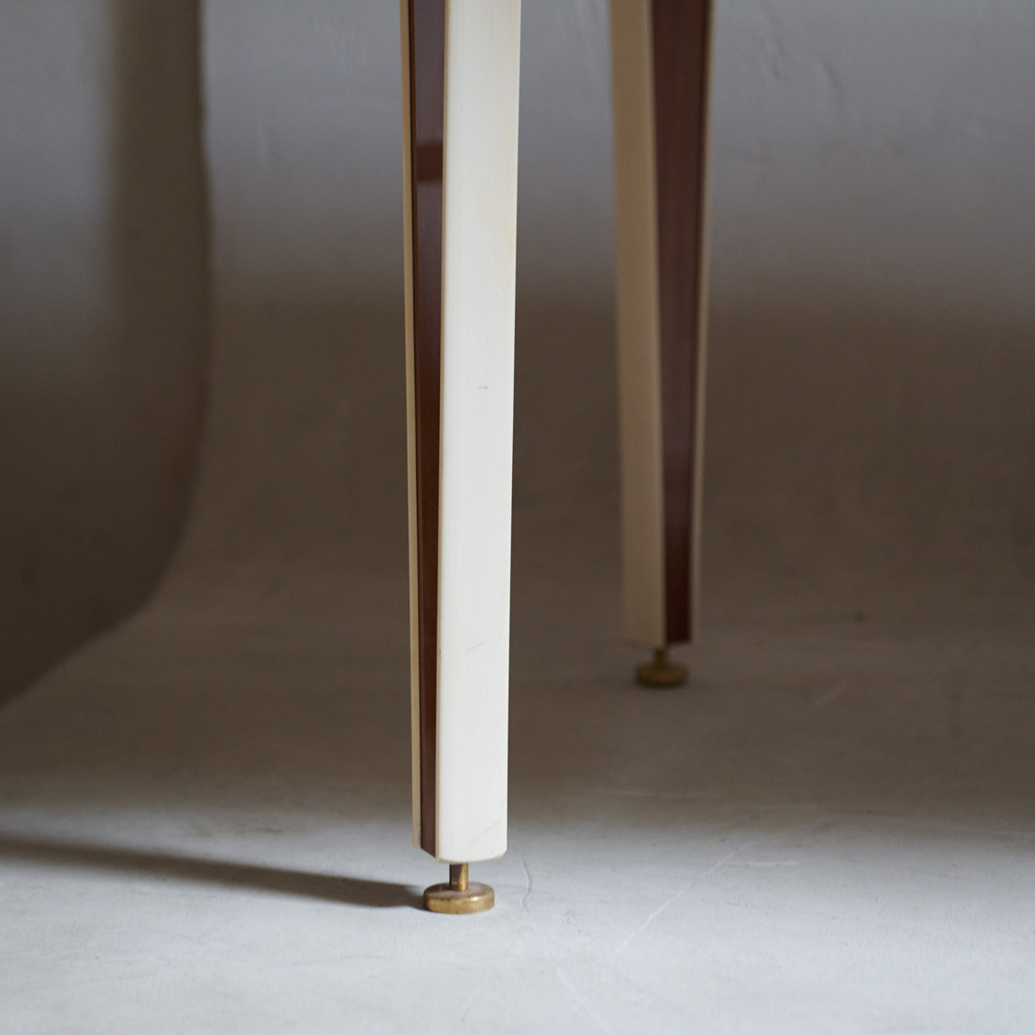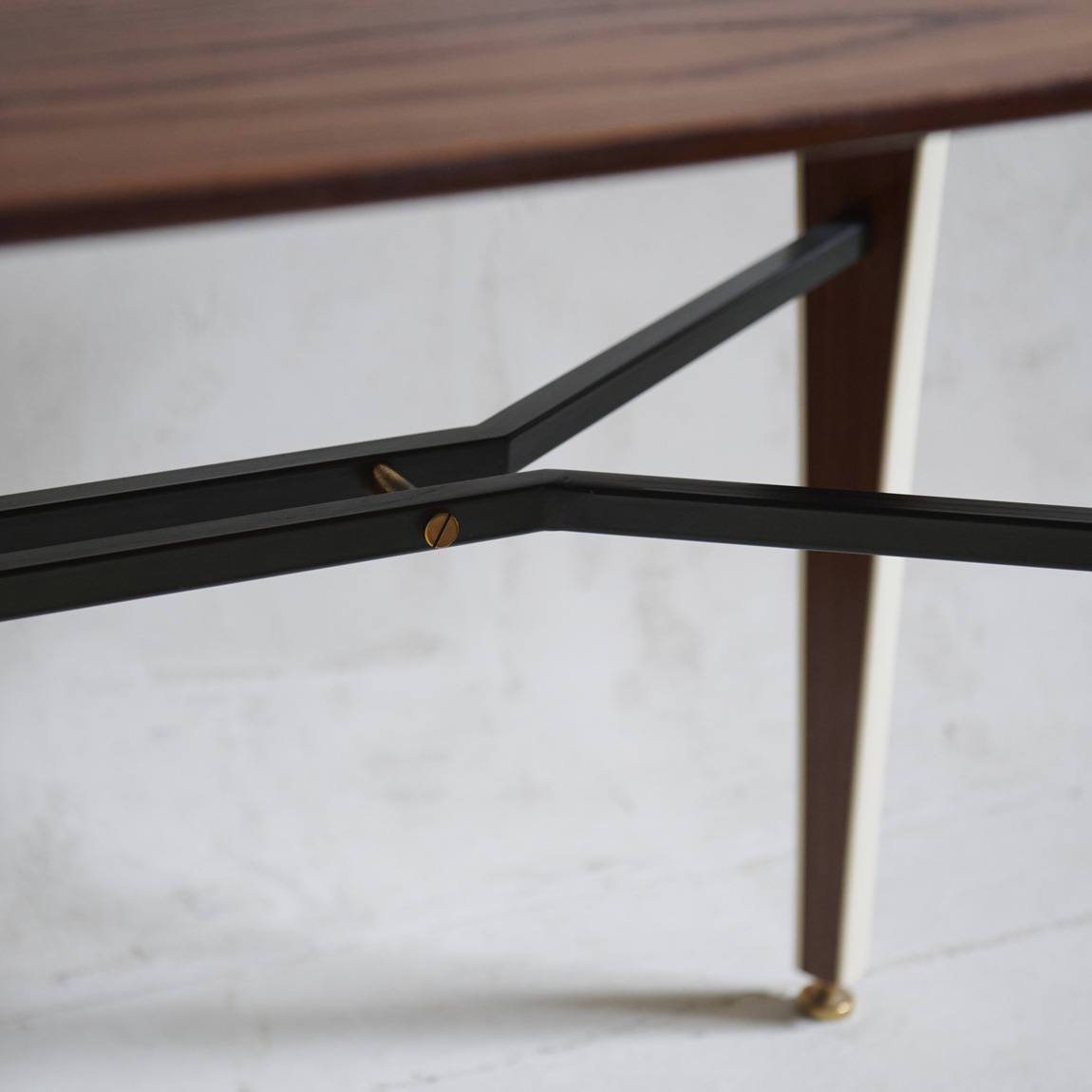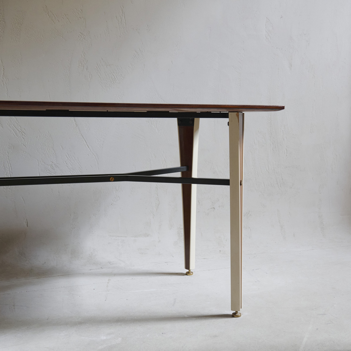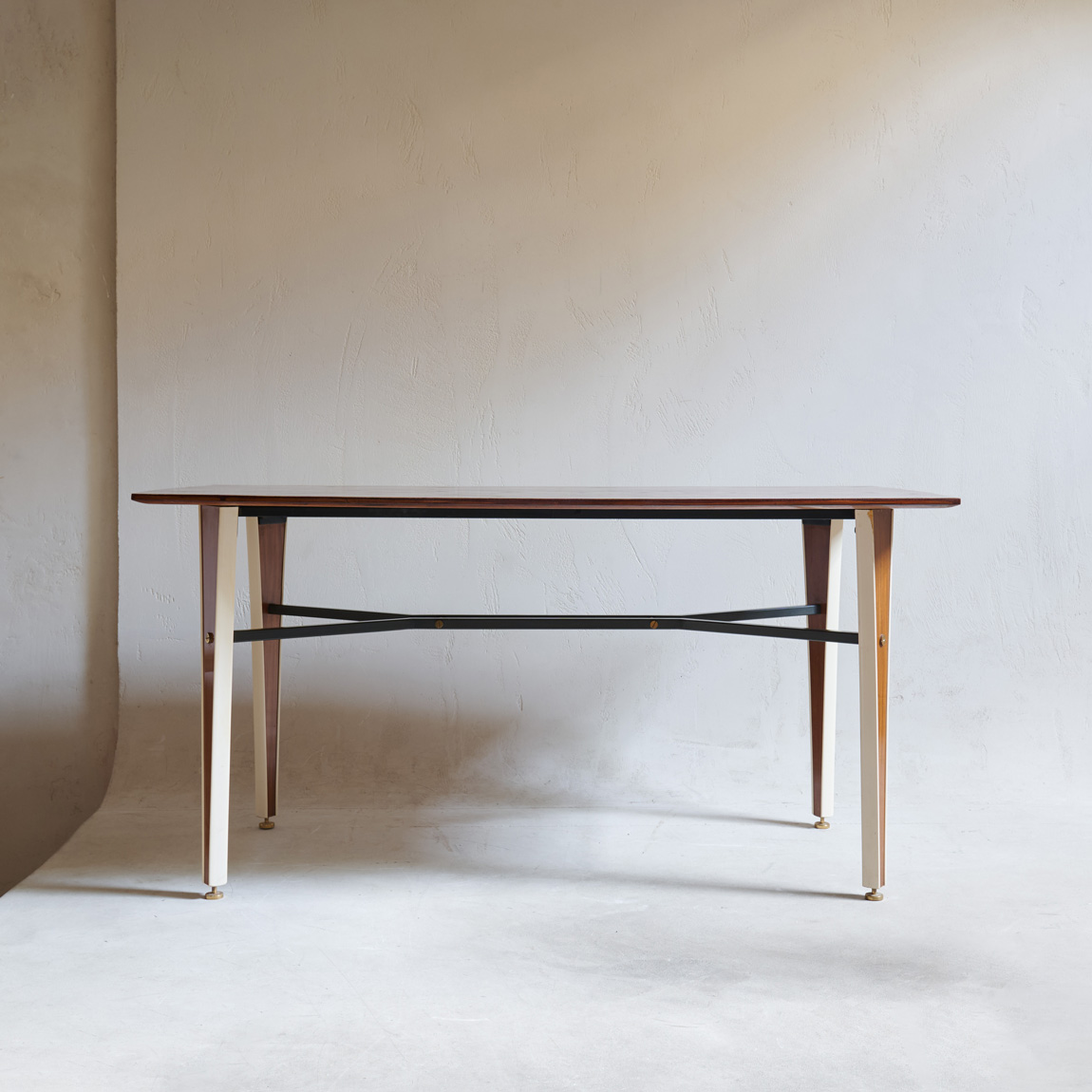 Mesa de madera Mid Century. Perfecta para comedor o despacho, es una joya del diseño de los años 50, una pieza que encarna la elegancia racional y el espíritu experimental característicos de la época. Su estructura combina líneas limpias con una atención minuciosa al detalle. El sobre presenta un acabado satinado que resalta la textura natural de la veta, aportando una sensación táctil muy interesante. Sus bordes suavemente redondeados alivian la geometría del diseño, ofreciendo una transición delicada entre la superficie y las patas. Las patas, estilizadas y ligeramente inclinadas, muestran una combinación magistral de materiales que aportan un contraste sutil pero contundente. Están unidas por una barra transversal en metal negro, que no solo añade estabilidad, sino también una nota gráfica que acentúa el carácter arquitectónico del mueble.