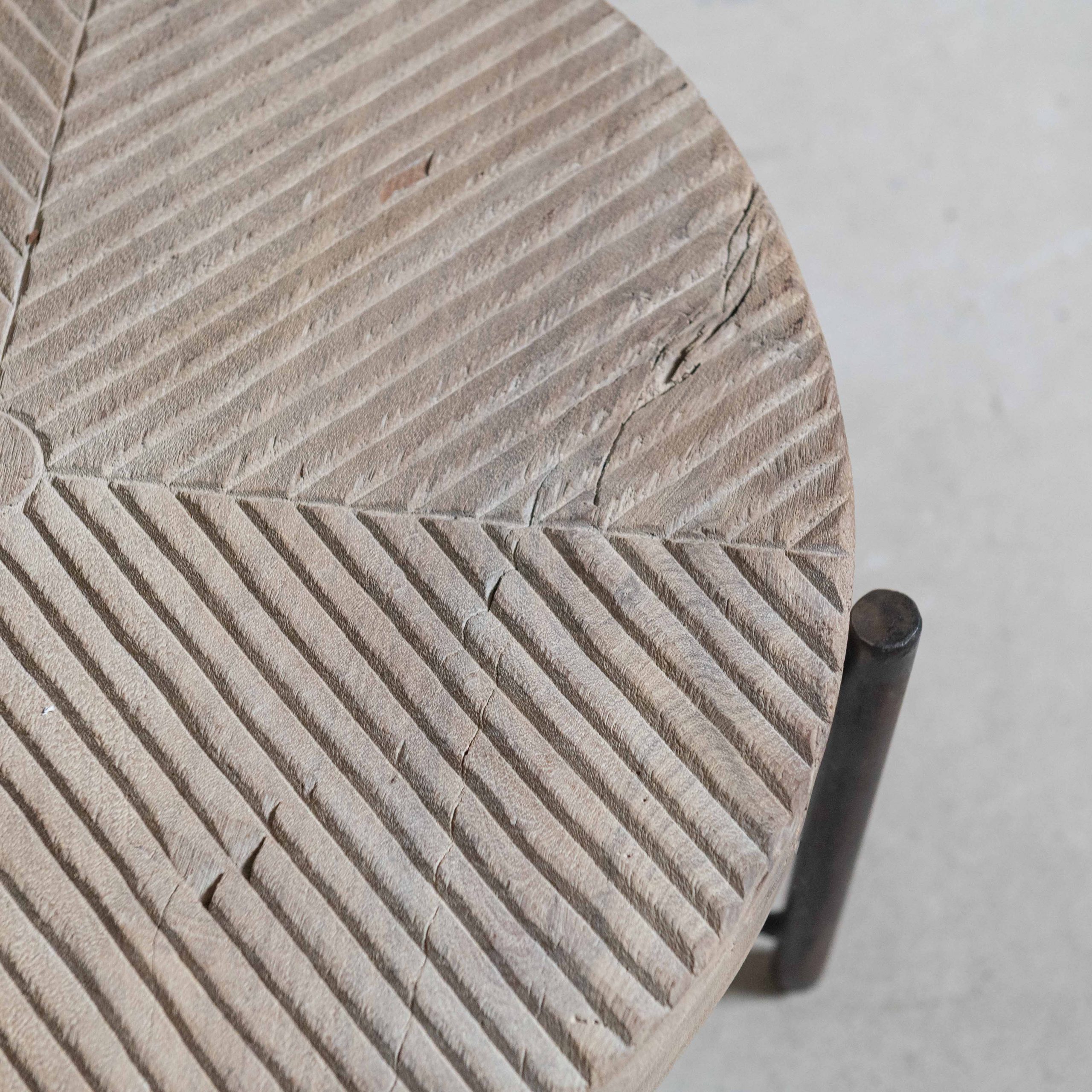 Mesita auxiliar vintage de madera y hierro. Esta mesita vintage combina la calidez natural de la madera maciza con la sobriedad industrial del hierro, creando una pieza llena de carácter y autenticidad. El sobre está formado por un corte de tronco natural, donde se pueden apreciar las vetas, pequeñas grietas y marcas del tiempo que cuentan su propia historia. Su acabado rústico y orgánico aporta textura y una belleza imperfecta que la hace única. Las patas de hierro oscuro, finas y minimalistas, sostienen la madera con elegancia y ligereza visual.