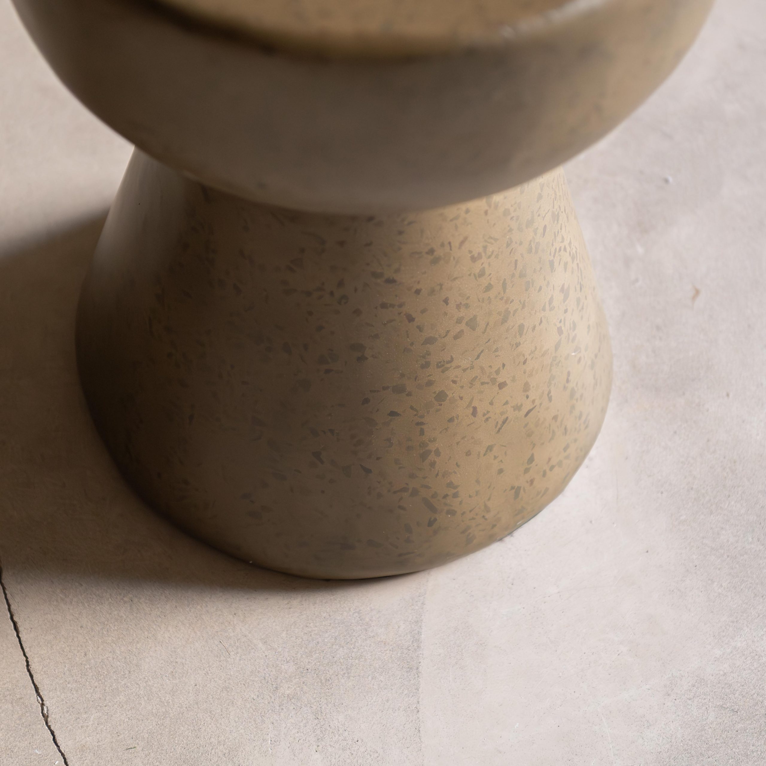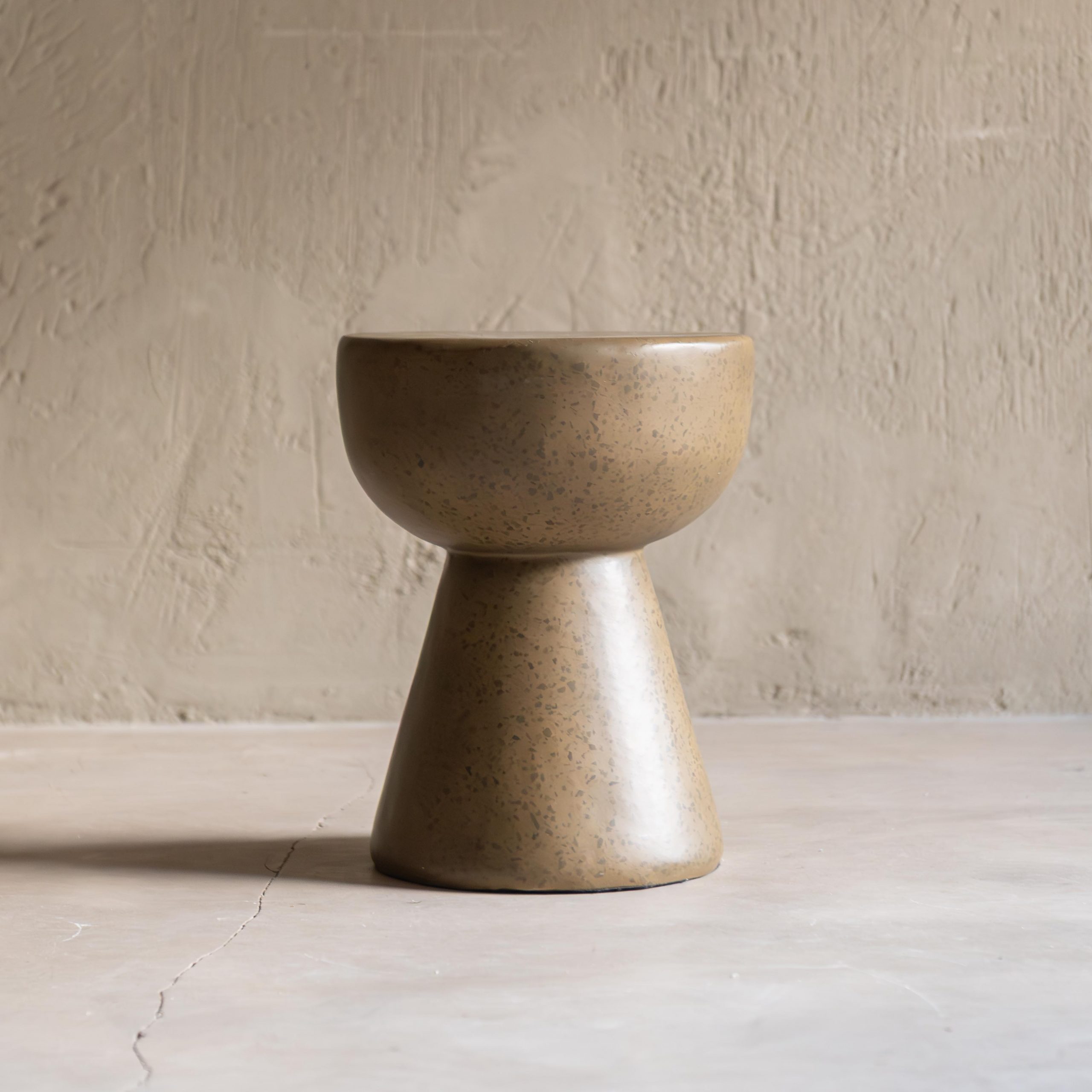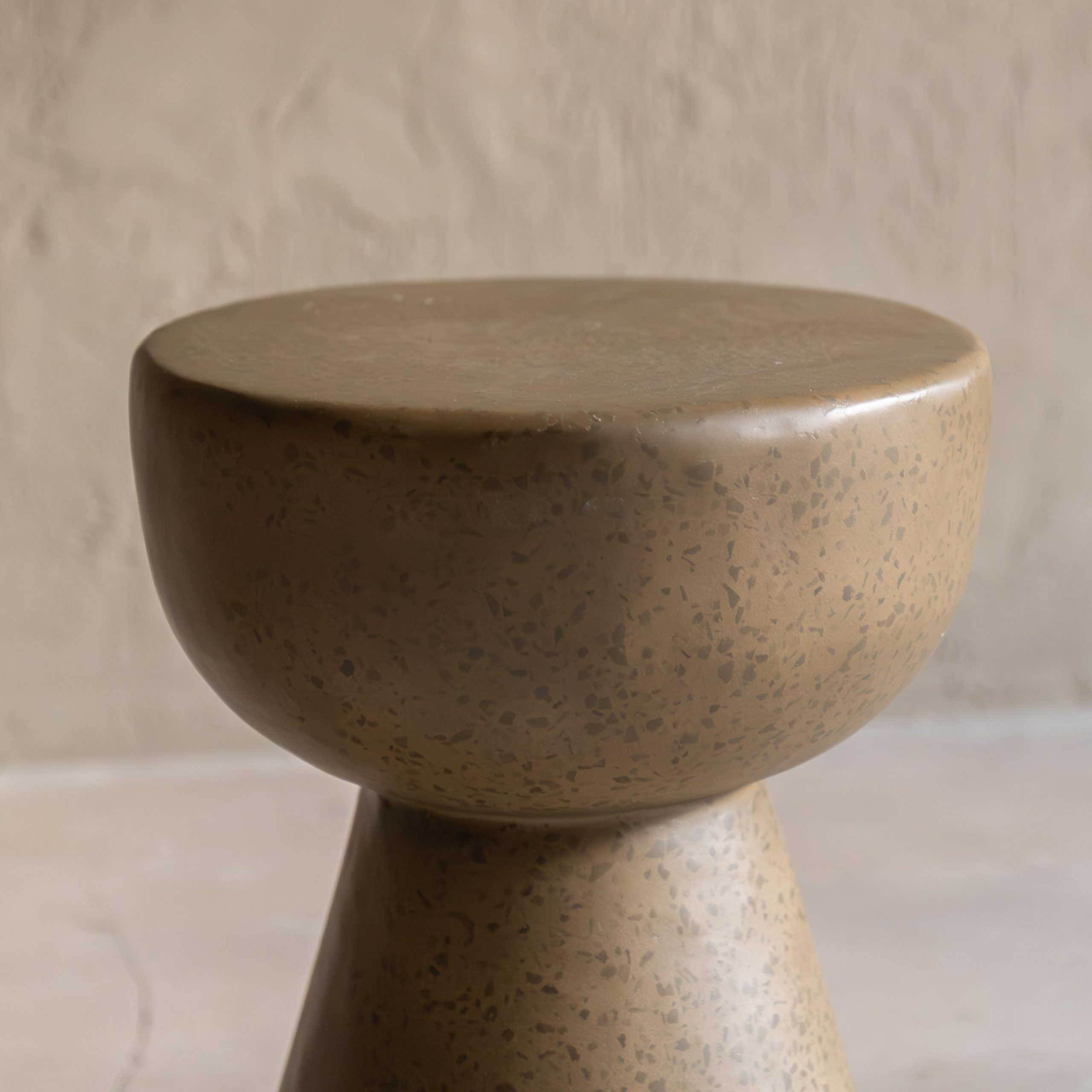 Mesa auxiliar de terrazo color caqui. Con un diseño compuesto por dos volúmenes geométricos con una base cónica que sostiene un cuenco amplio y redondeado, su acabado en tonos tierra, con un moteado sutil, aporta calidez y textura, integrándose de forma natural en un ambiente minimalista o de inspiración orgánica. Su superficie es suave y sus curvas equilibradas transmiten calma y elegancia discreta.