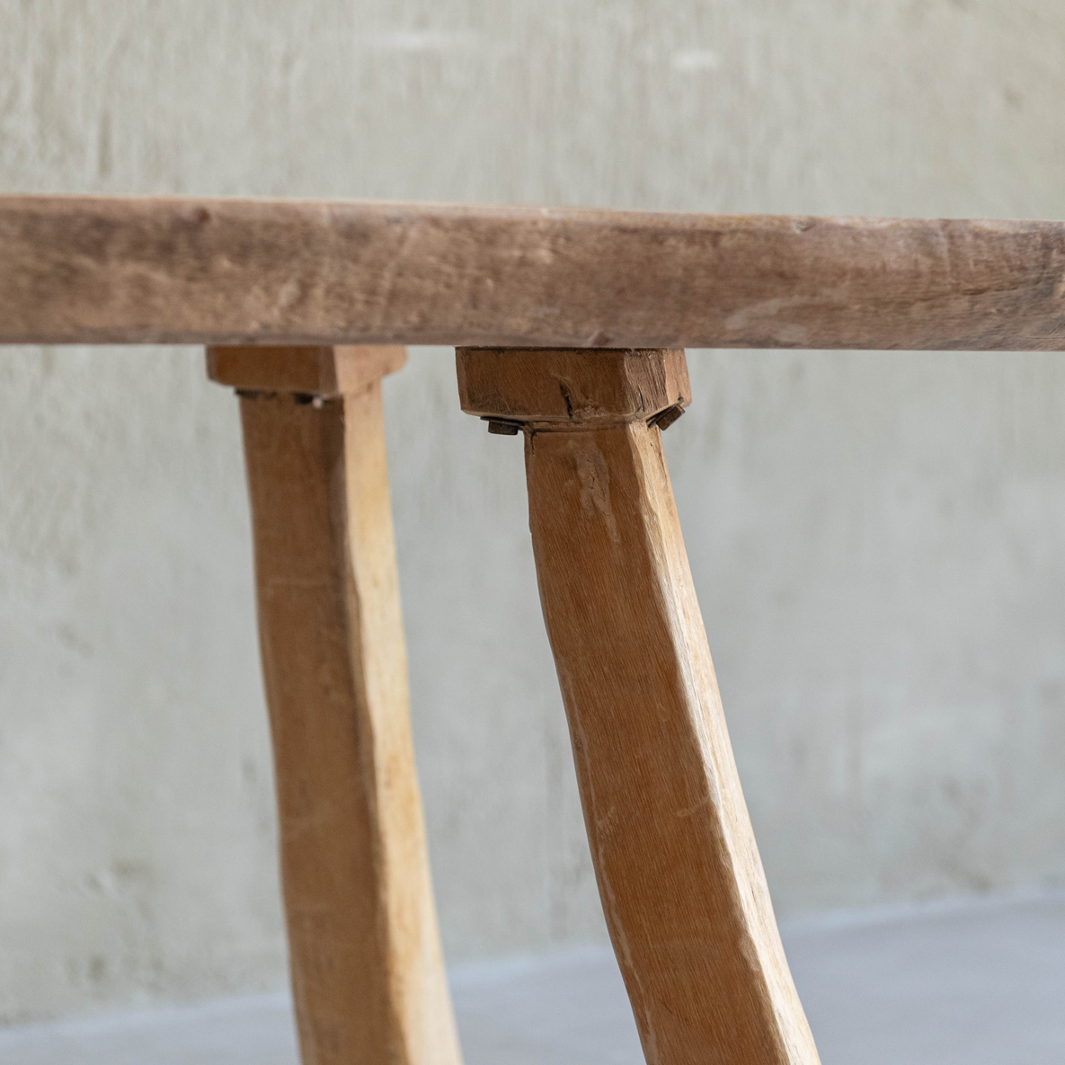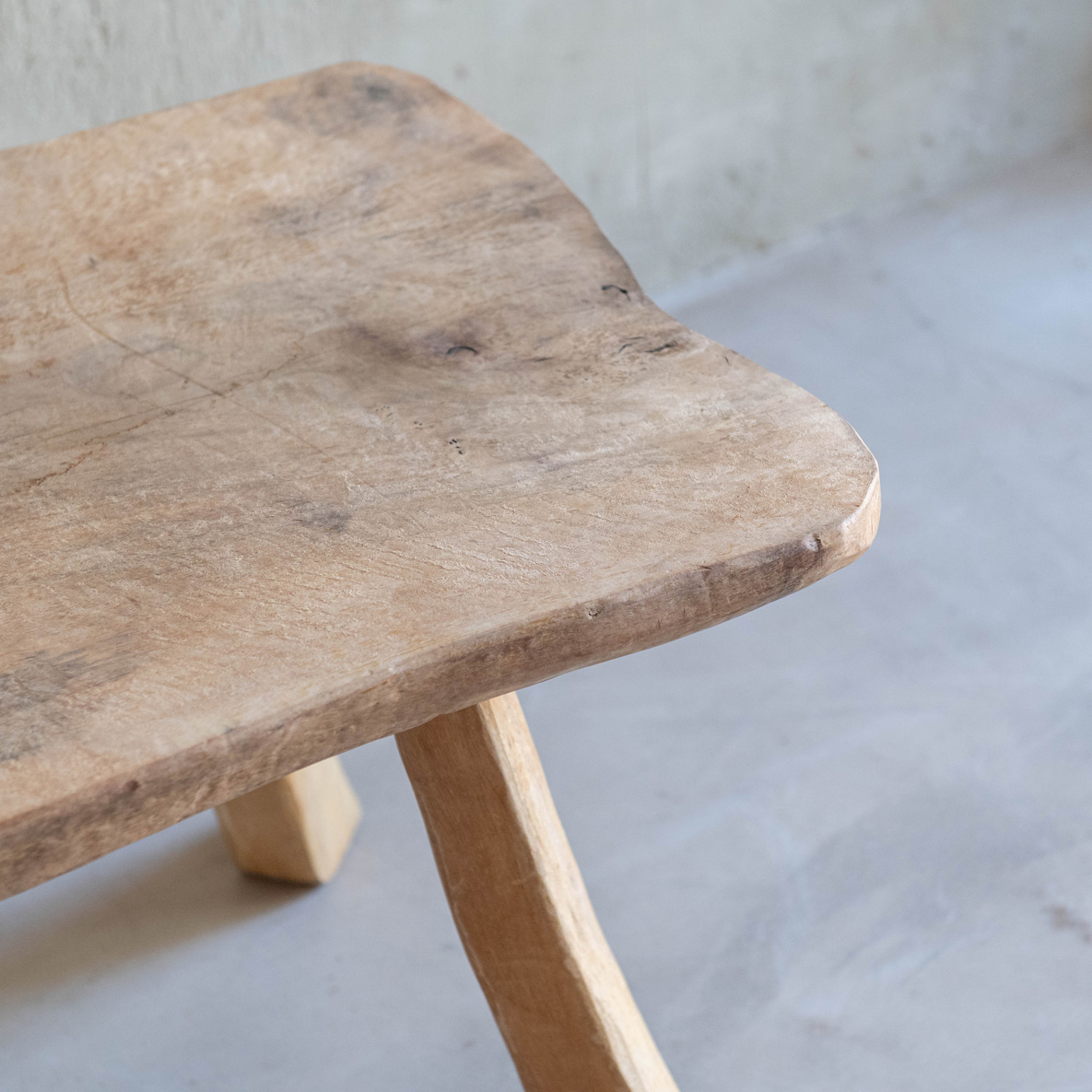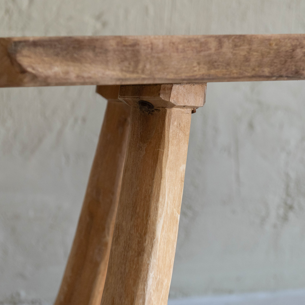 Mesita de centro de jardín. Con una presencia sobria , tiene una estructura maciza de madera sin tratar que revela las vetas, imperfecciones y texturas propias del material, celebrando su origen orgánico. El tablero superior, robusto, grueso y de líneas irregulares, conserva los bordes naturales de la madera, lo que aporta un aire rústico pero sofisticado. Presenta cuatro patas inclinadas, talladas a mano con formas ligeramente asimétricas, lo que da la sensación de equilibrio imperfecto.