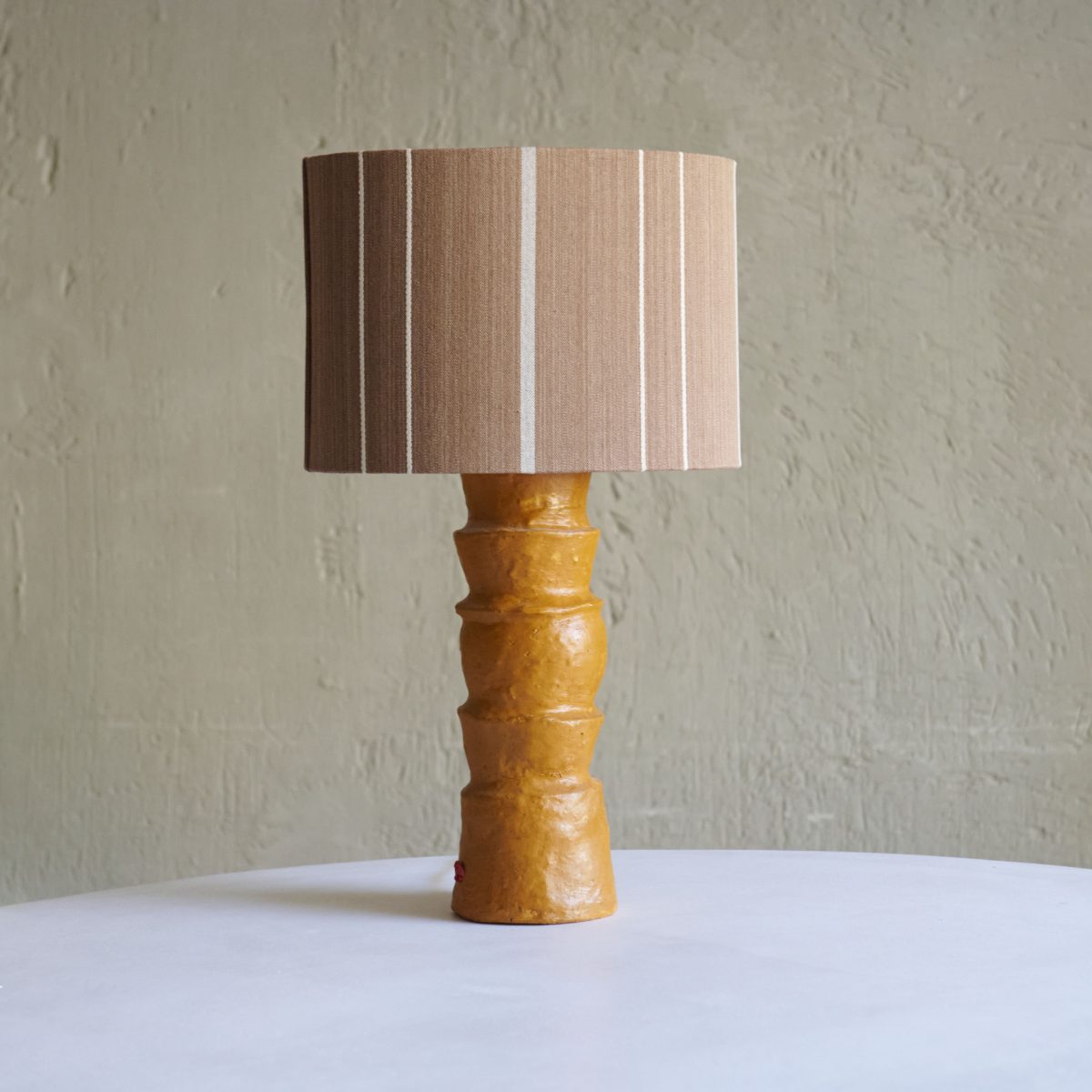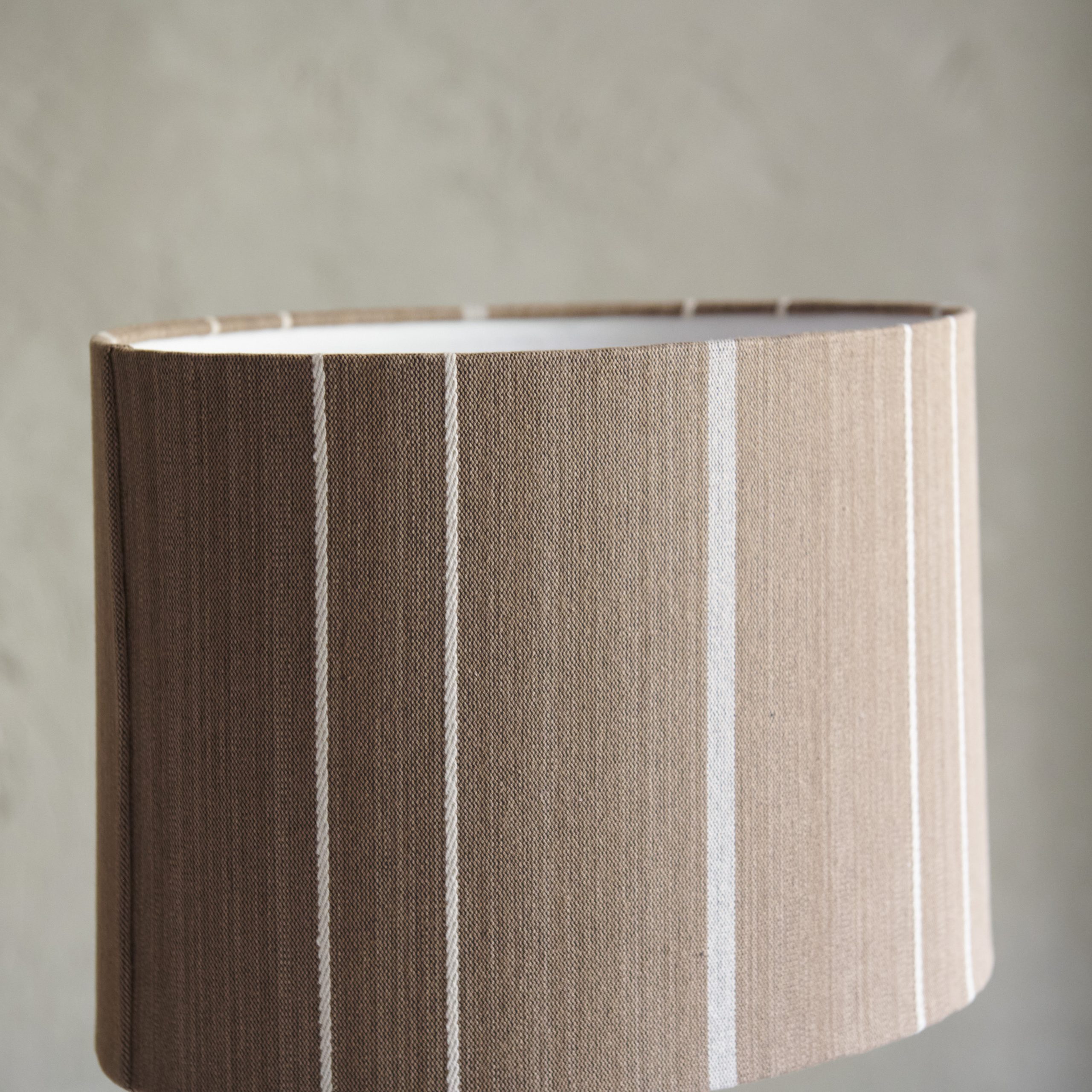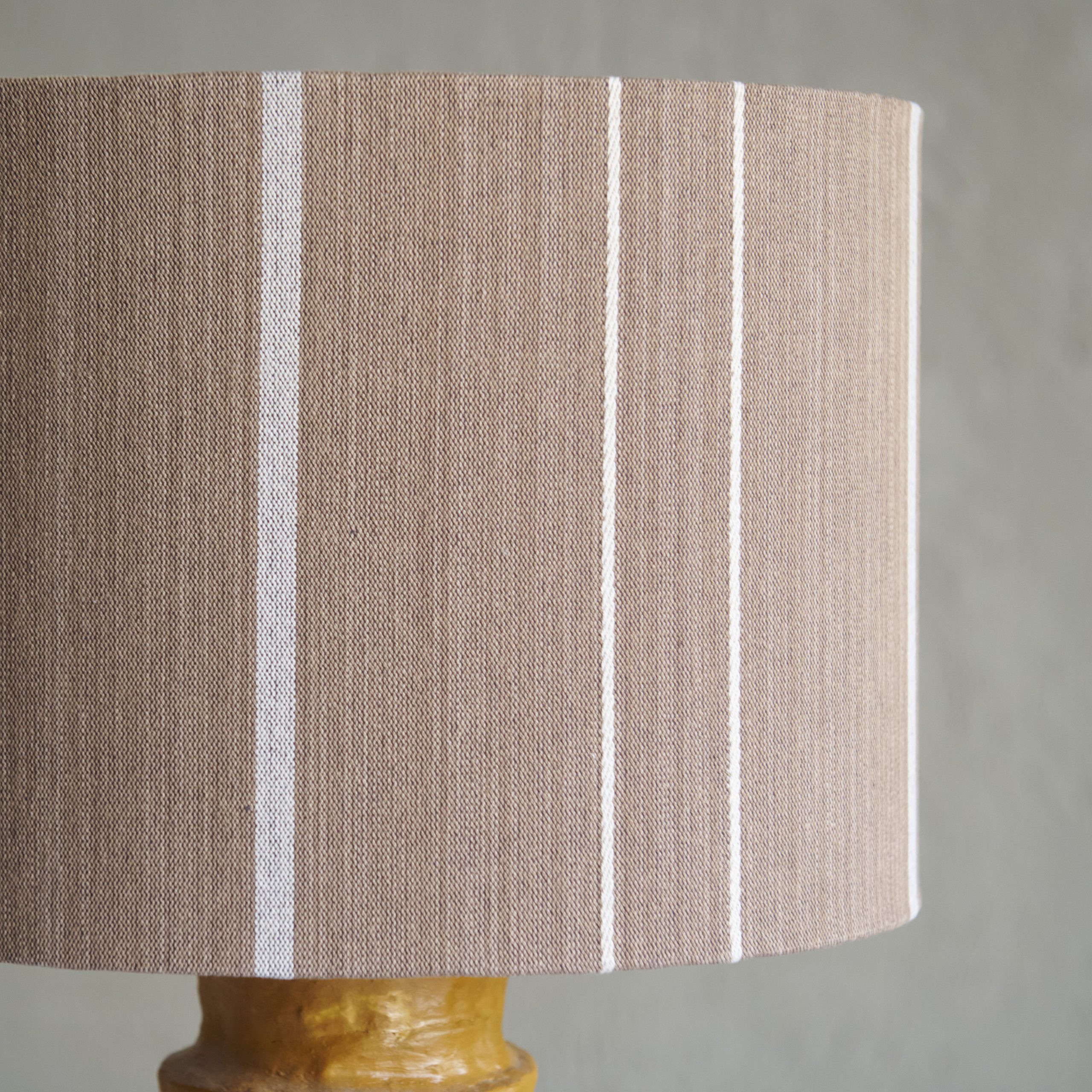 Pantalla color caramelo a rayas. Fabricada en algodón 100%, tiene un encanto atemporal con un discreto diseño a rayas blancas sobre fondo en un bonito color caramelo. Perfecta para cualquier espacio, tiene una forma ovalada que la hace destacar.