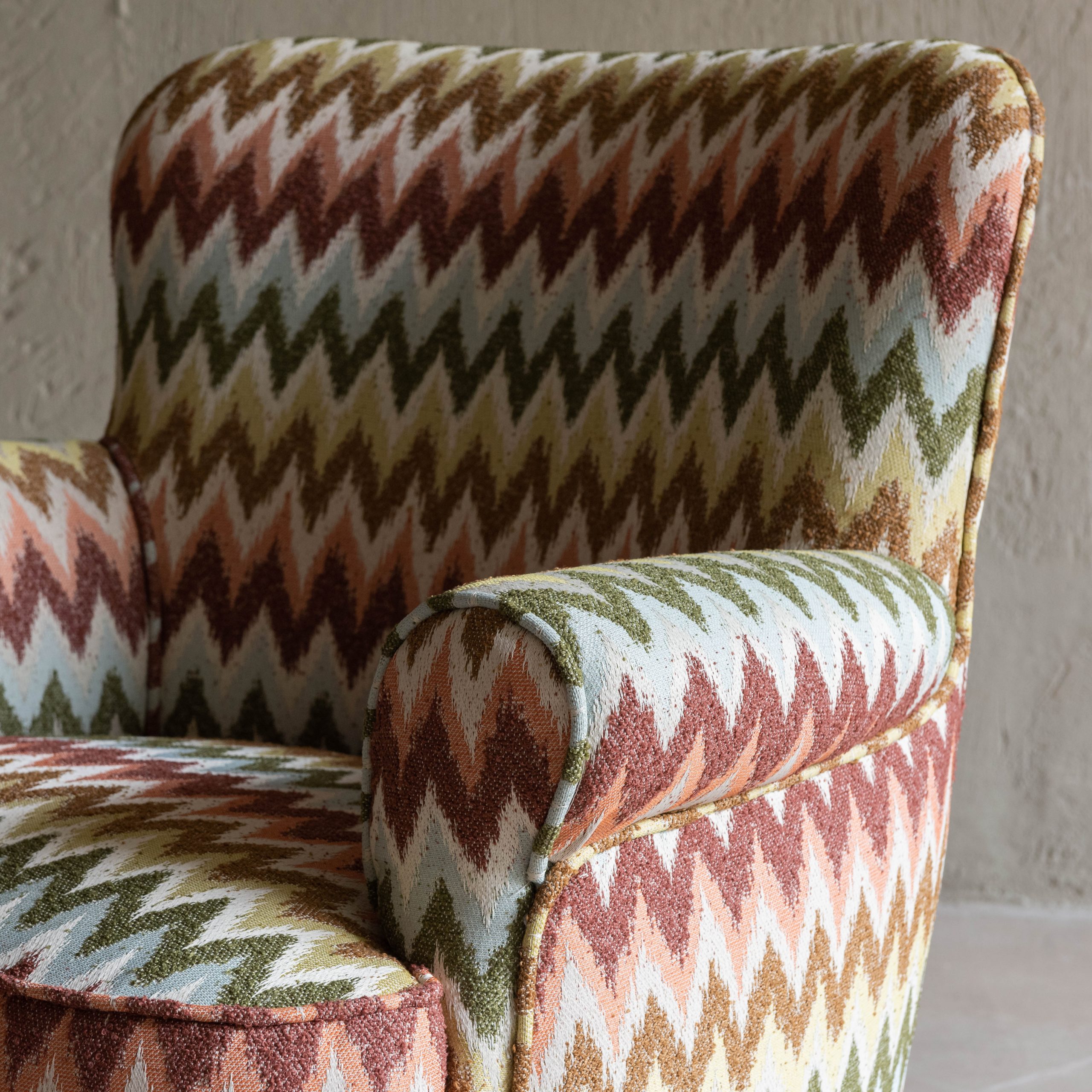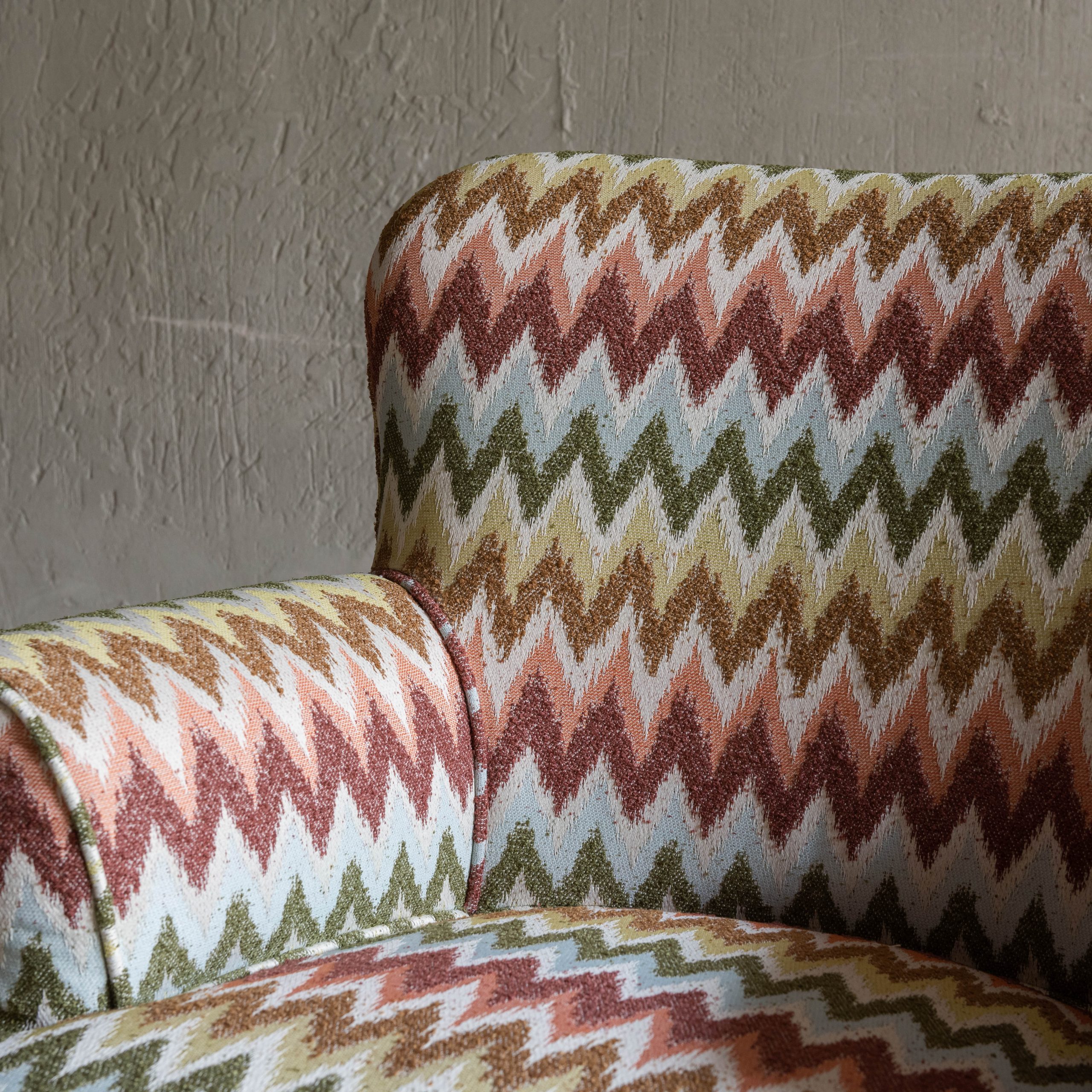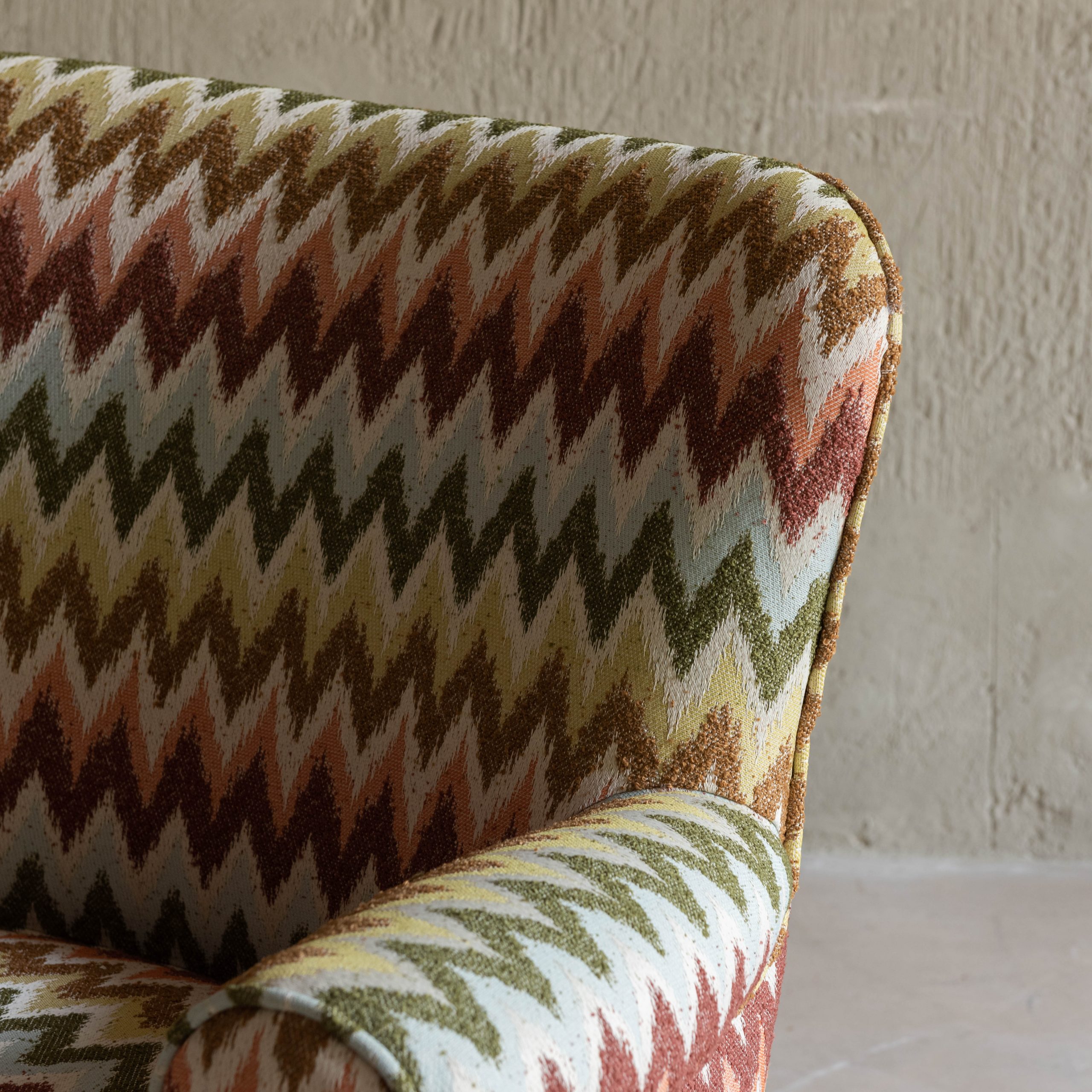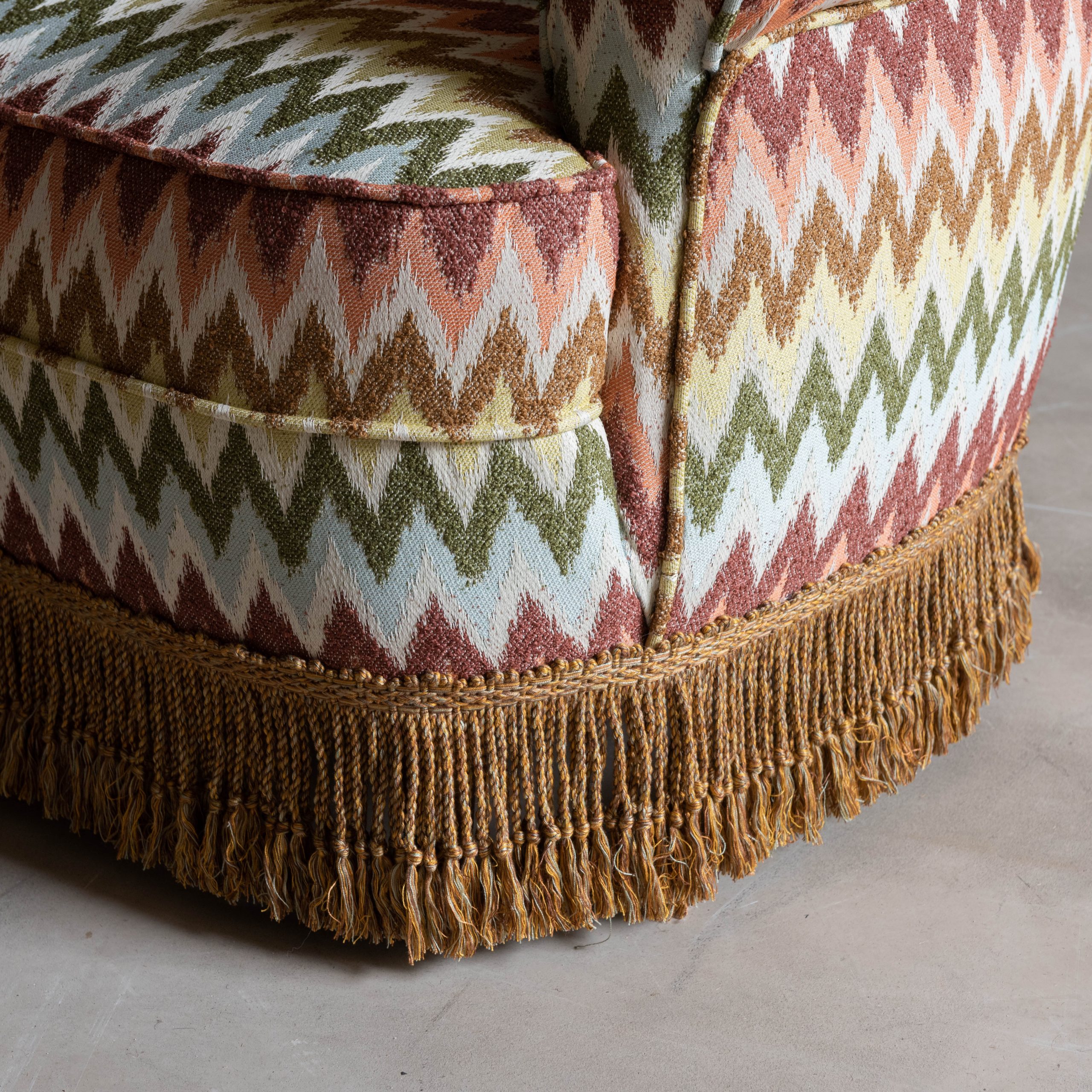 Pareja de butacas estilo inglés retapizadas zigzag. Estas butacas evocan el encanto del diseño retro con un aire cálido y acogedor. Tapizadas con un vibrante estampado de zigzag en coloridos tonos amarillo, terracota y verde, aportan una sensación de dinamismo y alegría al espacio. Sus formas redondeadas, con brazos suavemente curvados y respaldo envolvente, invitan al descanso y al confort. La base rematada con flecos dorados añade un toque y sofisticado. Estas piezas no son solamente funcionales, sino también elementos decorativos, mezcla entre lo clásico y lo atrevido.