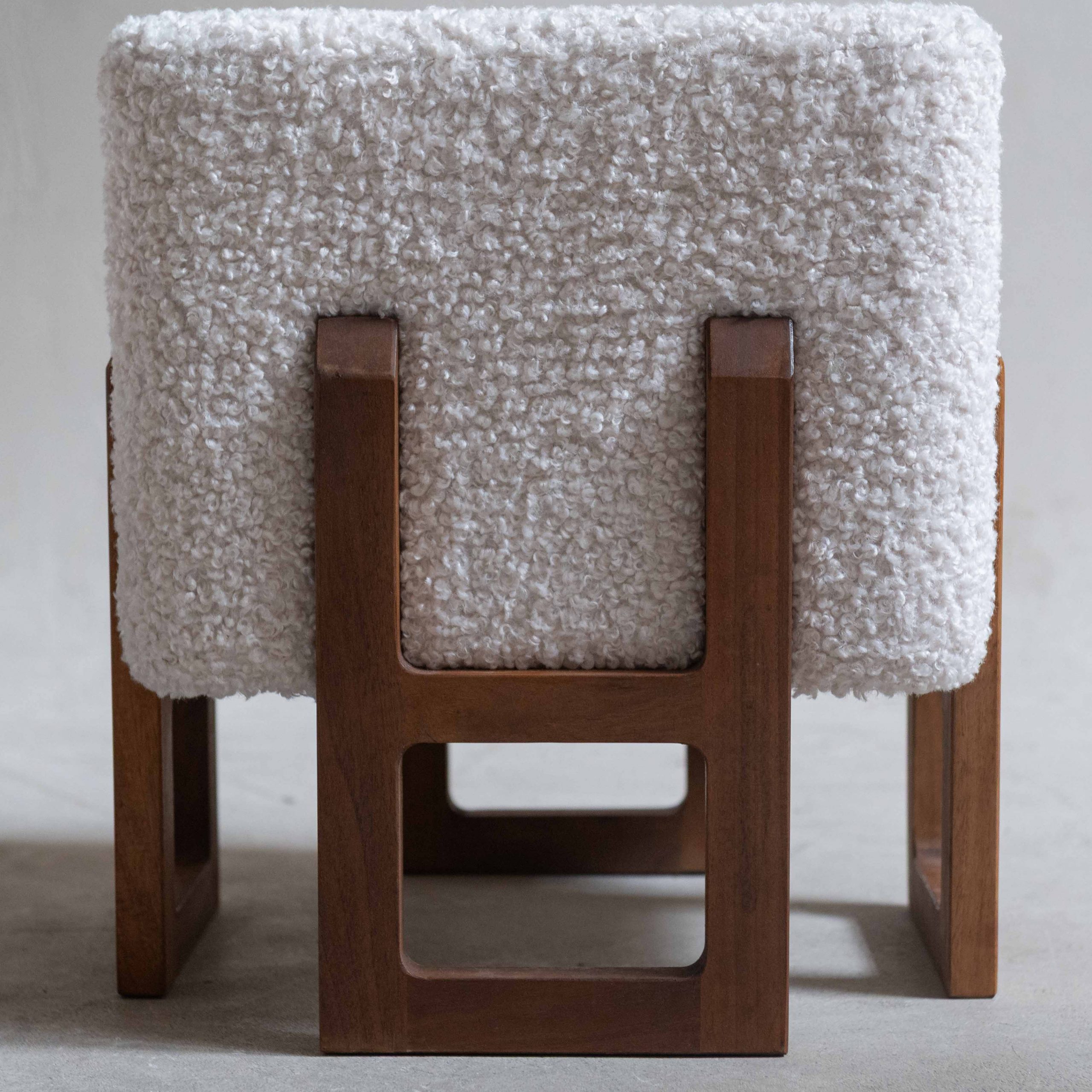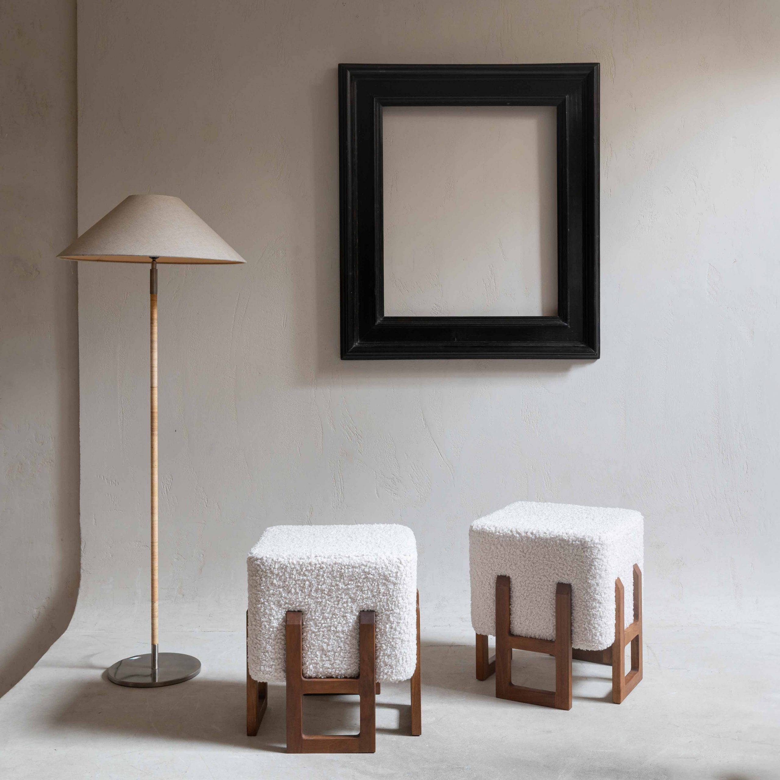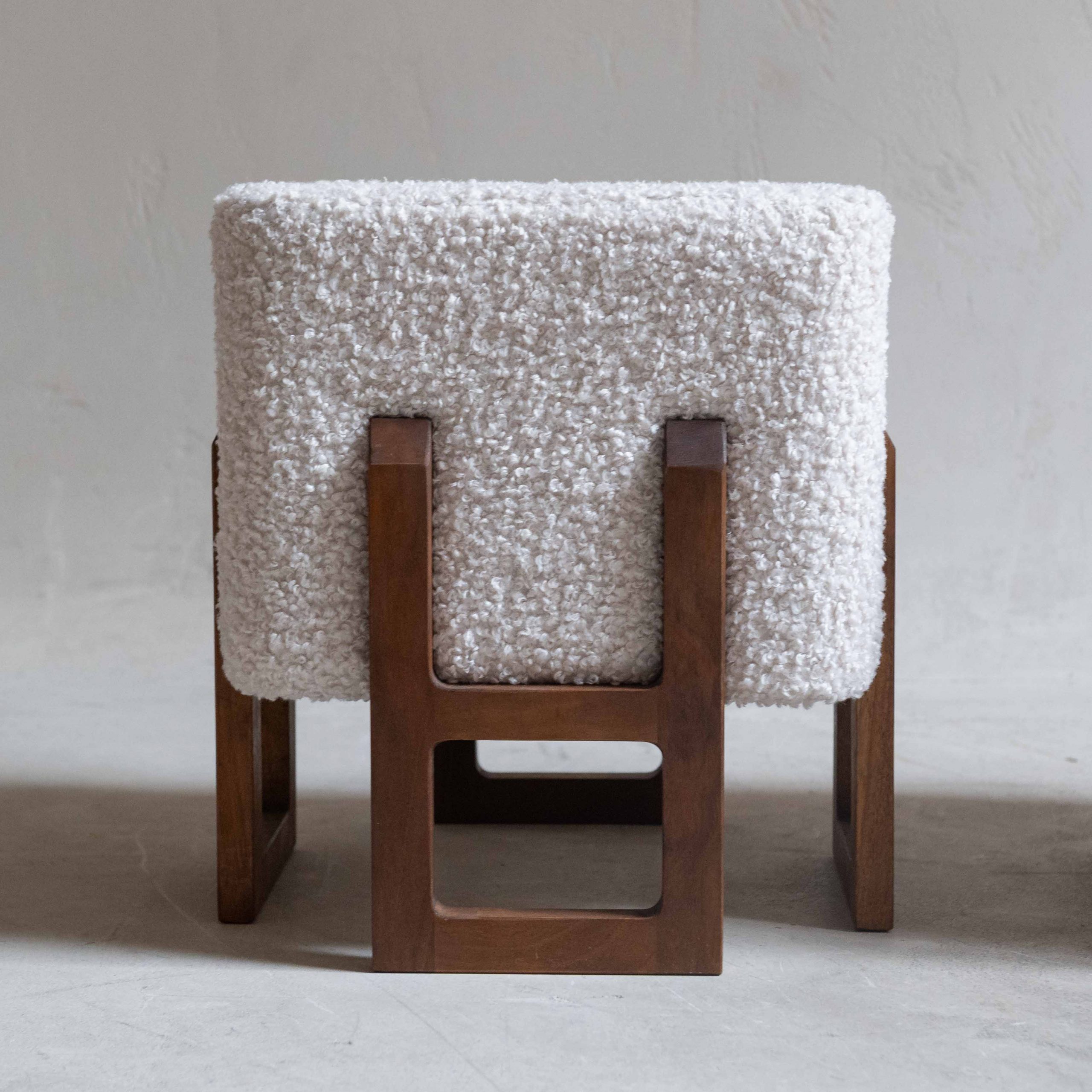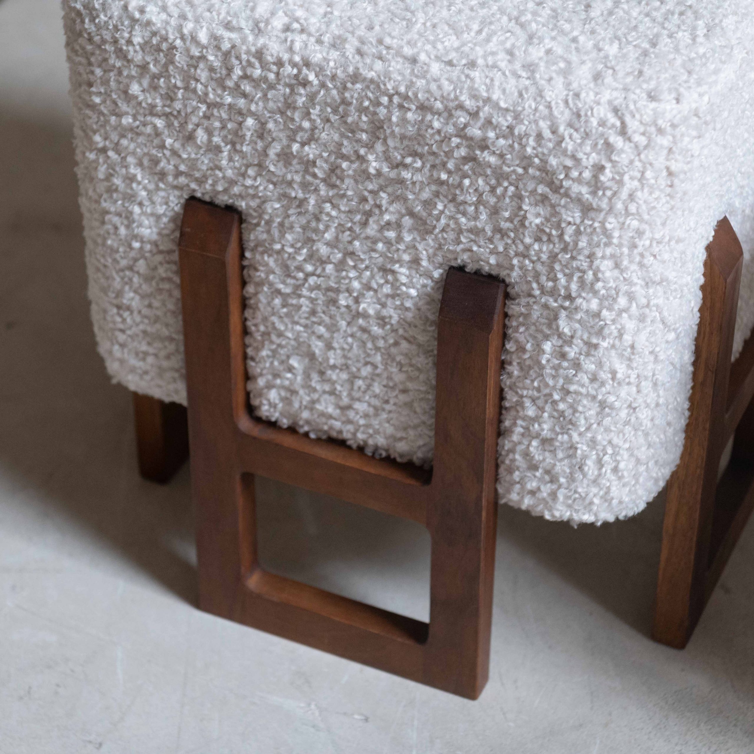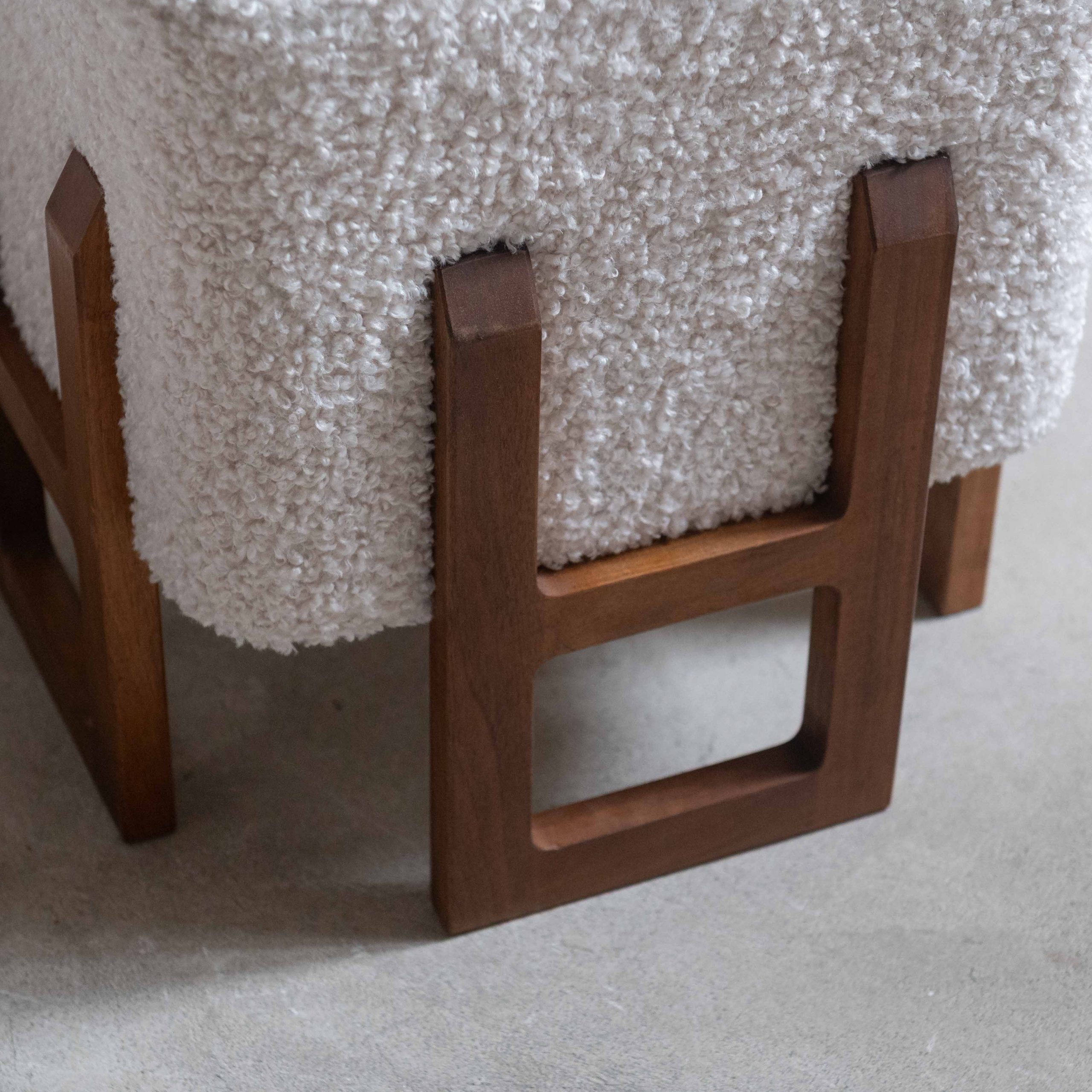 Pareja de pufs italianos años 70. Esta pareja de pufs italianos vintage destaca por su elegancia serena y su equilibrio entre diseño escultórico y confort. Los asientos, generosamente acolchados y tapizados en un tejido buclé color marfil, aportan una textura suave y acogedora que invita al descanso. Su forma compacta y cúbica crea una presencia sólida pero ligera, perfecta para integrarse con naturalidad en distintos espacios. La base está realizada en madera maciza de tono cálido, trabajada con líneas geométricas limpias con patas estructurales, abiertas y arquitectónicas. El contraste entre la calidez de la madera y la suavidad del buclé claro crea una armonía visual muy característica del diseño italiano vintage: refinada, moderna y atemporal. Ideales como asientos auxiliares, reposapiés o piezas decorativas en sí mismas.