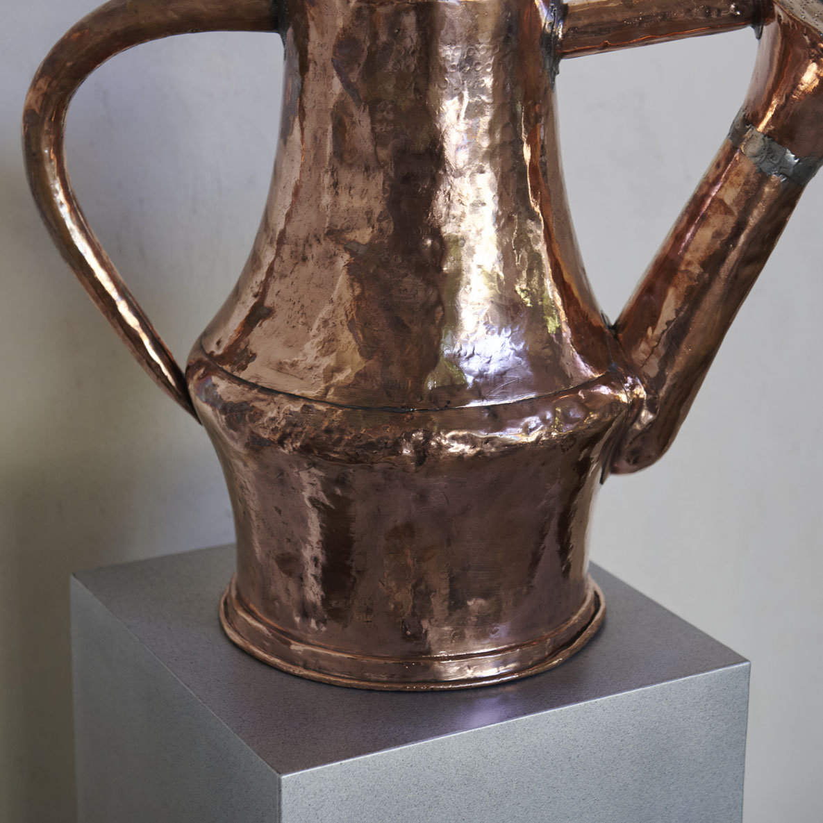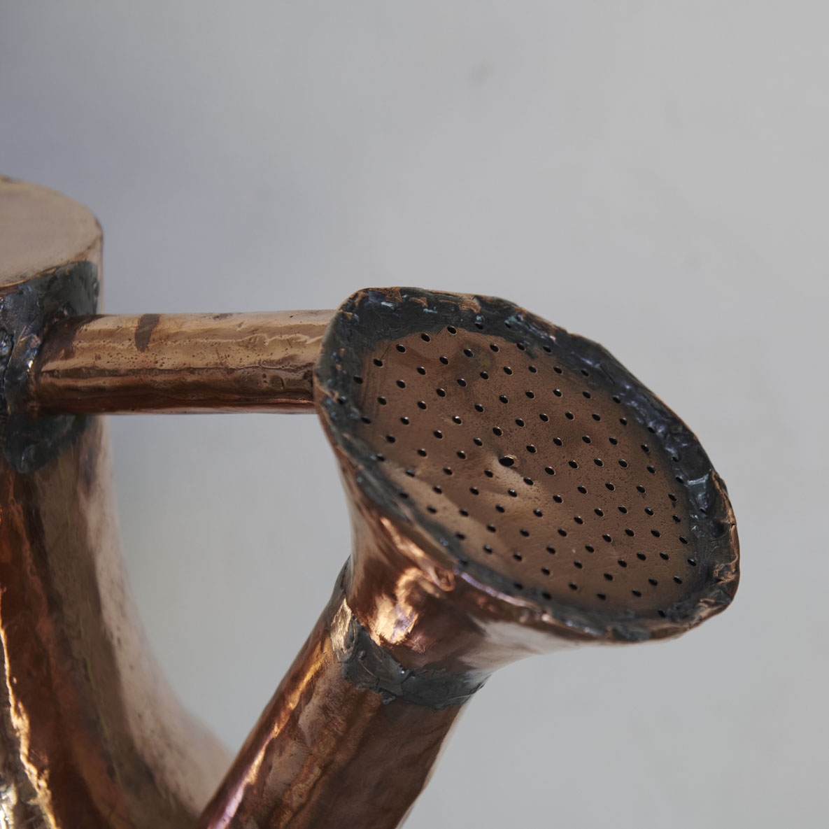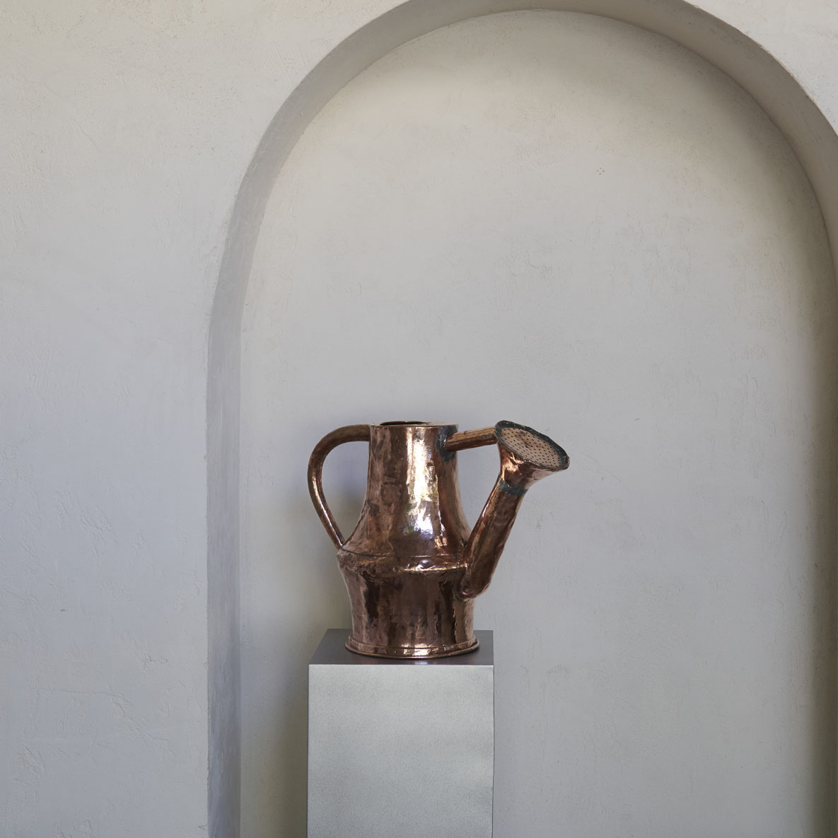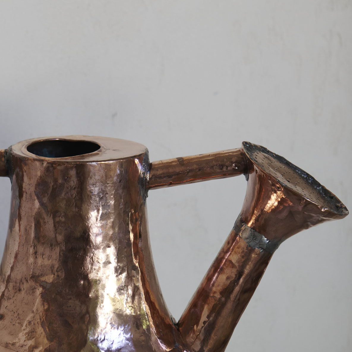 Regadera de cobre del siglo XVIII. Elaborada en Francia en bonito cobre amartillado, esta pieza muestra el trabajo artesanal de la época con un sofisticado aire Art Decó. Su estructura robusta y su forma suave, acentuada por los relieves del martillo, destacan la belleza del cobre, con su cálido tono rojizo que ha adquirido una pátina natural a lo largo del tiempo, lo que le da una belleza única y auténtica.