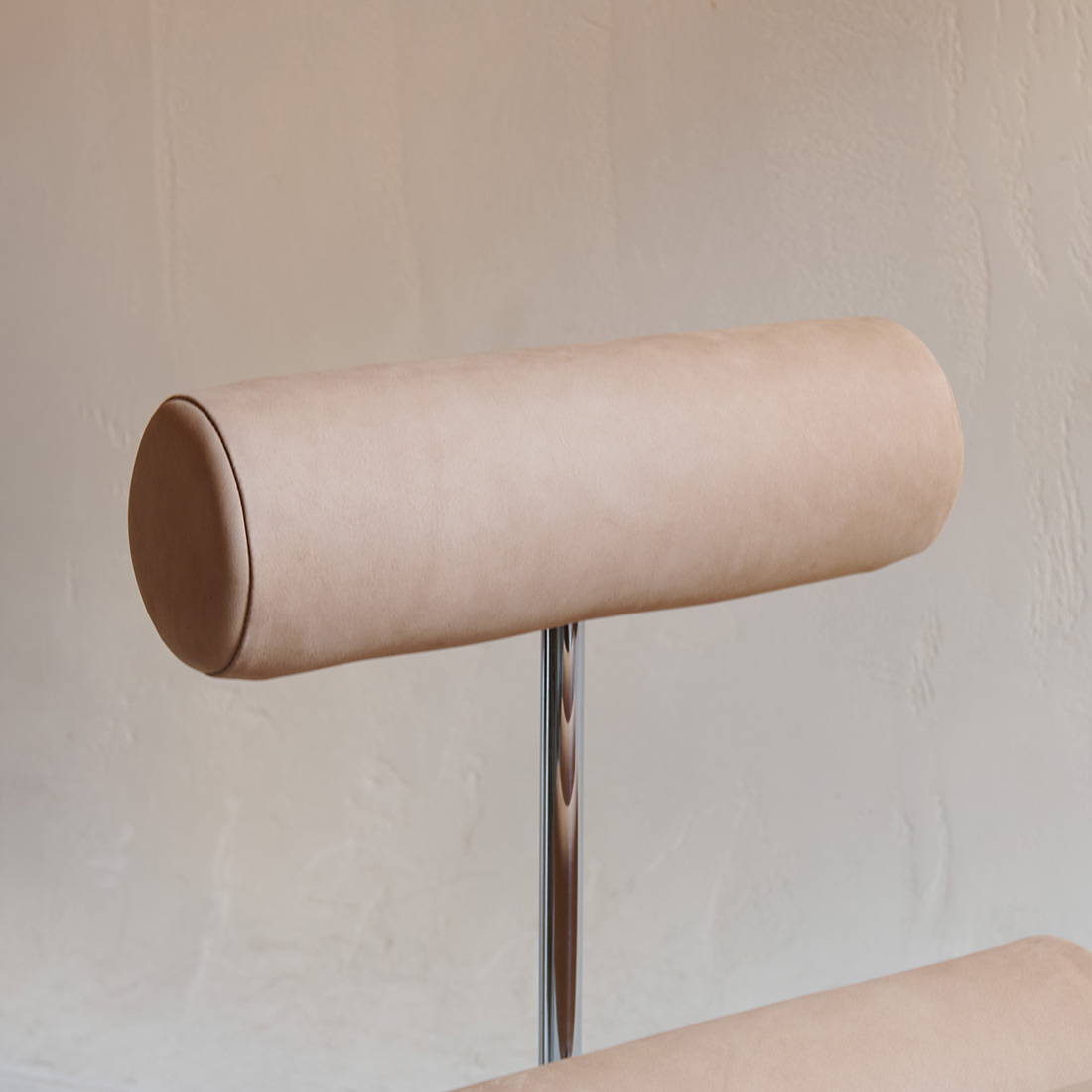 Silla de acero y piel nobuk. Original silla de diseño fabricada en acero inoxidable y piel nobuk, un tipo de cuero de alta calidad que se obtiene puliendo ligeramente la cara exterior de la piel, dando lugar a una textura suave y aterciopelada, similar al ante, pero con una mayor durabilidad y resistencia. Tiene un diseño escultural de tres patas muy minimalista y un original respaldo cilíndrico.