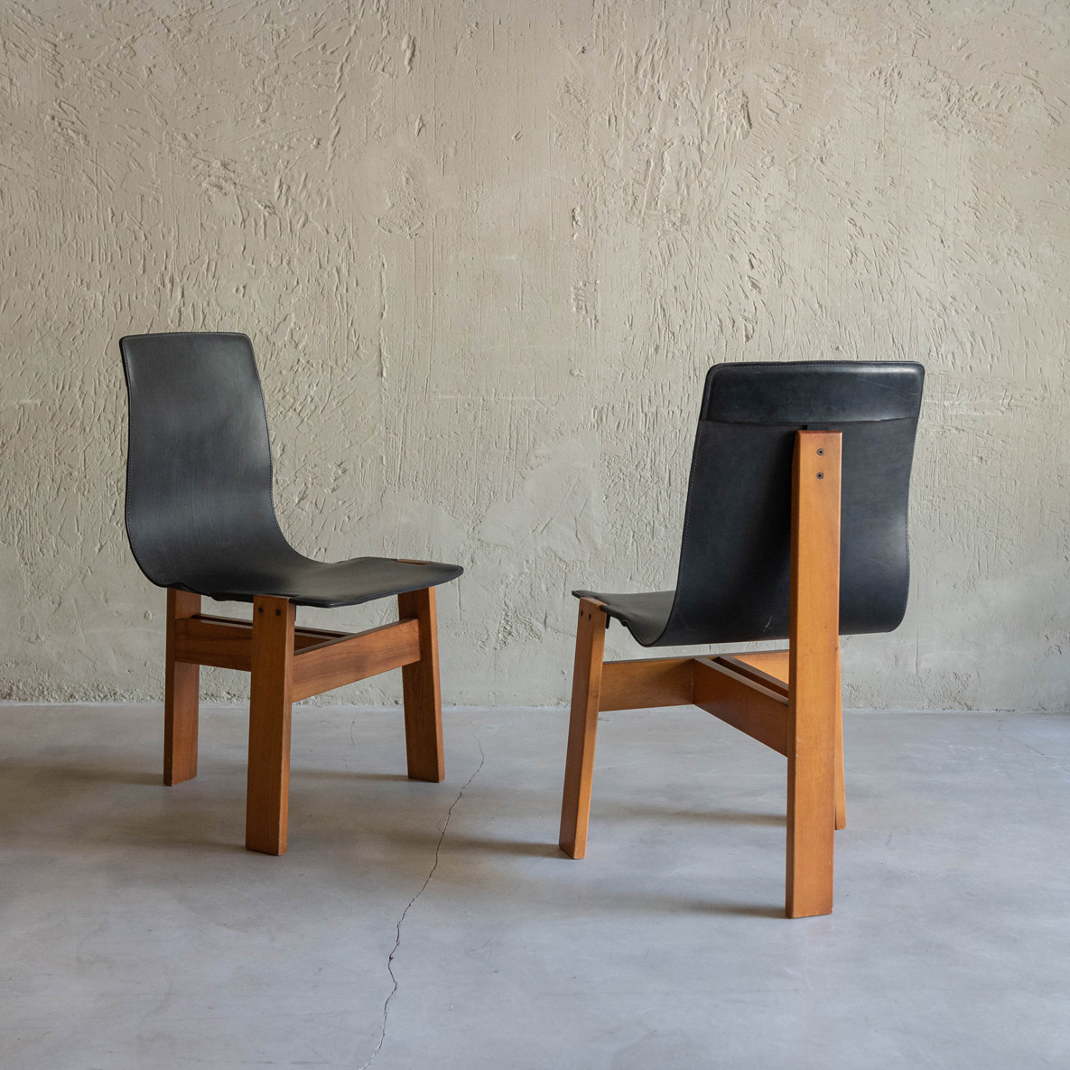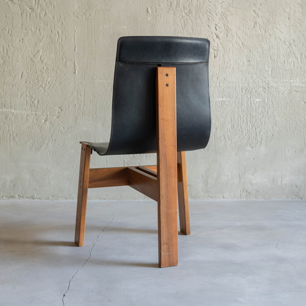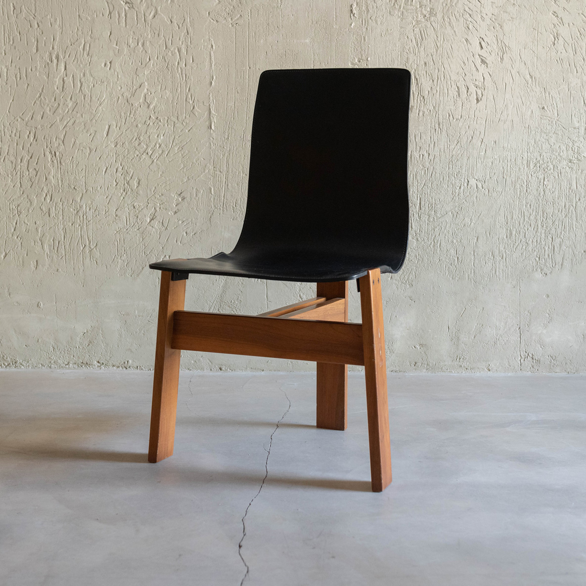 Silla de Ángelo Mamgiarotti años 60. De madera de roble y cuero natural, esta joya del diseño es el famoso modelo Tre 3 del italiano Ángelo Mamgiarotti, arquitecto e icónico diseñador procedente de Milán. Una expresión sublime de la arquitectura aplicada al mobiliario. Su estructura transmite una armonía de formas esenciales, donde cada línea parece pensada con precisión casi escultórica. El respaldo y el asiento, moldeados en una sola pieza de cuero negro, fluyen con elegancia ergonómica, adaptándose al cuerpo con una naturalidad silenciosa. El material, ligeramente envejecido, aporta carácter y una belleza que da el paso del tiempo. El contraste entre el cuero y la madera maciza de las patas refleja la filosofía de Mangiarotti: dejar que los materiales hablen por sí mismos.