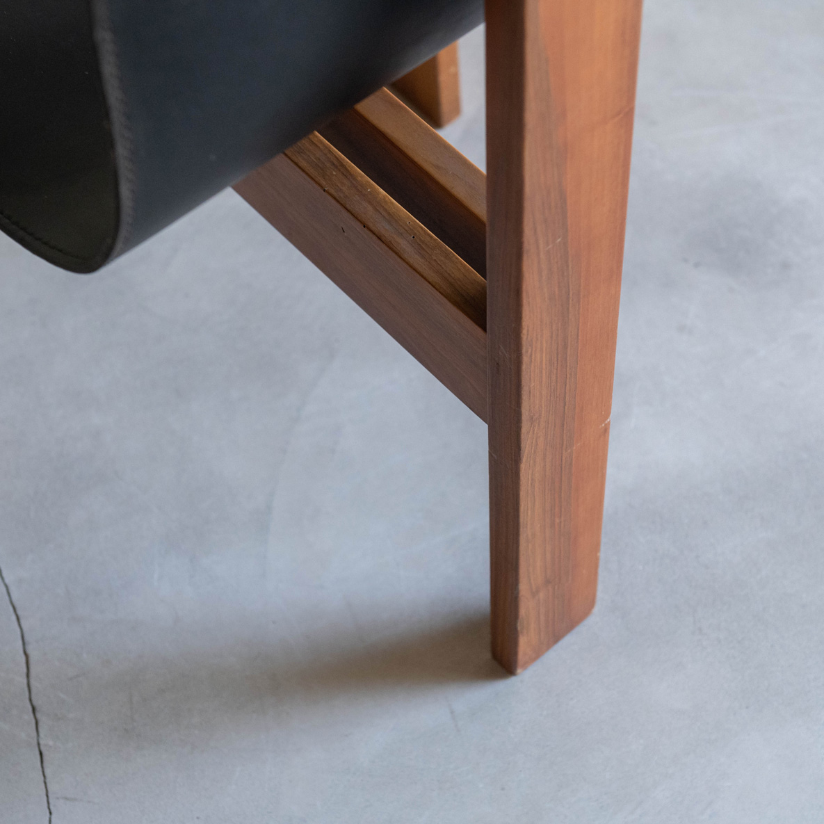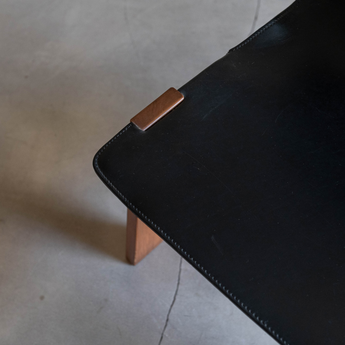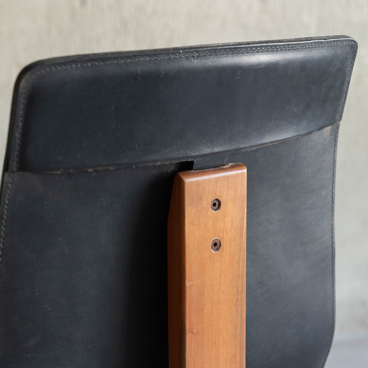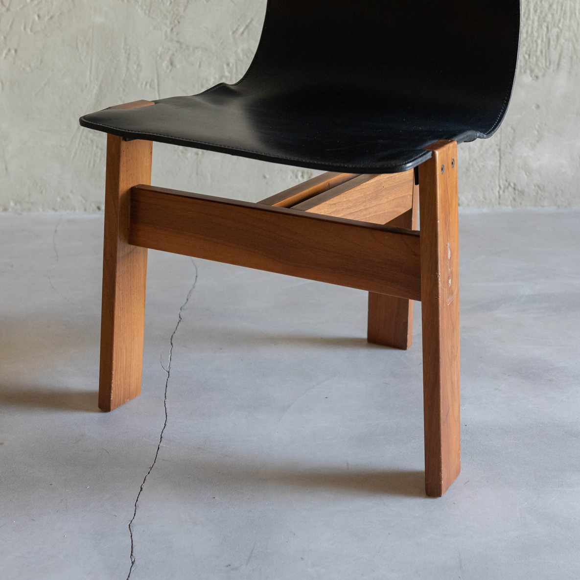Silla de Ángelo Mamgiarotti años 60. De madera de roble y cuero natural, esta joya del diseño es el famoso modelo Tre 3 del italiano Ángelo Mamgiarotti, arquitecto e icónico diseñador procedente de Milán. Una expresión sublime de la arquitectura aplicada al mobiliario. Su estructura transmite una armonía de formas esenciales, donde cada línea parece pensada con precisión casi escultórica. El respaldo y el asiento, moldeados en una sola pieza de cuero negro, fluyen con elegancia ergonómica, adaptándose al cuerpo con una naturalidad silenciosa. El material, ligeramente envejecido, aporta carácter y una belleza que da el paso del tiempo. El contraste entre el cuero y la madera maciza de las patas refleja la filosofía de Mangiarotti: dejar que los materiales hablen por sí mismos.