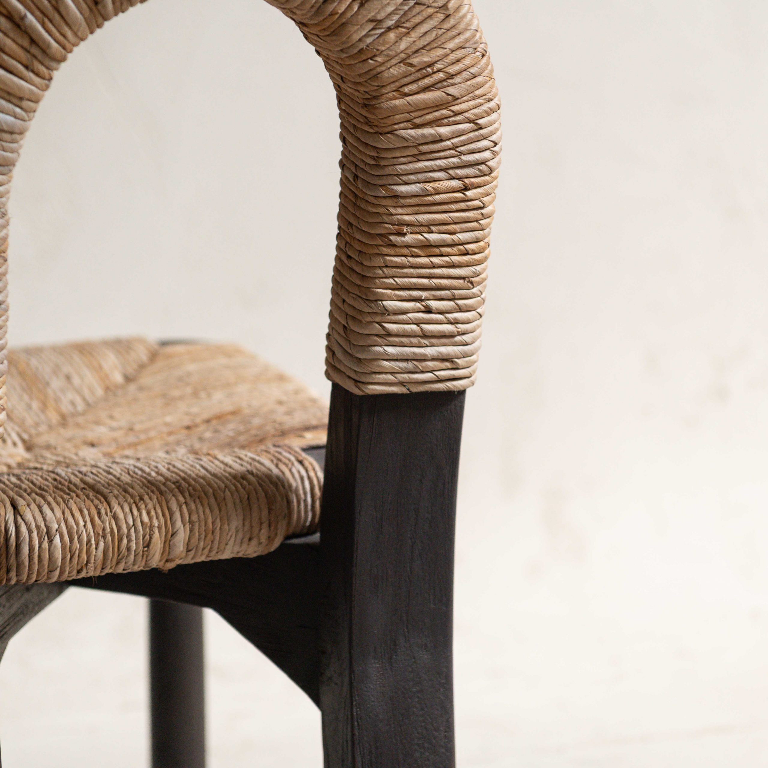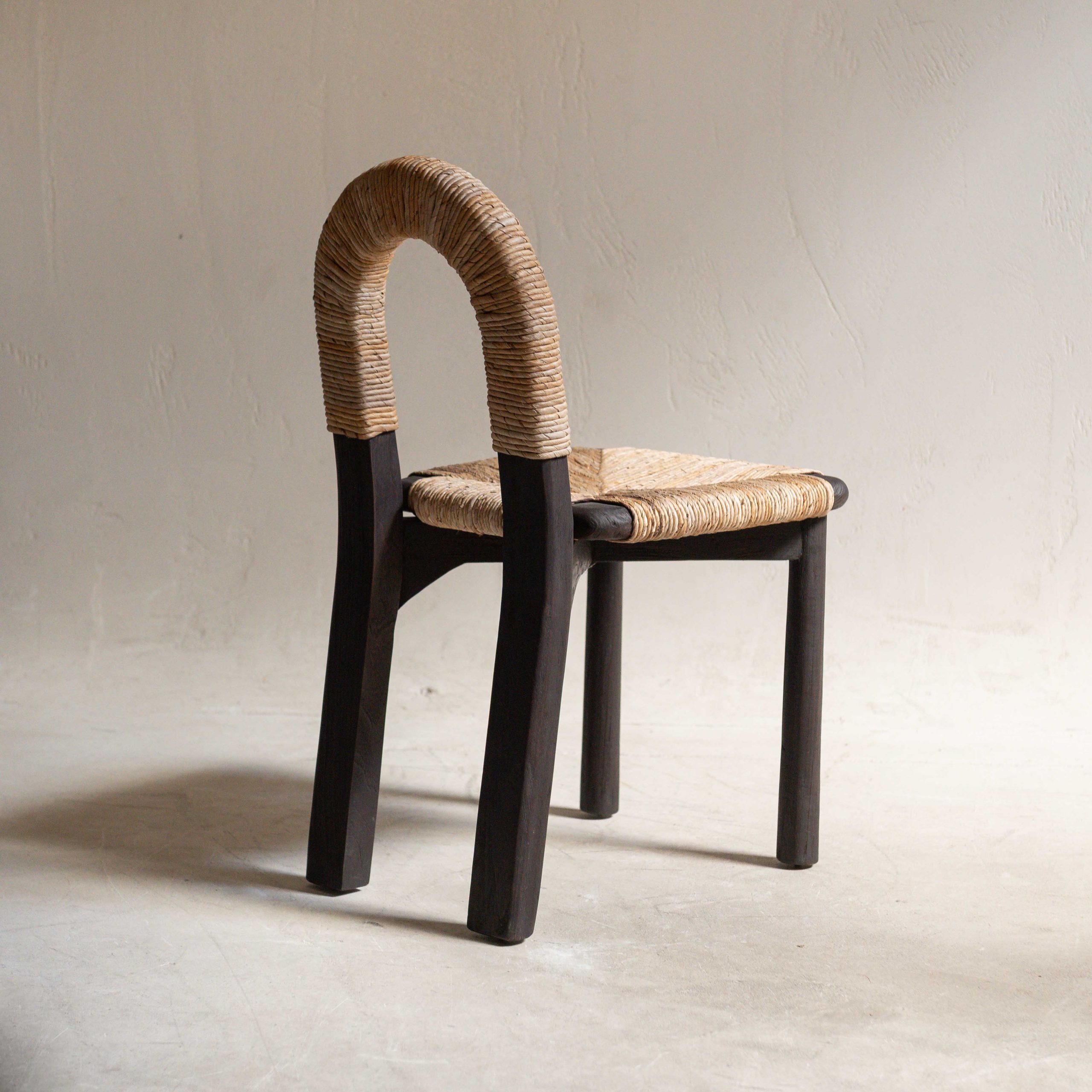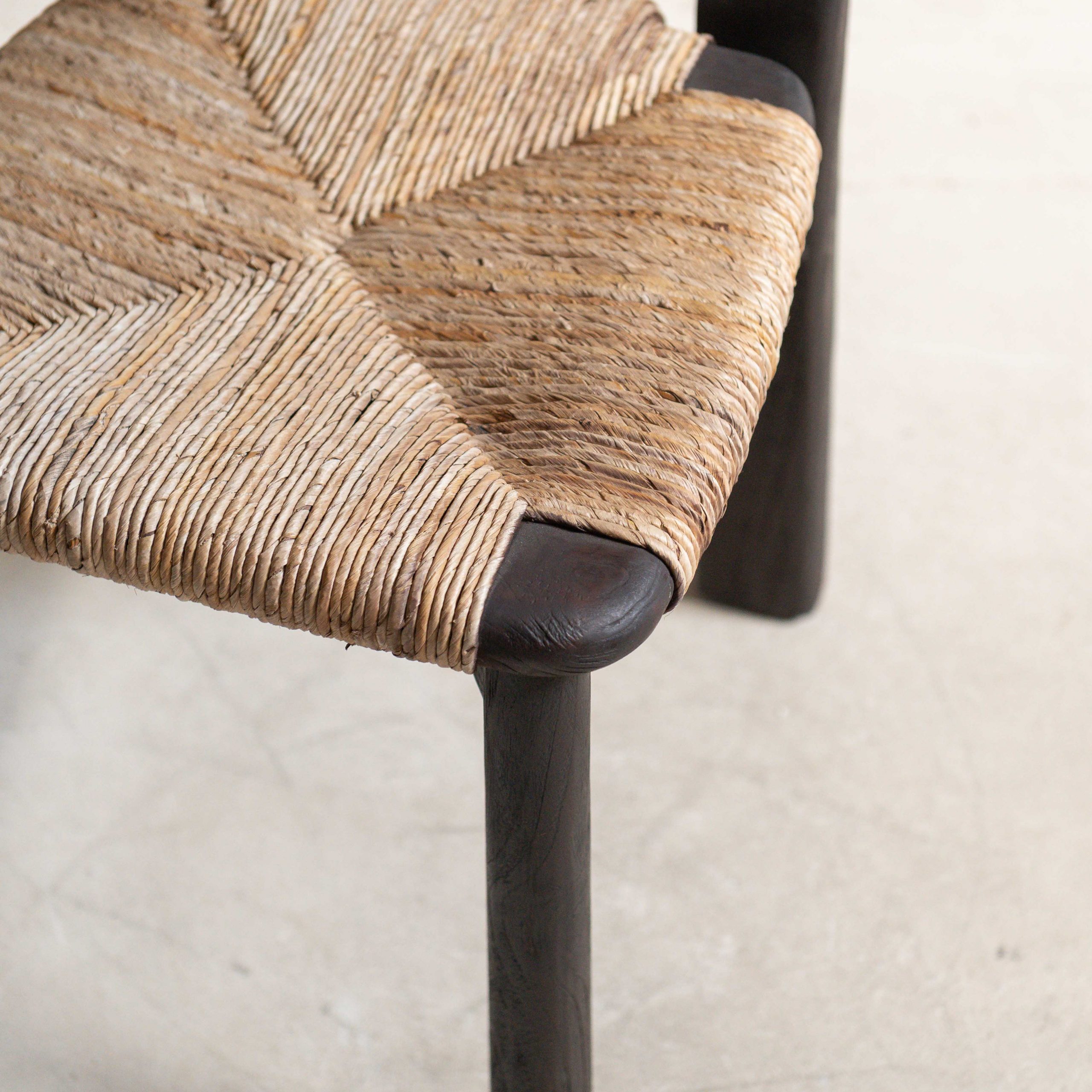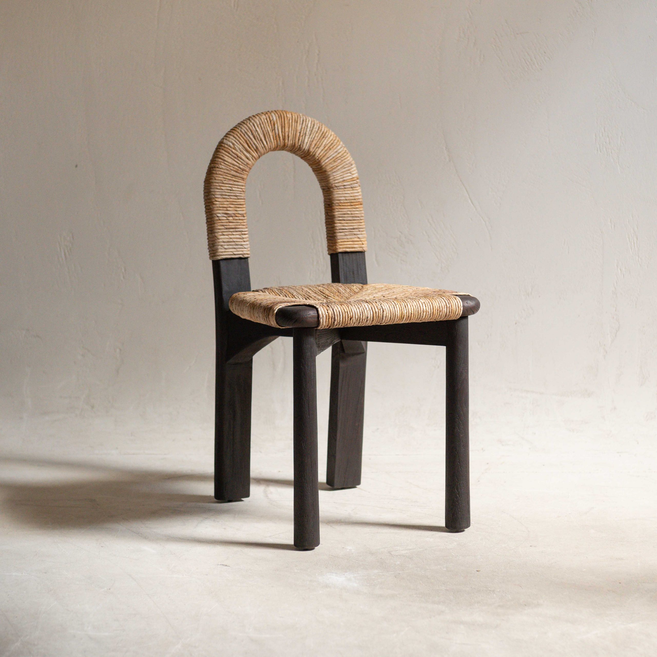 Silla de madera de teca. Tiene una belleza serena y muy natural. Su estructura, de madera oscura de teca maciza y reciclada procedente de Indonesia, aporta solidez y carácter mientras que el asiento y el respaldo, tejidos con fibras claras, crean un contraste cálido y armonioso. El respaldo en forma de arco envuelve suavemente, con gesto acogedor. Las líneas son sencillas pero cuidadosamente pensadas, dando como resultado una pieza que combina lo artesanal con lo contemporáneo. La textura del tejido añade un toque orgánico.