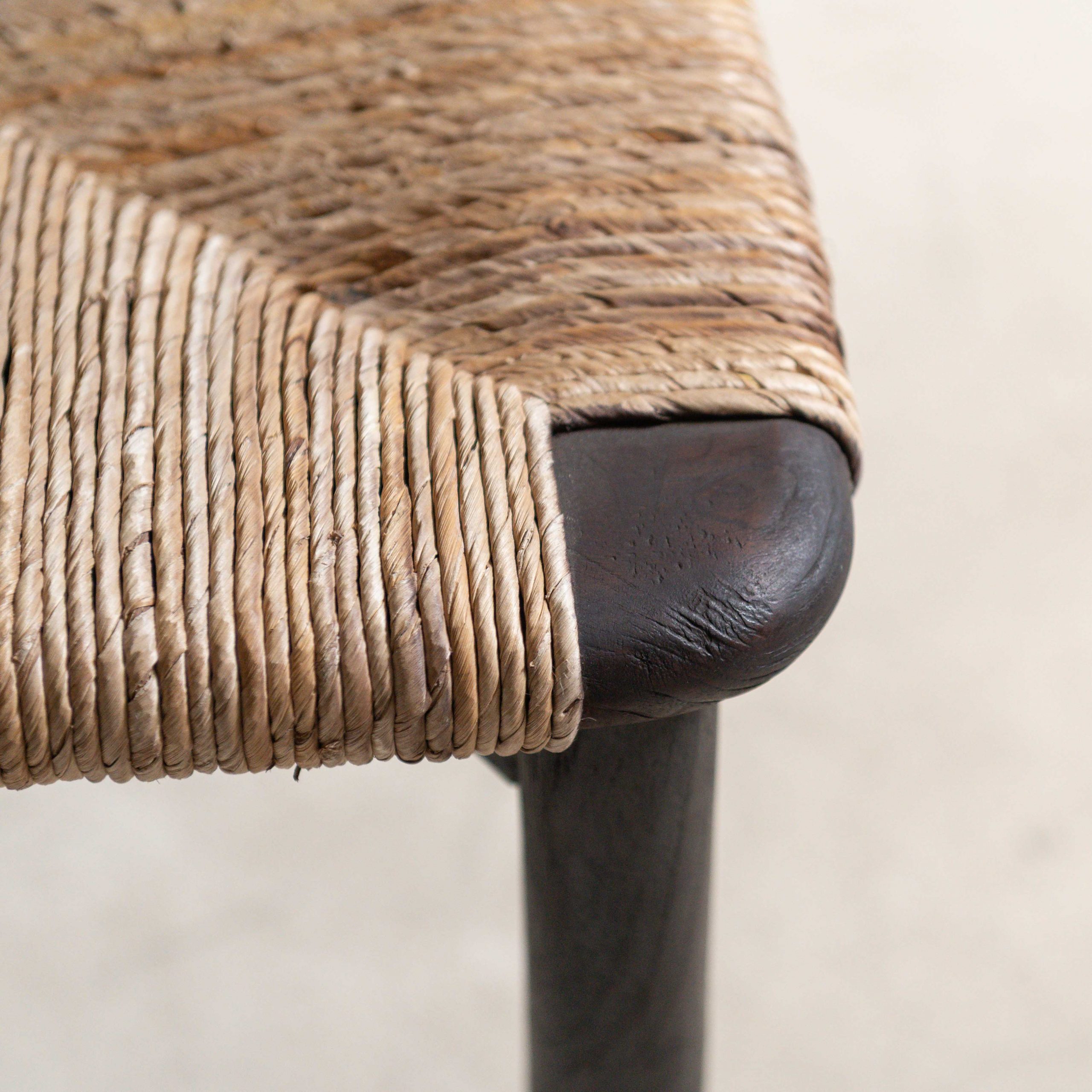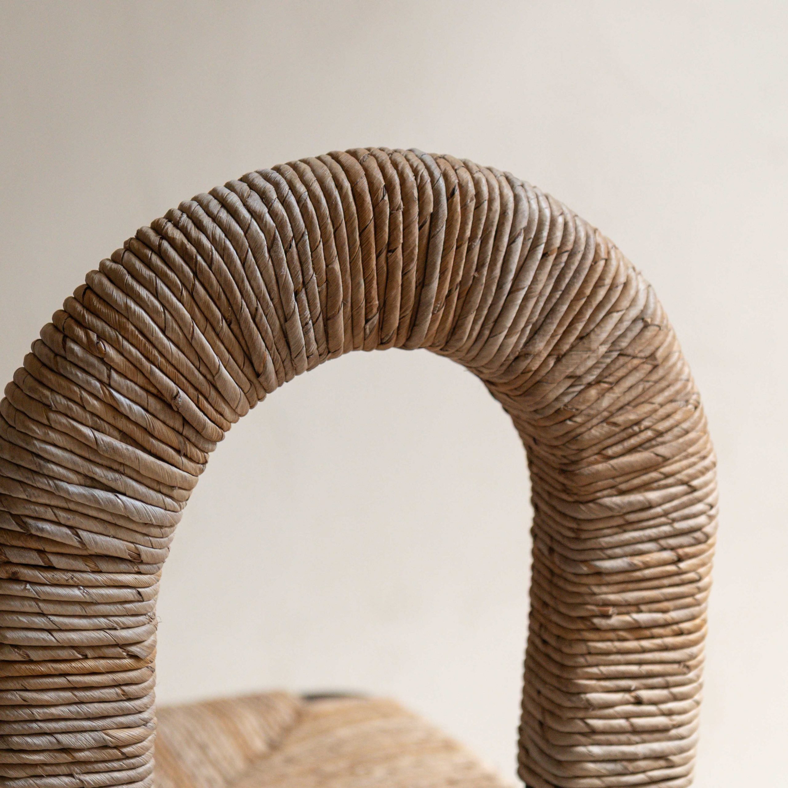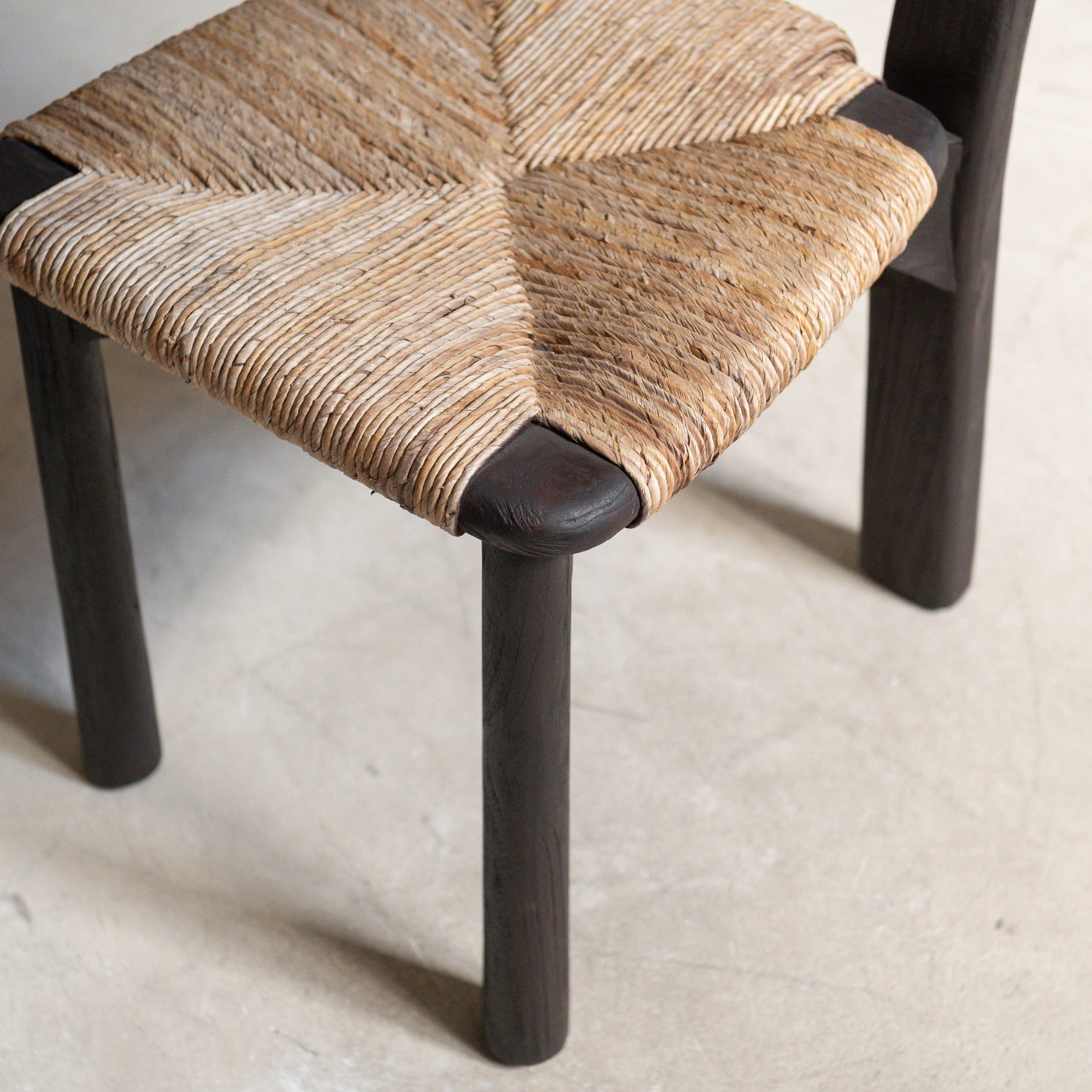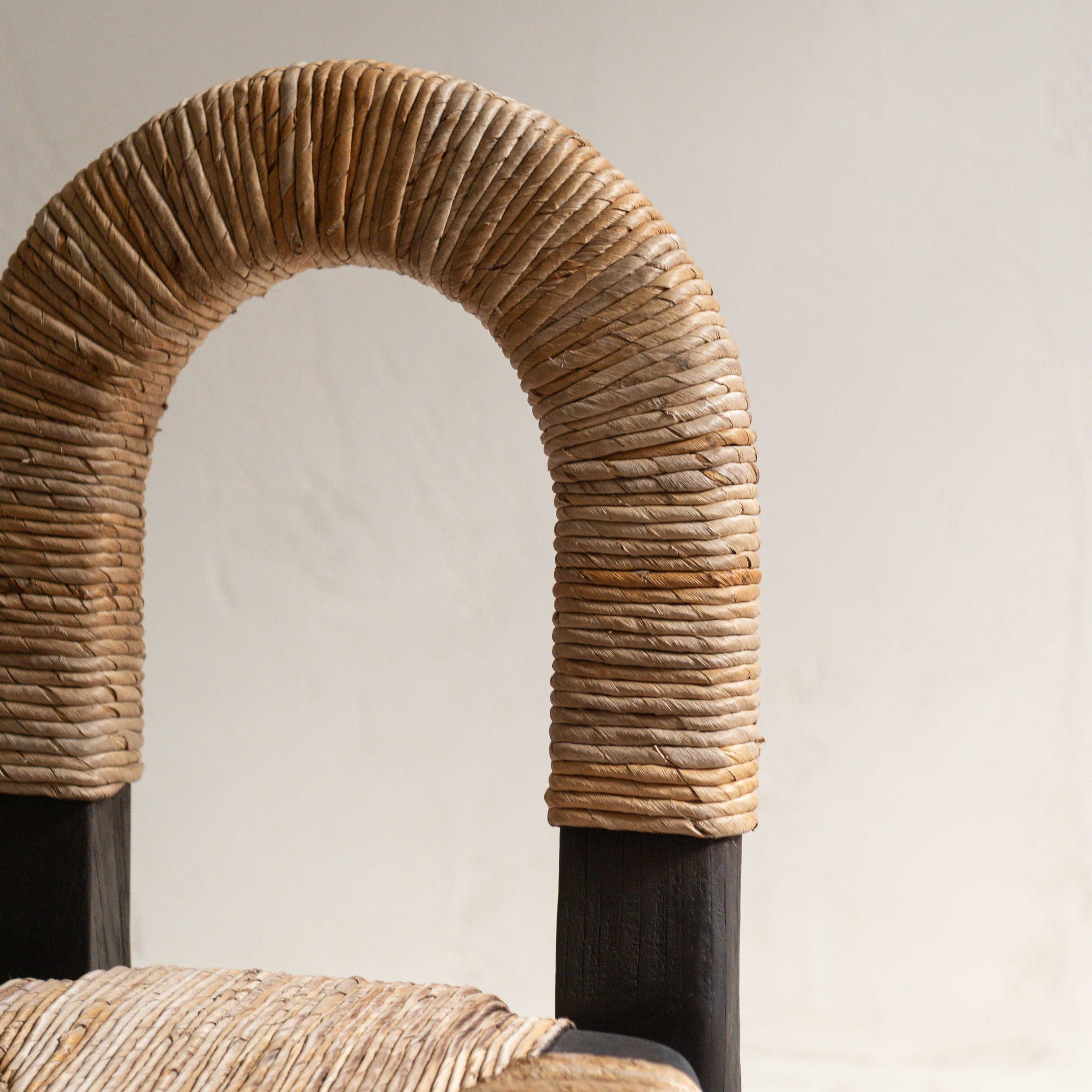 Silla de madera de teca. Tiene una belleza serena y muy natural. Su estructura, de madera oscura de teca maciza y reciclada procedente de Indonesia, aporta solidez y carácter mientras que el asiento y el respaldo, tejidos con fibras claras, crean un contraste cálido y armonioso. El respaldo en forma de arco envuelve suavemente, con gesto acogedor. Las líneas son sencillas pero cuidadosamente pensadas, dando como resultado una pieza que combina lo artesanal con lo contemporáneo. La textura del tejido añade un toque orgánico.