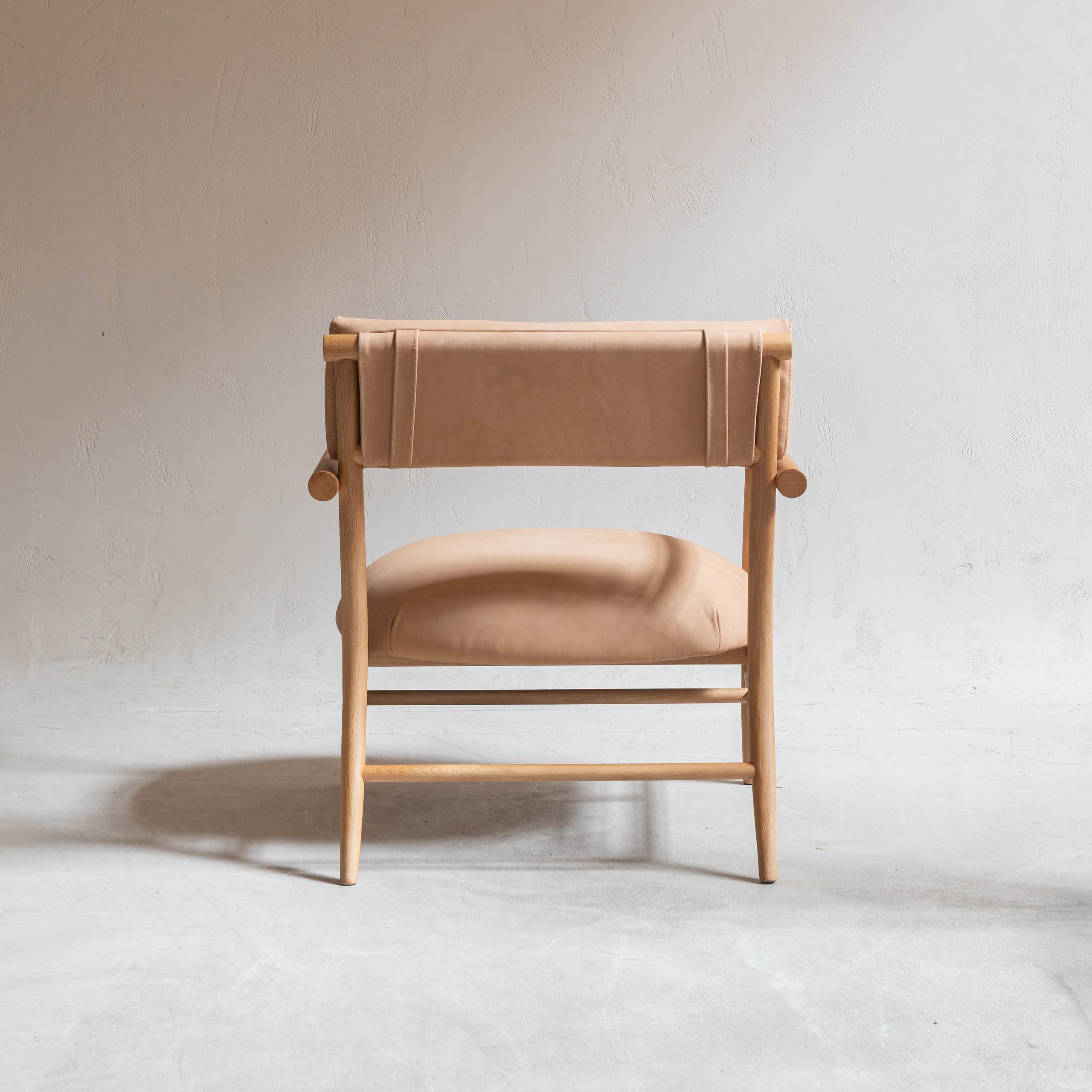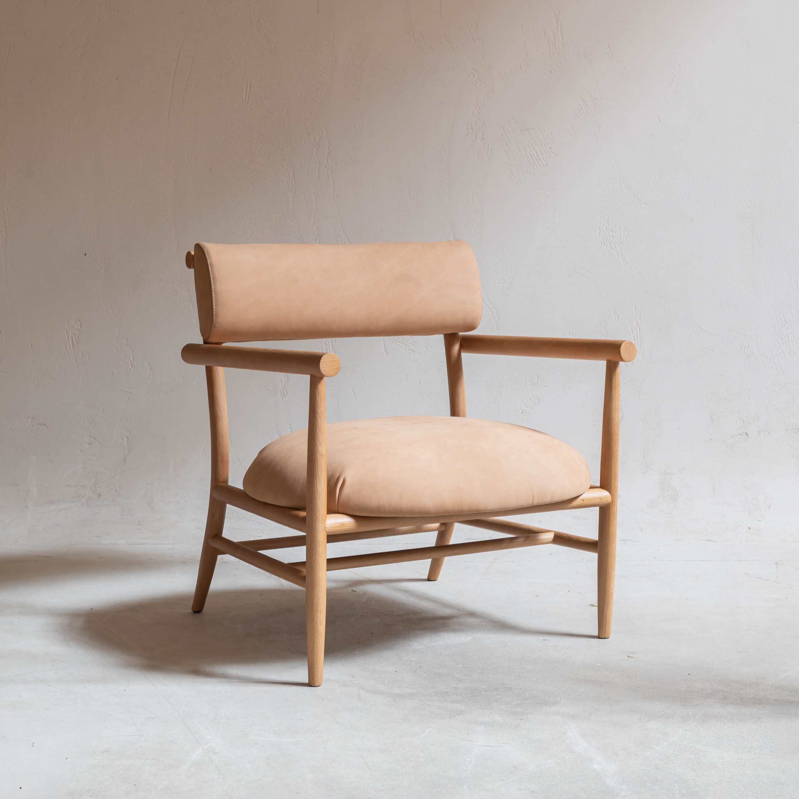 Sillón de madera y piel nobuk. Una pieza que combina la calidez de la madera natural con la suavidad envolvente de la piel nobuk en un diseño sereno y atemporal. Su estructura de líneas limpias y proporciones equilibradas transmite ligereza visual, mientras que los brazos y patas de madera maciza aportan solidez y carácter artesanal.