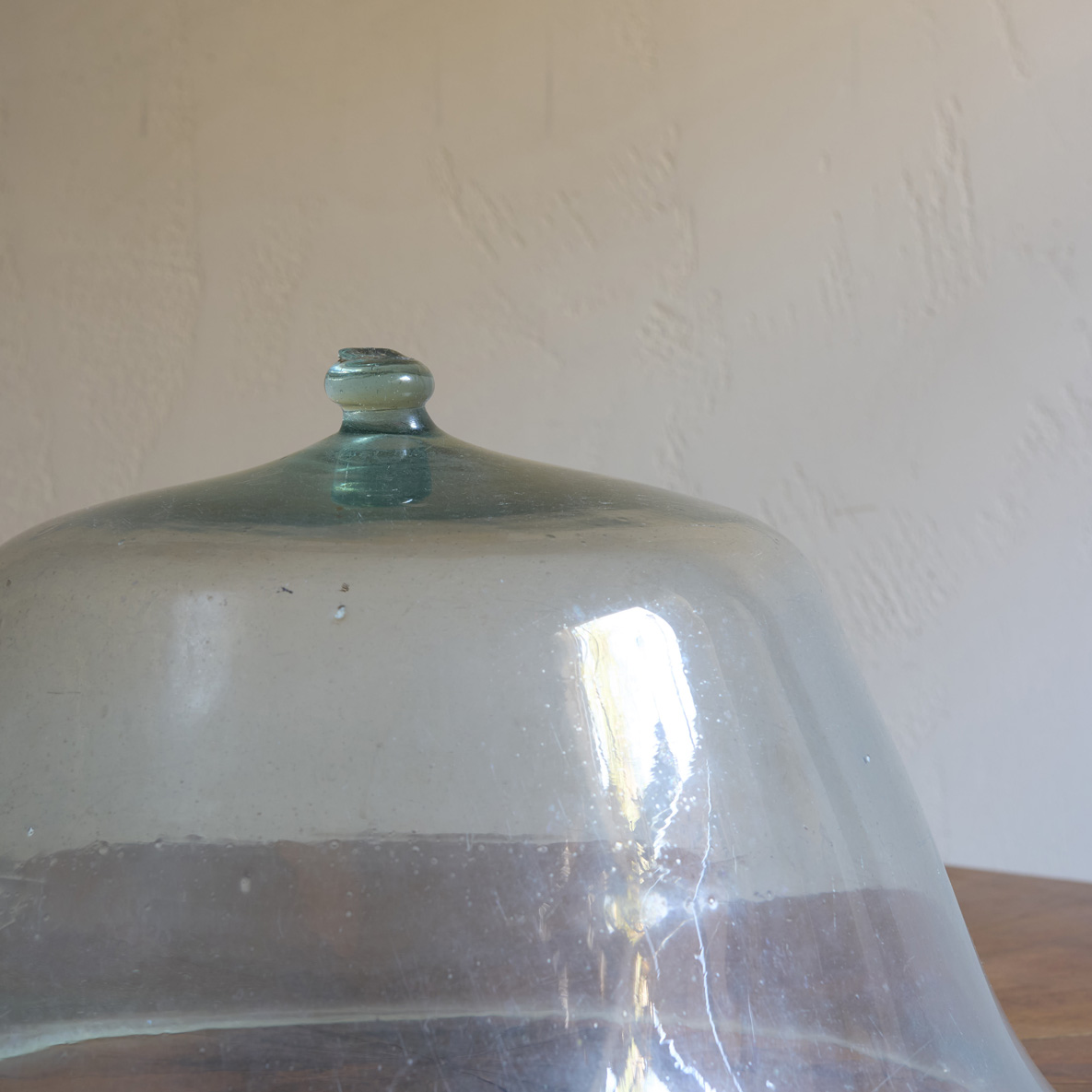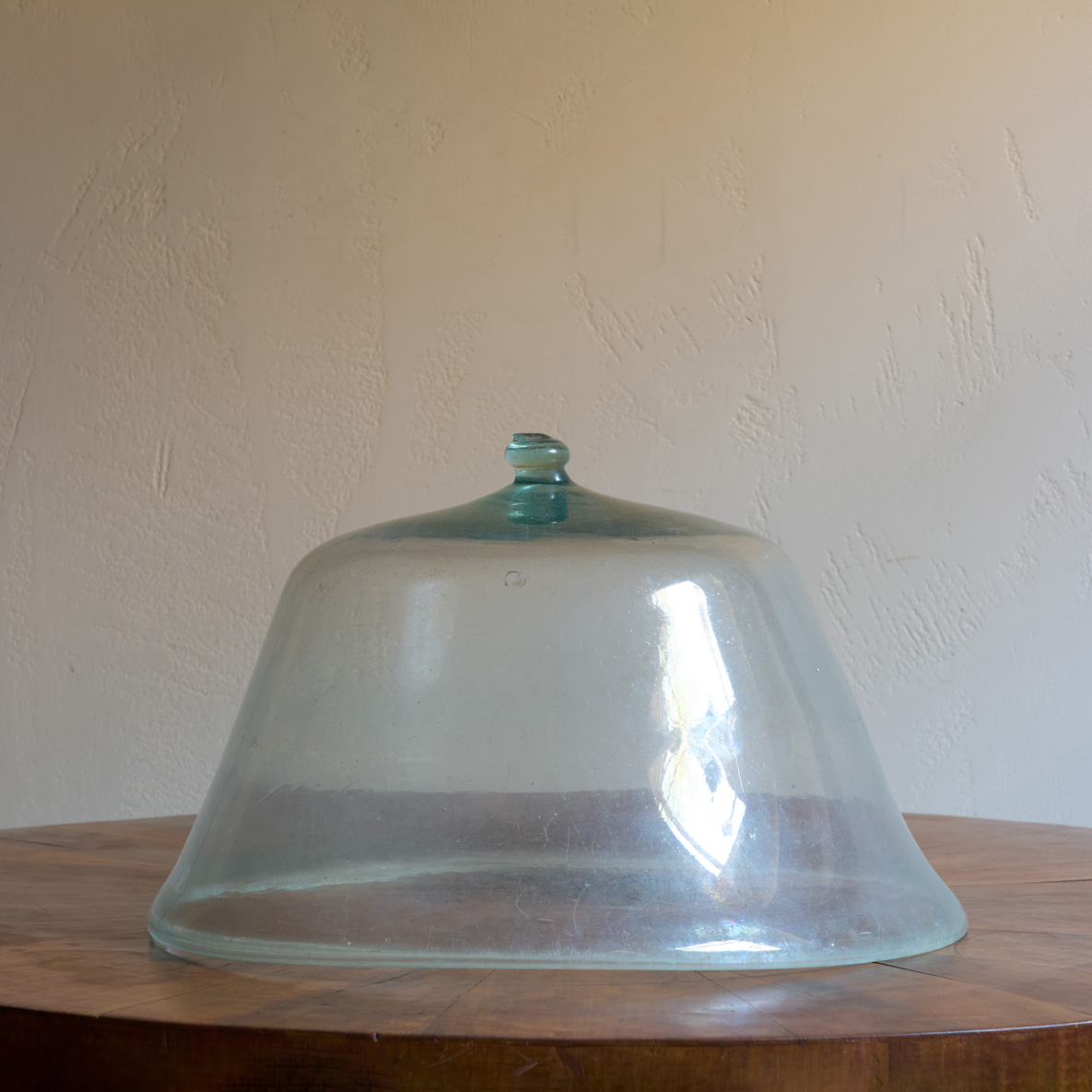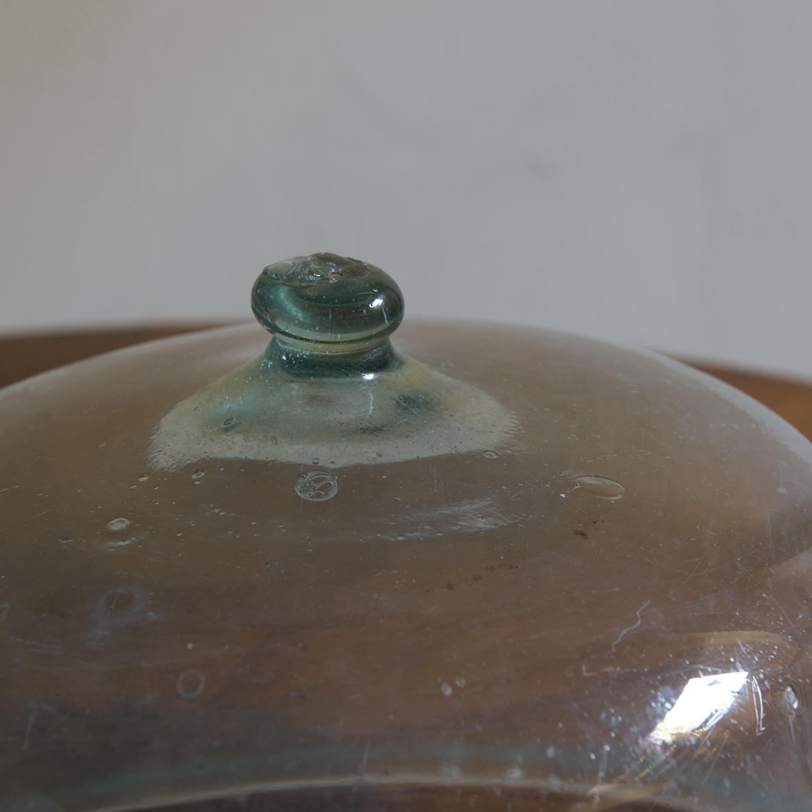 Esta tapa de vidrio antigua es una joya de sencillez y carácter. Su forma generosa y ligeramente acampanada, con líneas suaves y armoniosas, nos transporta a cocinas de antaño donde cada objeto tenía alma y propósito. El vidrio, con su leve tono verdoso y pequeñas burbujas atrapadas en su interior, revela el trabajo artesanal de otra época.