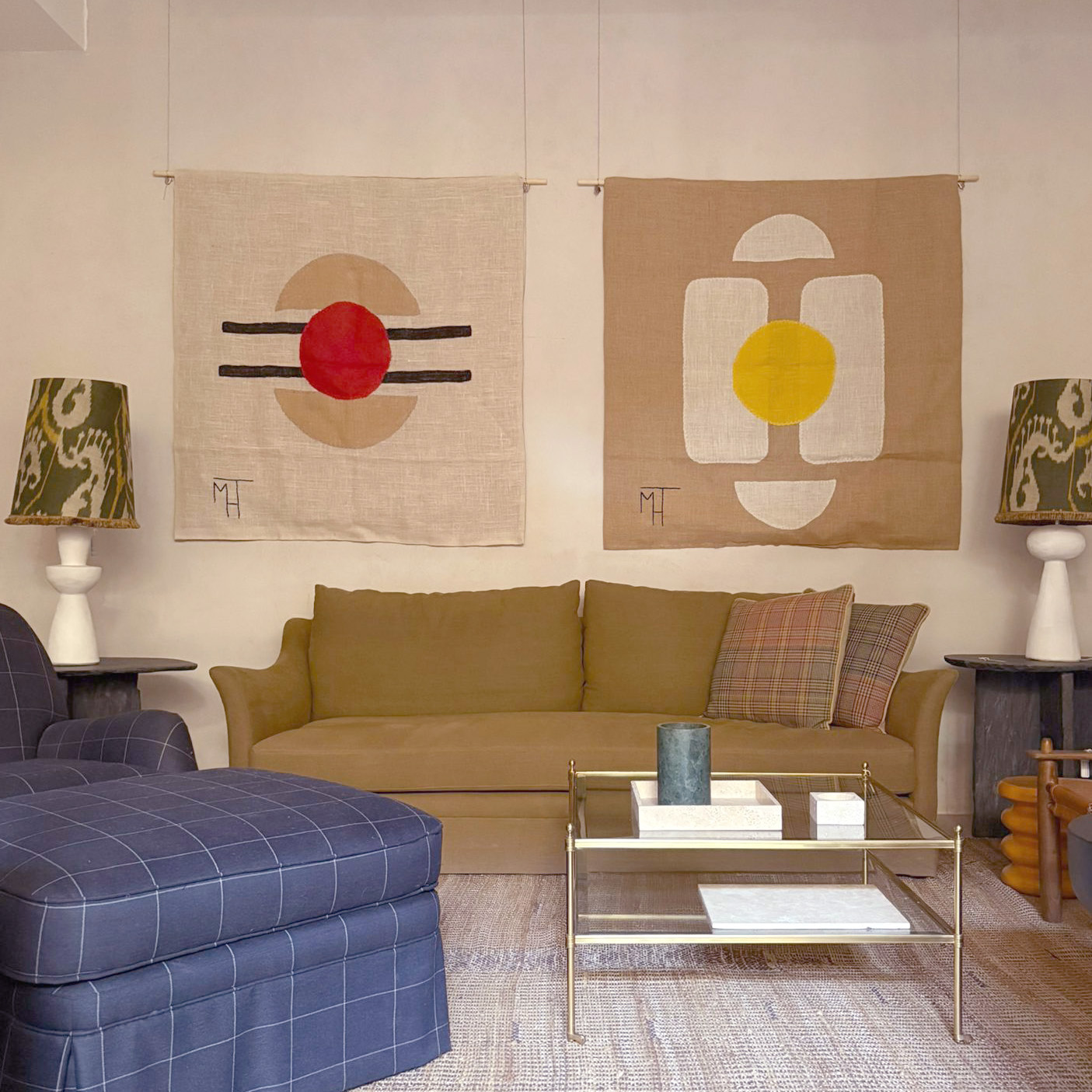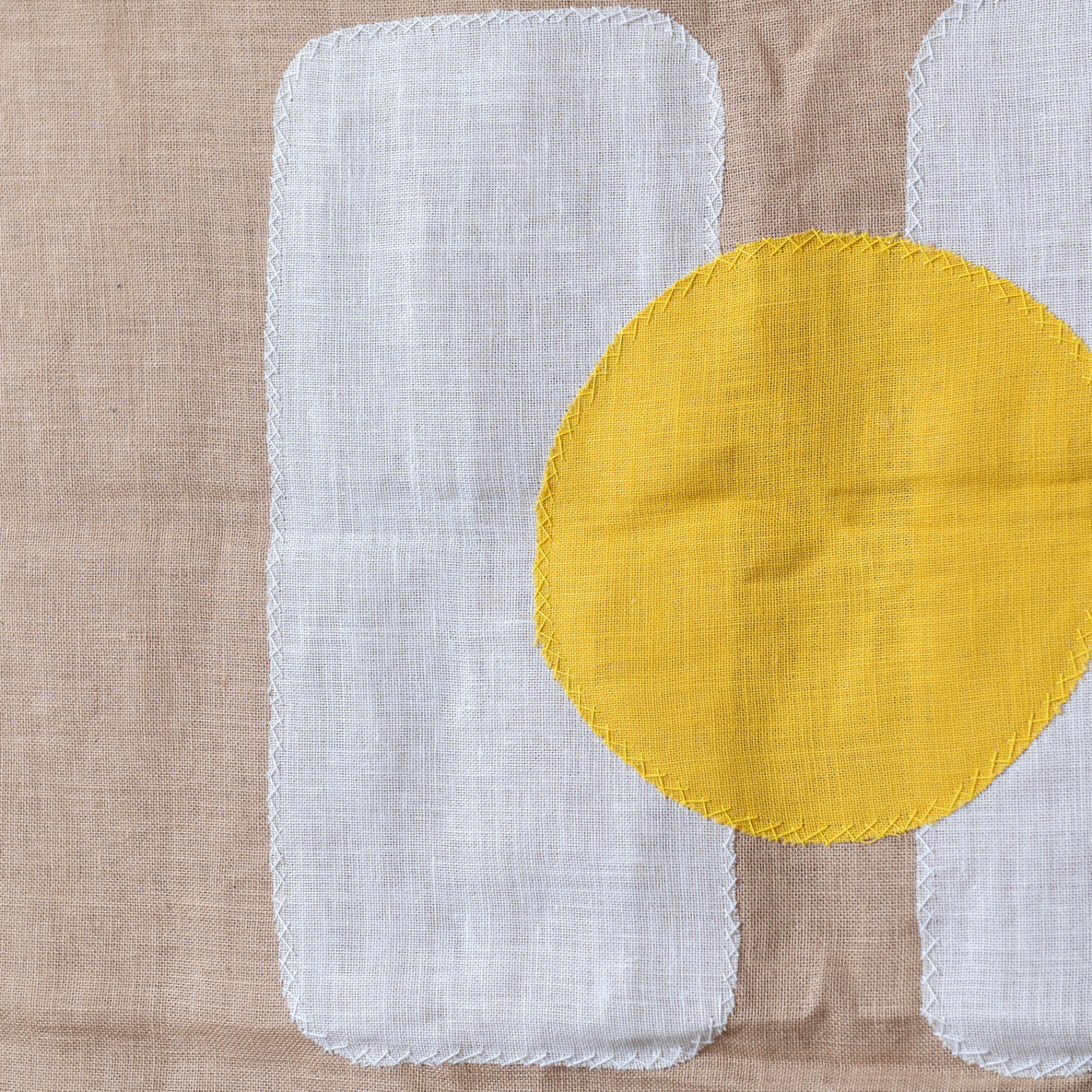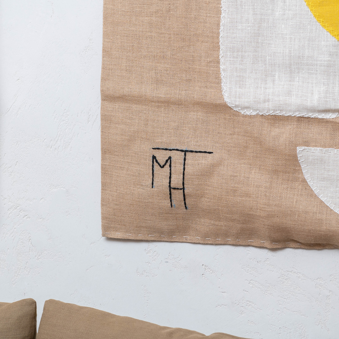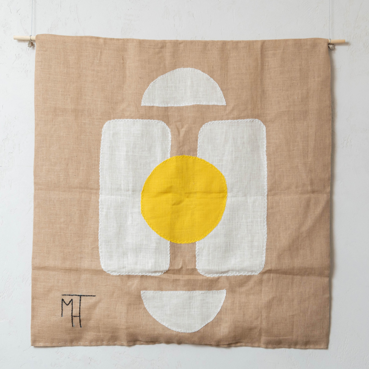 Tapiz tela natural motivos geométricos amarillo. Con un diseño minimalista pero lleno de encanto, con un fondo de tono beige oscuro, se destacan formas geométricas con dibujo amarillo brillante del centro que resalta como el sol. Las piezas blancas que rodean el amarillo crean sensación de suavidad y tranquilidad. Es una obra que transmite serenidad y modernidad a la vez, perfecta para un espacio lleno de calidez y estilo.