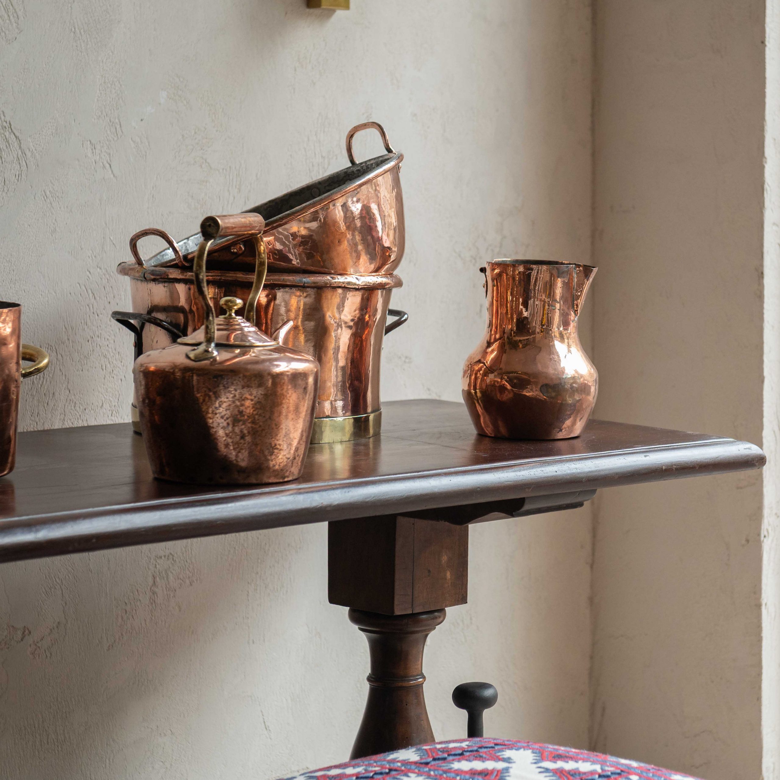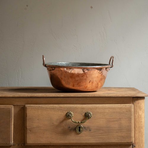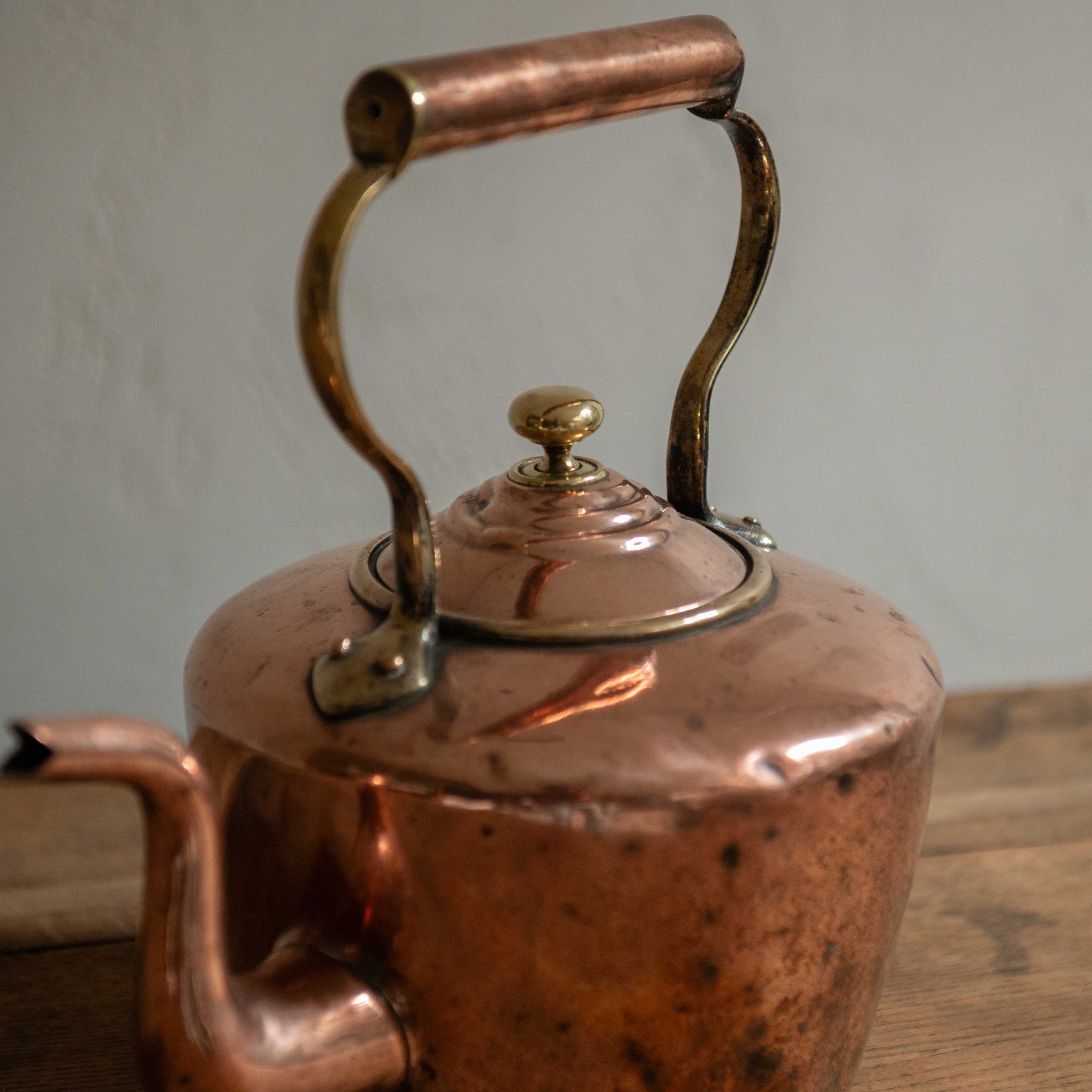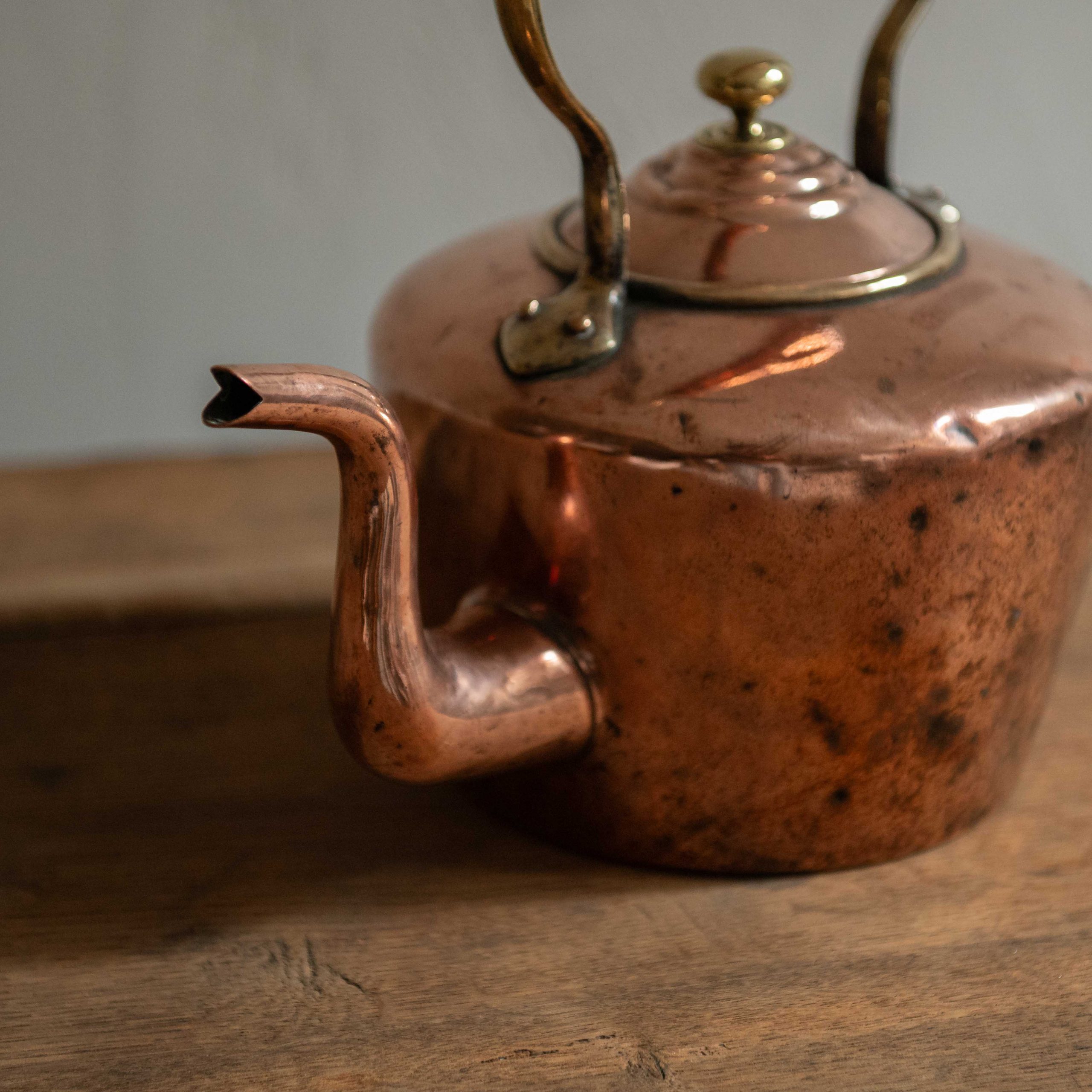 Tetera antigua de cobre. Una pieza delicada que aporta un aire íntimo y doméstico. Su bonita silueta redondeada evoca aromas cálidos y artesanía antigua.