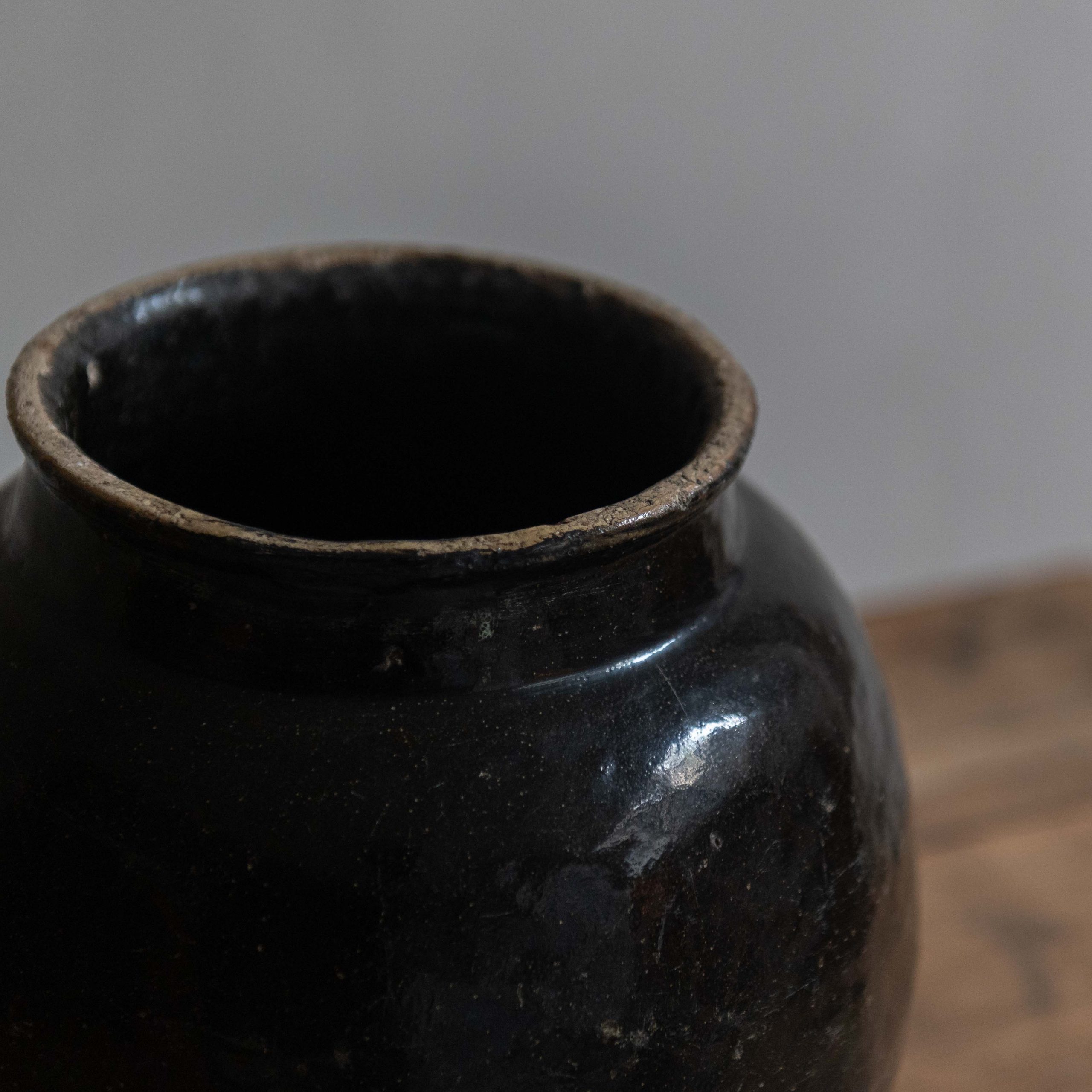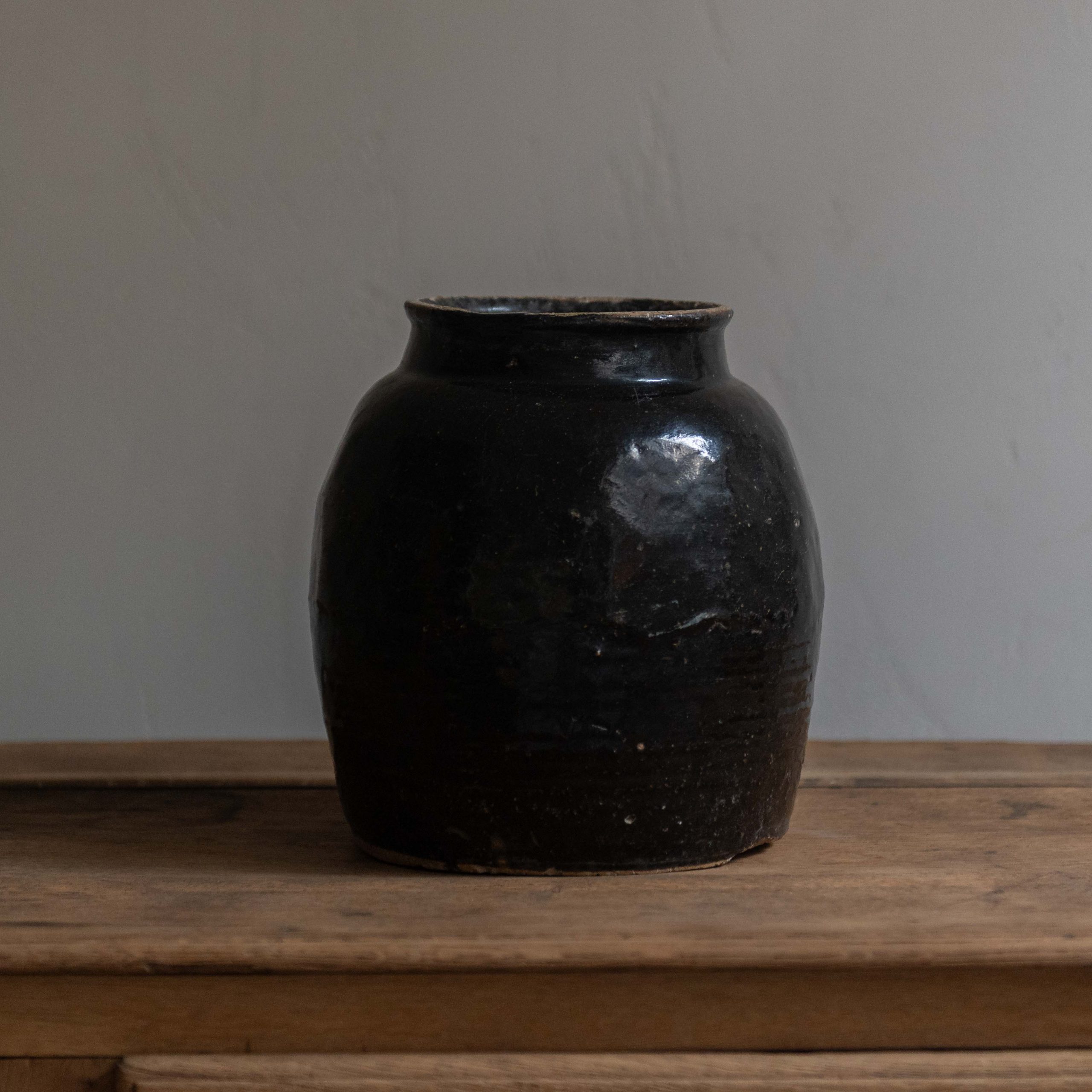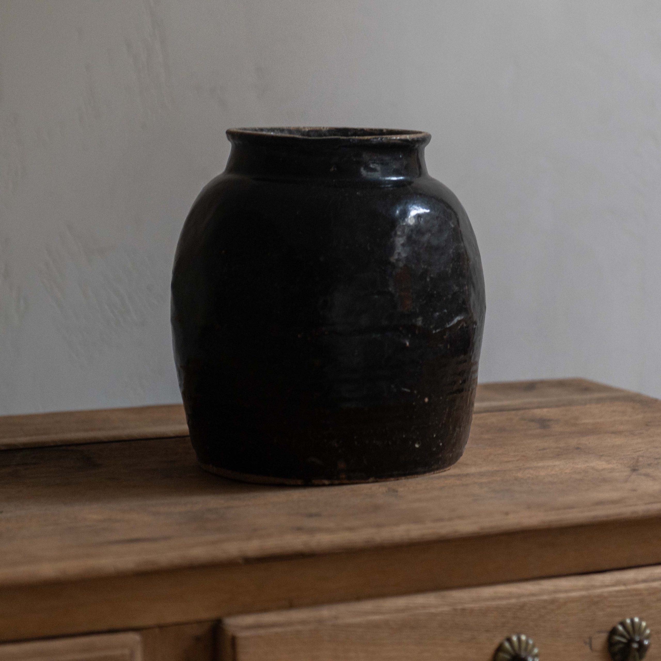 Vasija antigua de cerámica negra esmaltada. Con diferentes tamaños y acabados y de origen oriental, estas vasijas antiguas son en sí misma pequeños tesoros artesanales. Su contundente color negro y el paso de los años la convierten en un clásico atemporal.