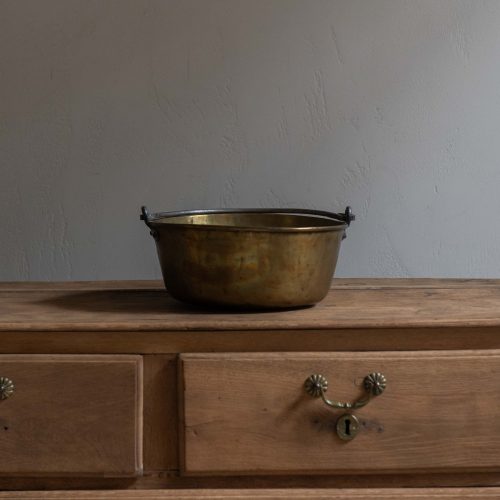 Caldero antiguo de latón con asa de hierro. Una pieza especial cuya superficie dorada, suavemente ondulada por el martillo y el paso del tiempo, refleja un brillo cálido y profundo, como si hubiese aprendido a convivir con el fuego. Su asa de hierro, oscura y firme, abraza el cuerpo del caldero con una elegancia austera, recordando su función práctica y su fortaleza cotidiana.